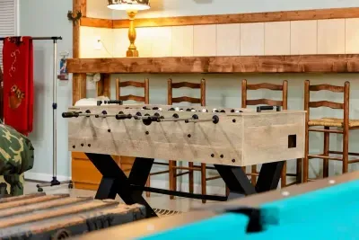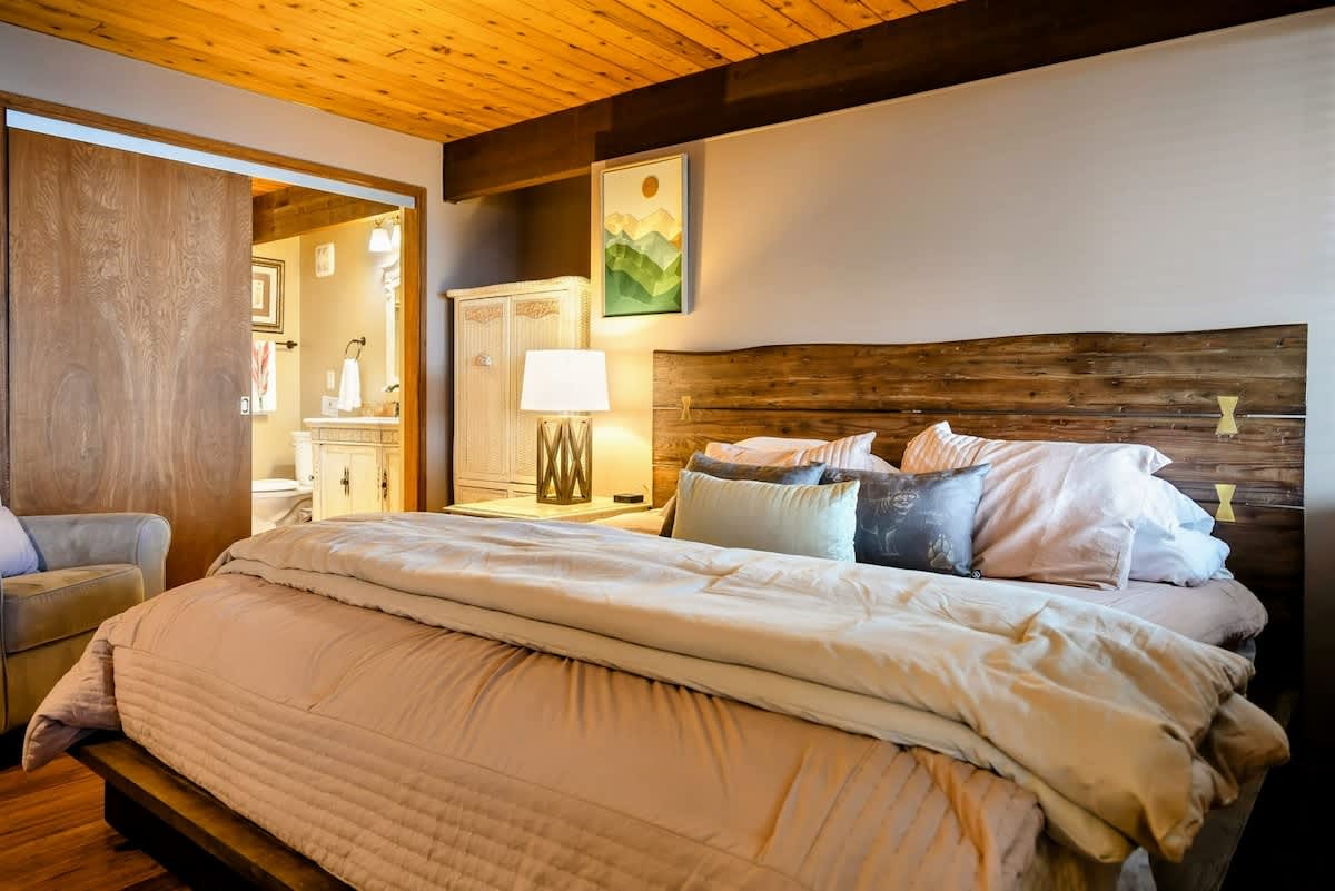 All Decked Out spans two levels. On the first floor, relax in a welcoming living area with comfortable furnishings, a fireplace, and a TV—ideal for unwinding. From here, step out onto the patio to enjoy the gas grill and outdoor space.