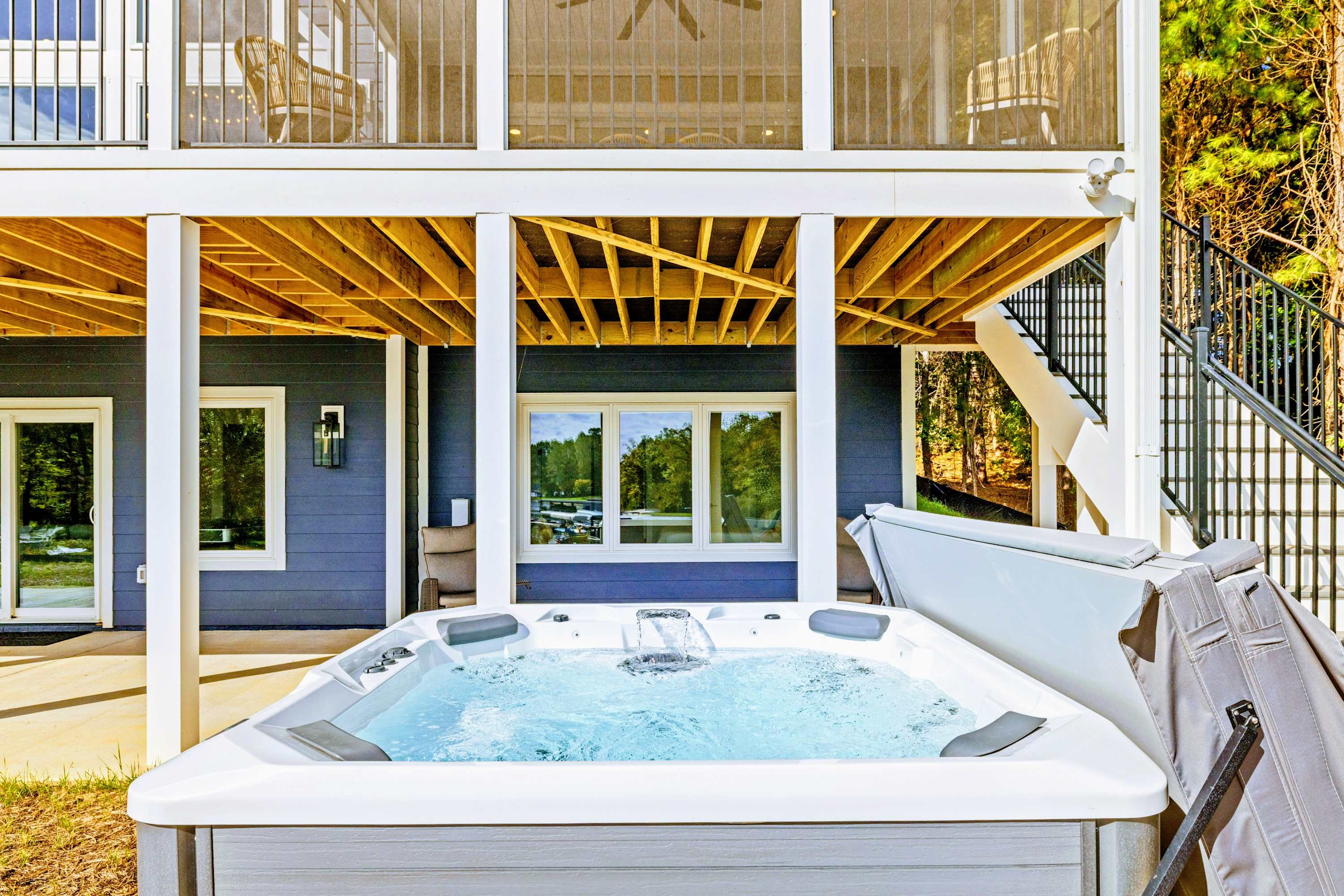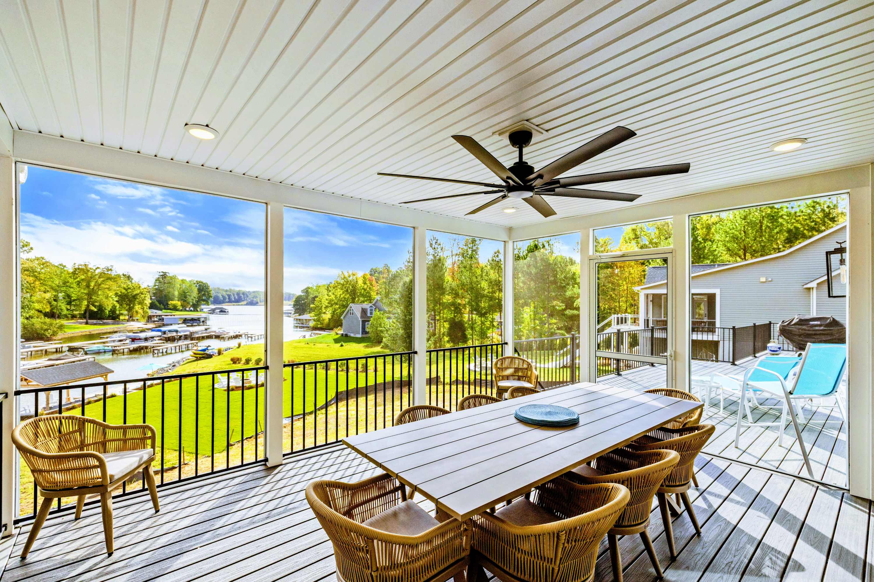 - Screened porch, entertainment deck, and 8-person hot tub overlooking the lake