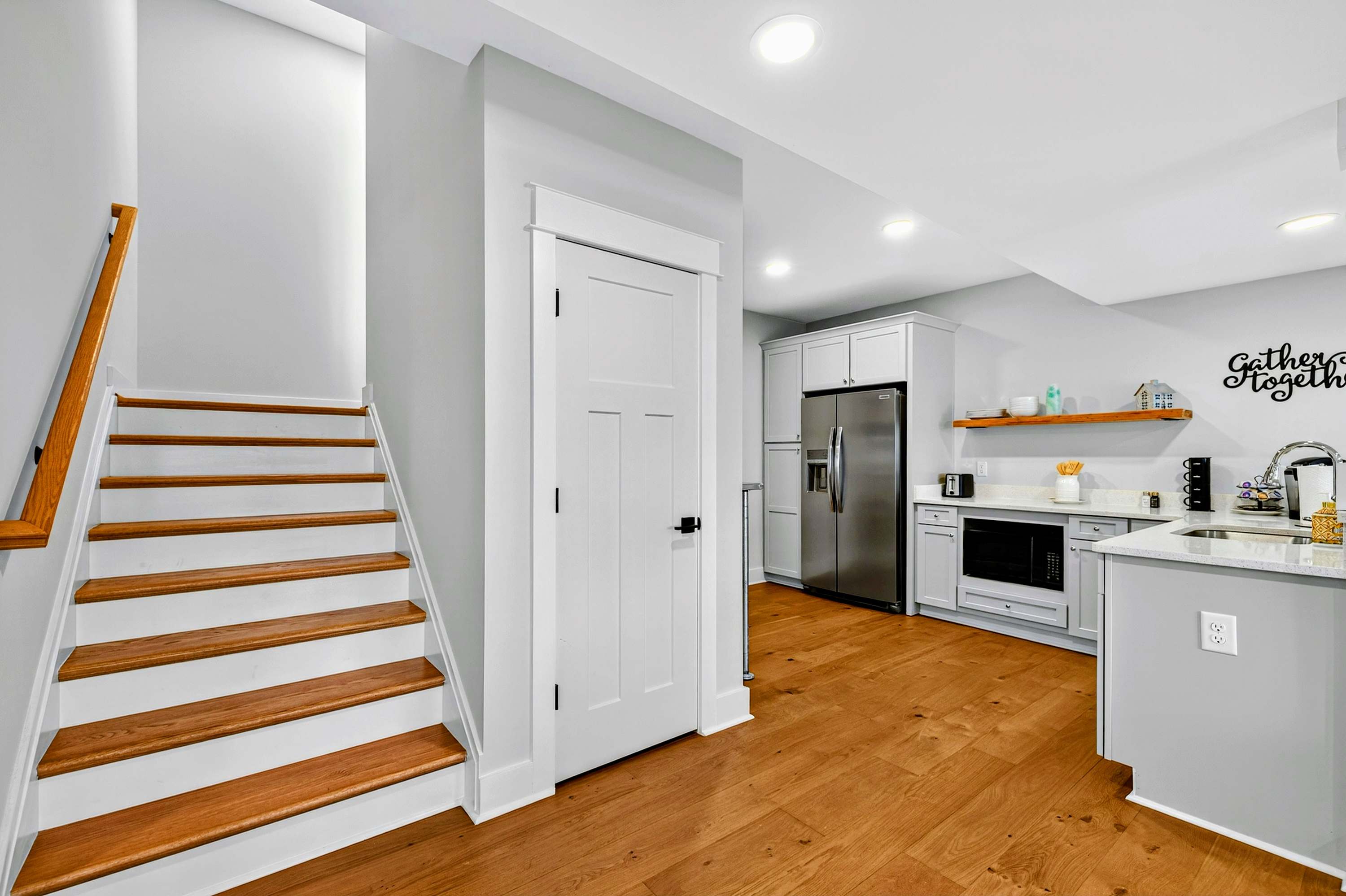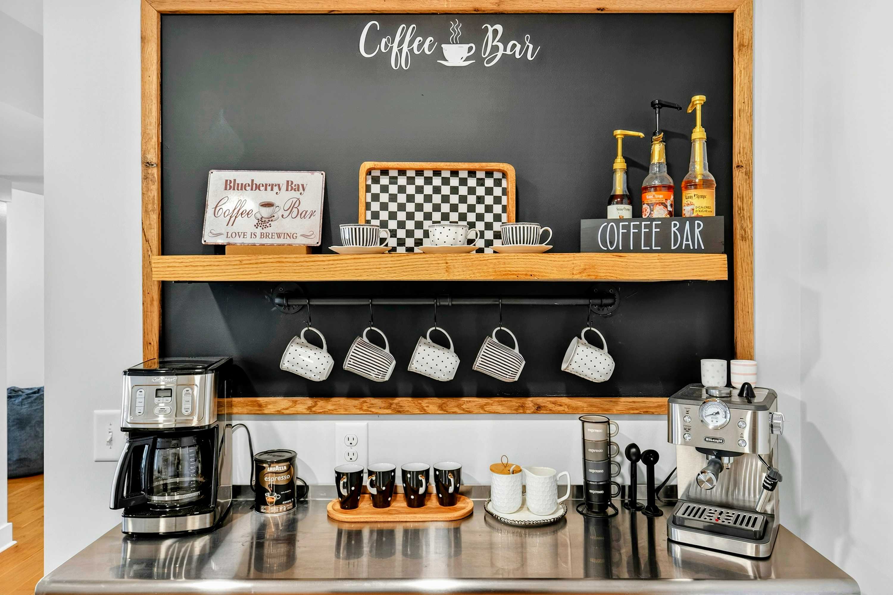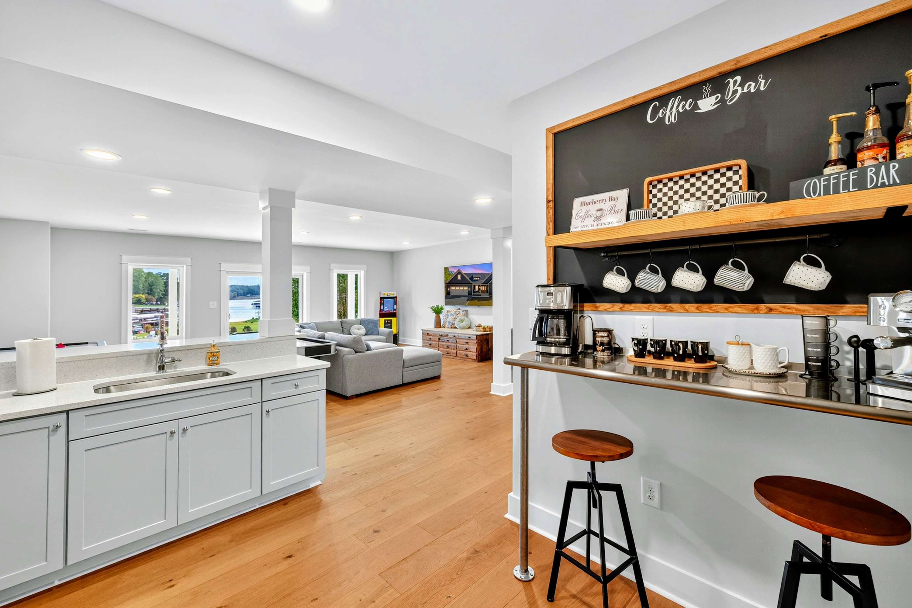 - Lower level second kitchen with coffee bar and bar seating