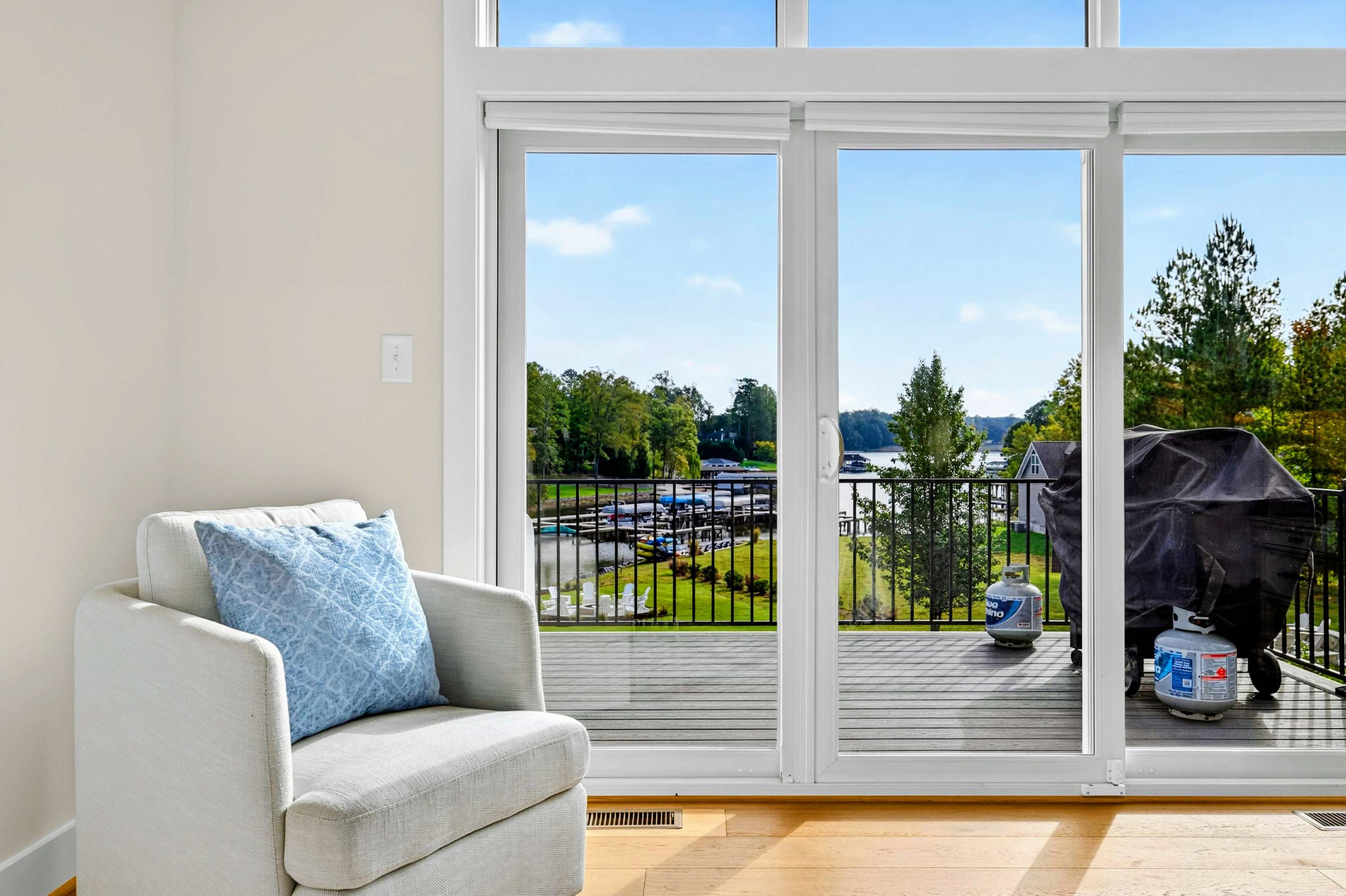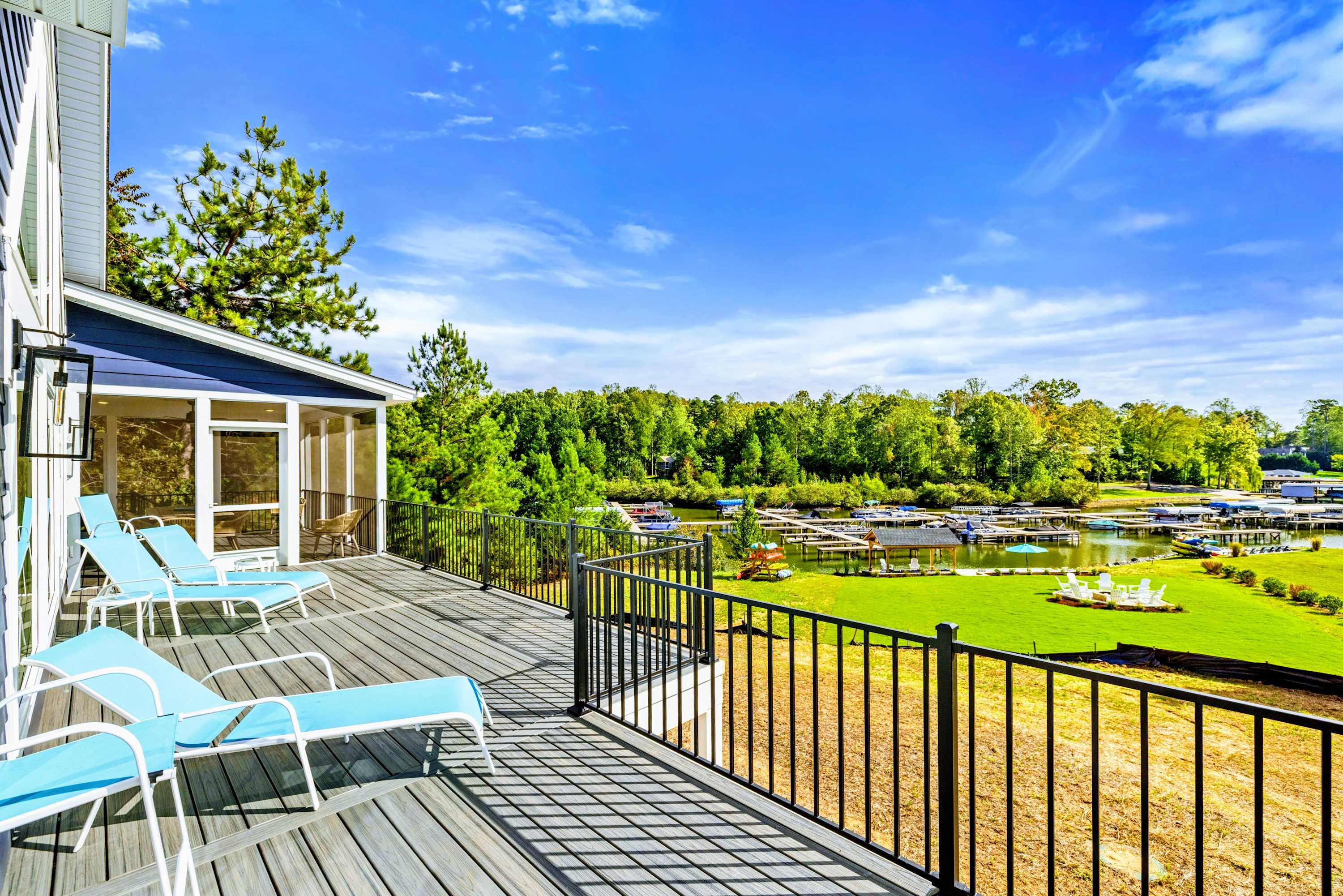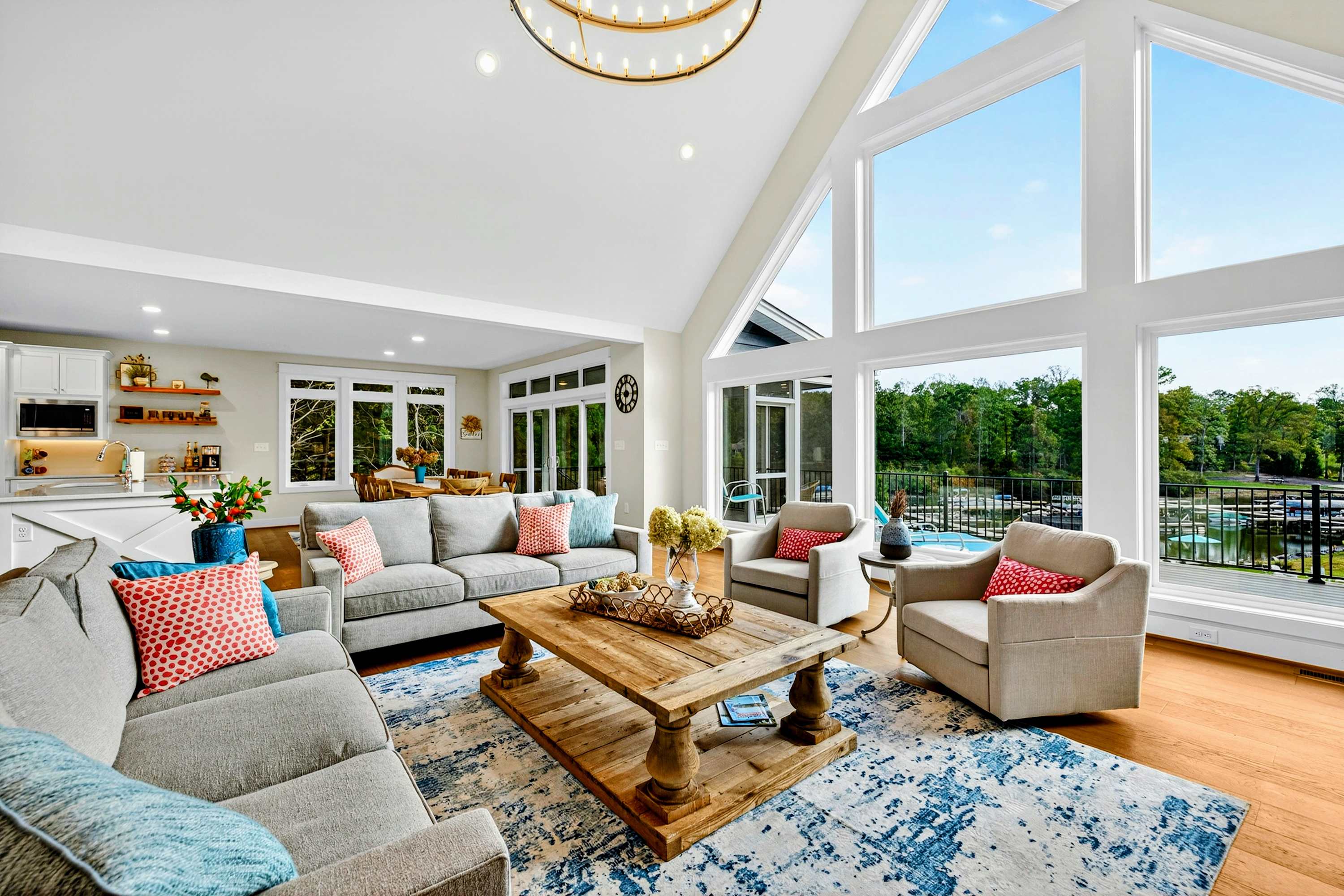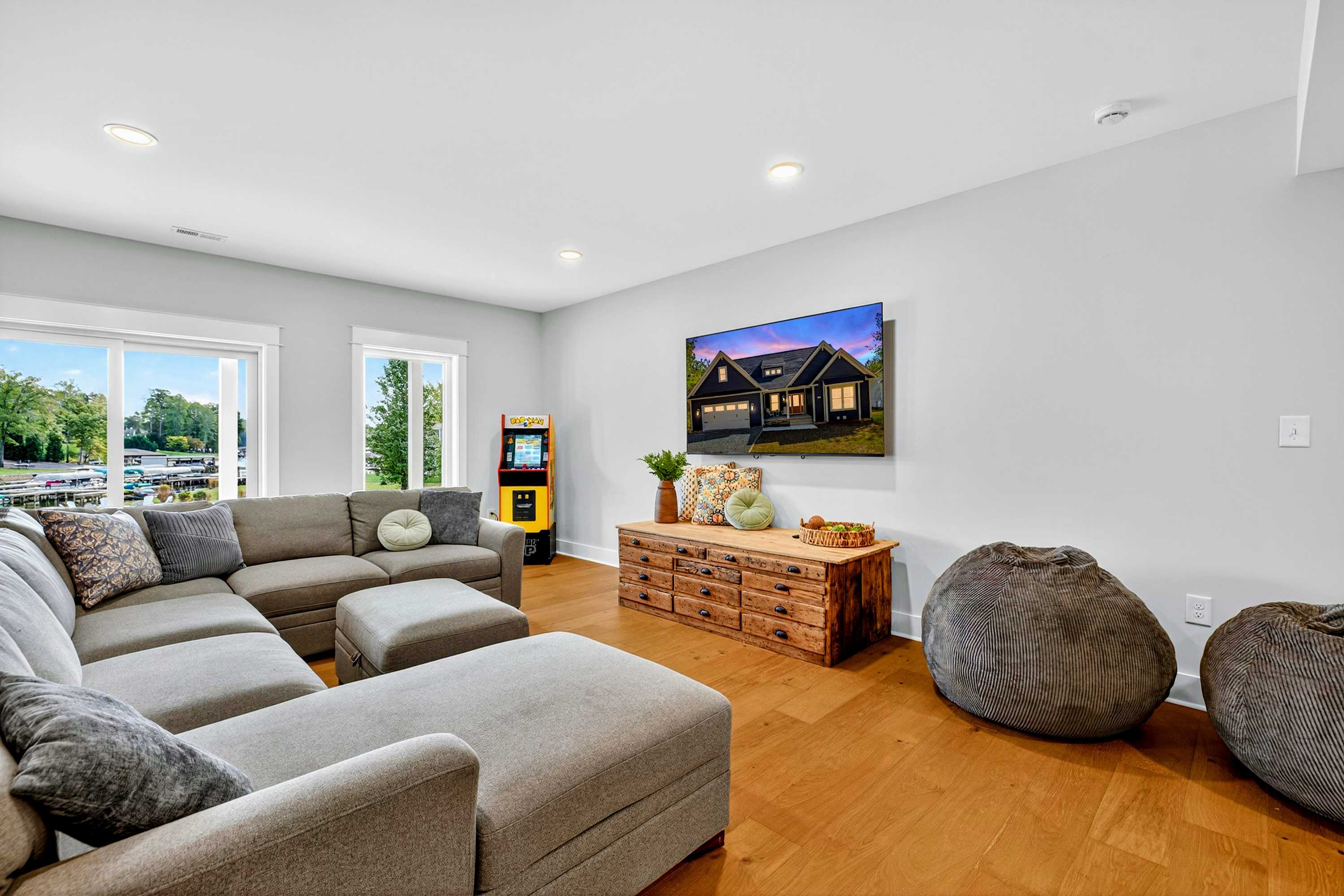 - Main level great room with lake and marina views, fireplace, and 75” Smart TV