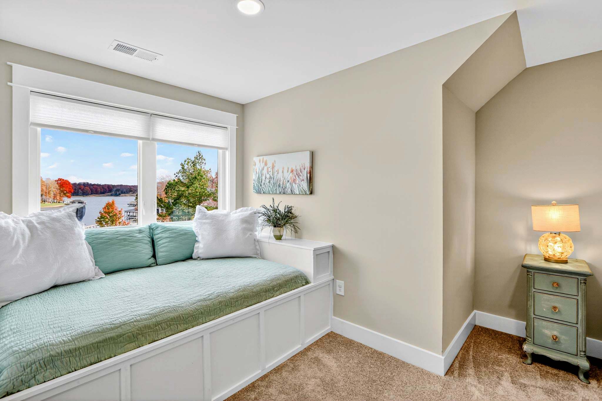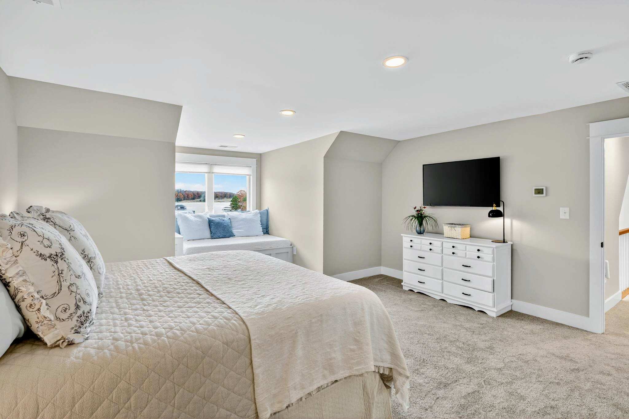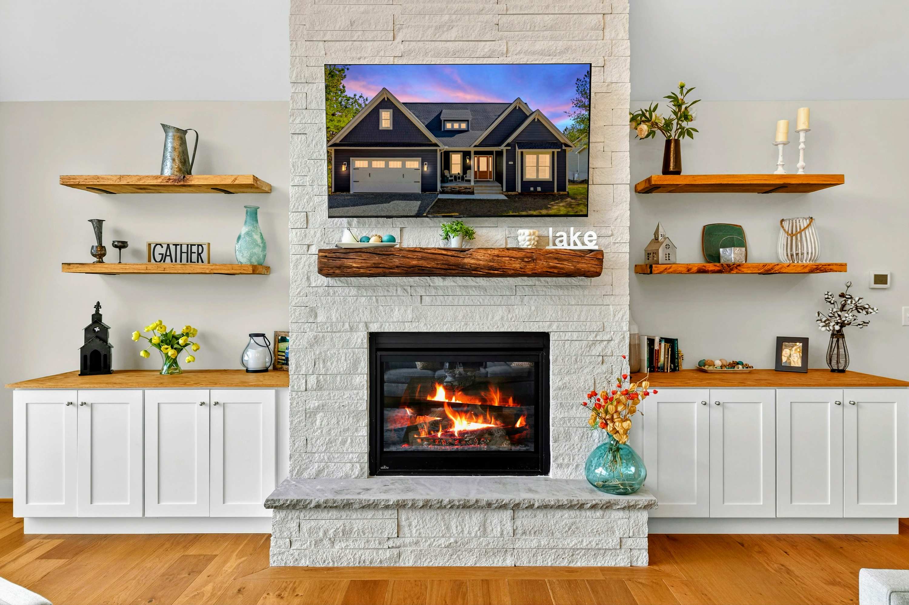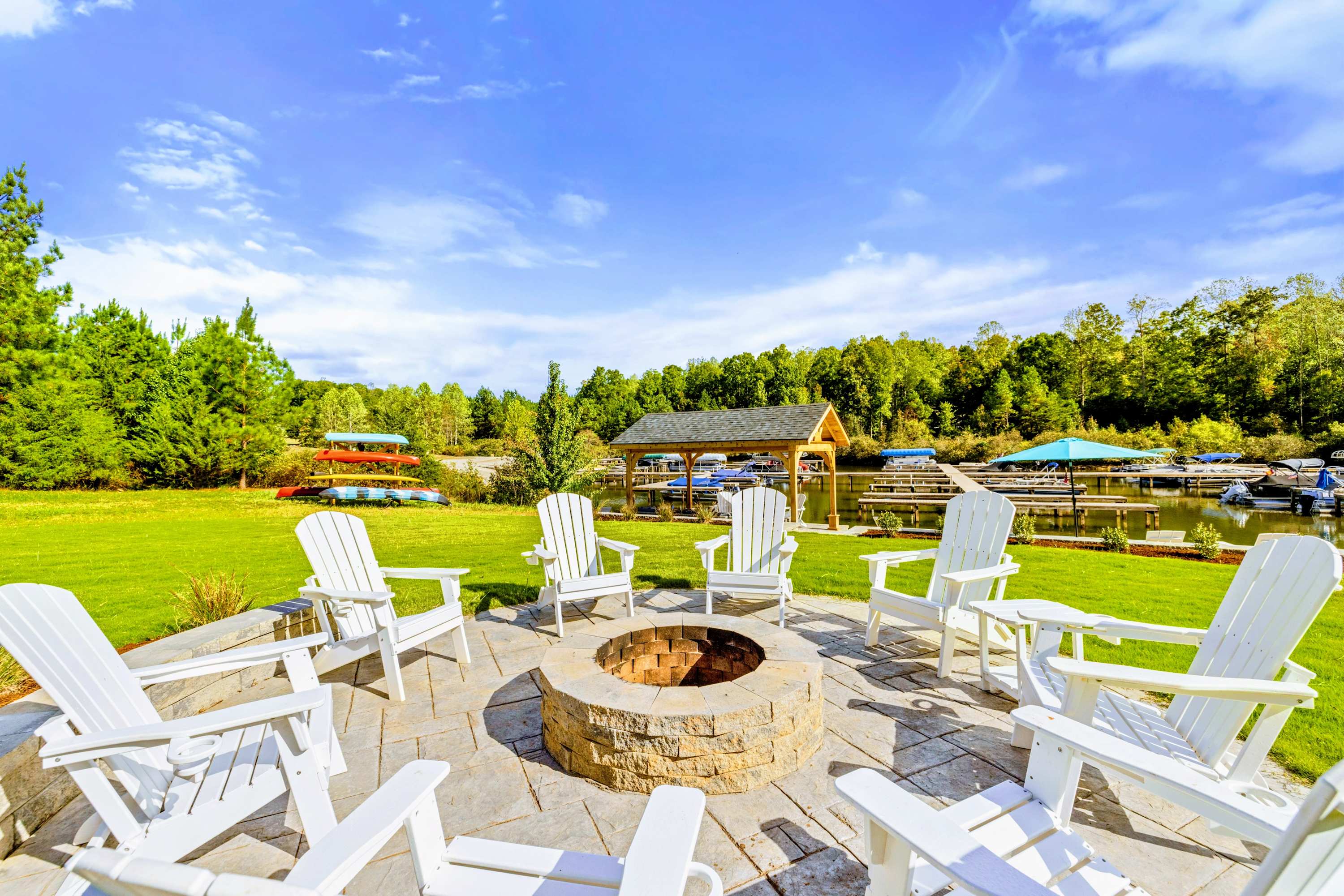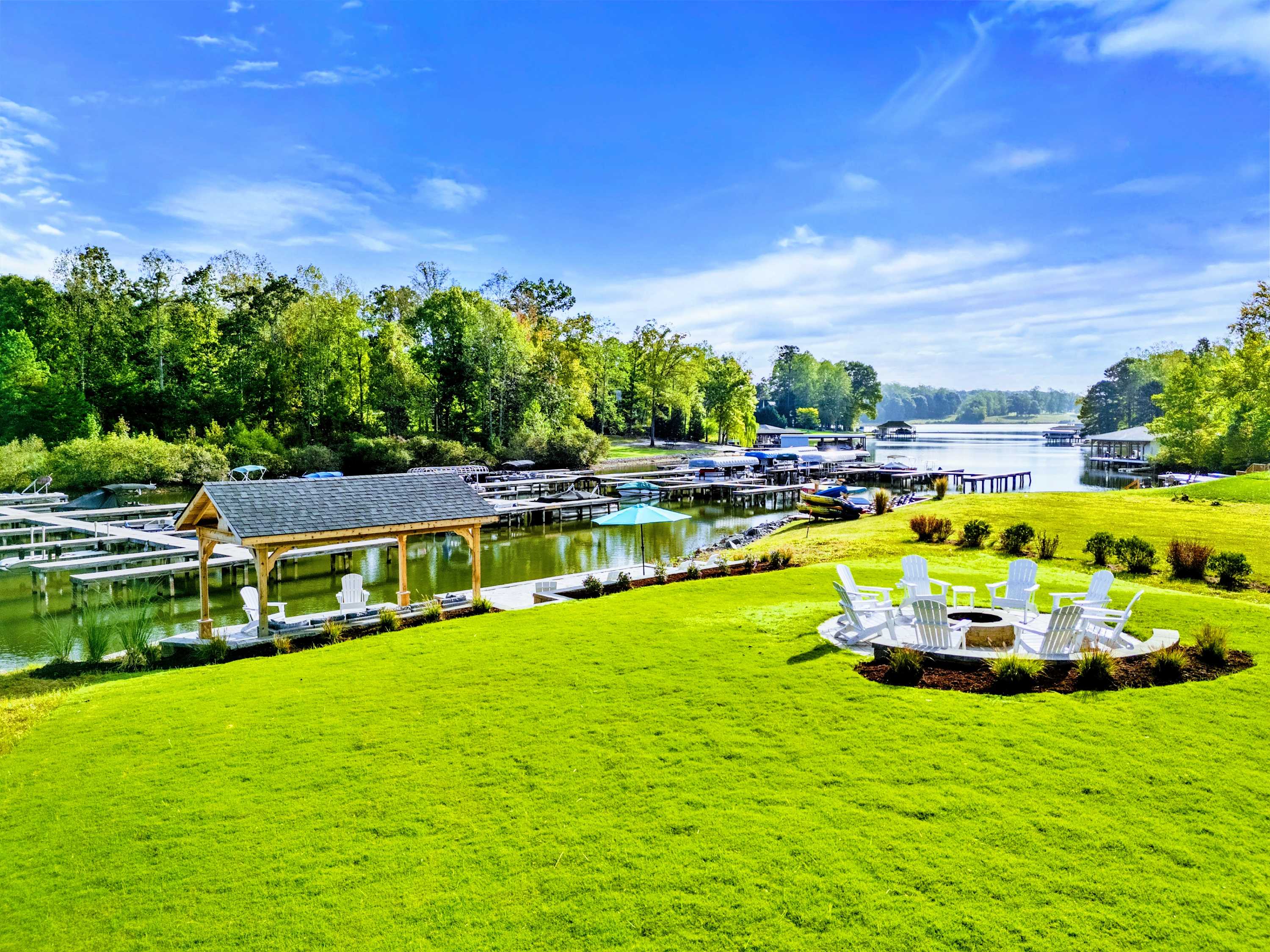 - Main level great room with lake and marina views, fireplace, and 75” Smart TV