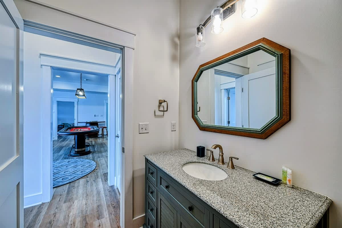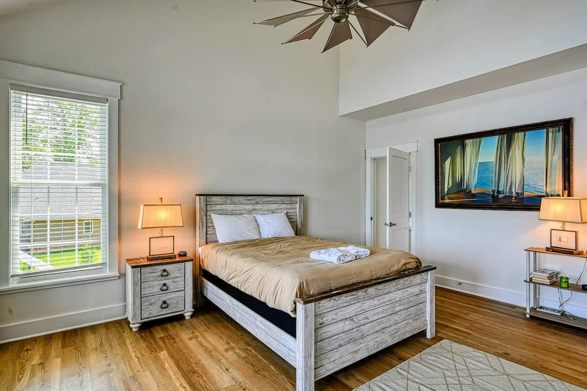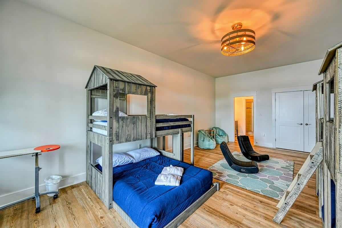 Enjoy lake views from all four bedrooms. The main-floor primary and guest bedrooms each include direct balcony access. The primary bedroom features a private en suite with a deep soaking tub, a shower with dual shower heads, and a walk-in closet. The lower-level primary and guest rooms each include direct patio access. The lower primary bedroom is furnished for younger guests with dual, fort-style bunk beds and a private en suite with an enclosed shower.