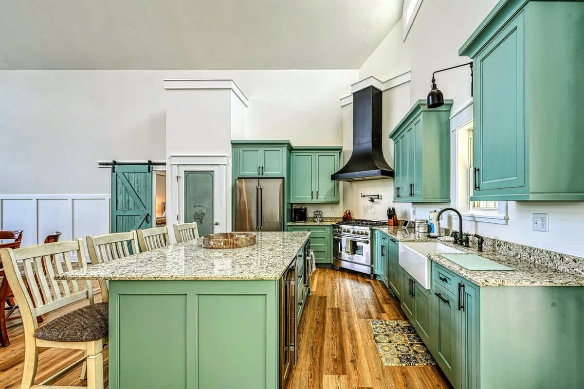 The gourmet island kitchen features gorgeous counters and a deluxe suite of stainless steel appliances, including a built-in wine cooler. The breakfast bar has seating for four, and the six-seater round table sets the stage for dinners and game nights. For a special treat, fire up the gas grill or throw something in the smoker for alfresco meals at the outdoor dining table set for six.