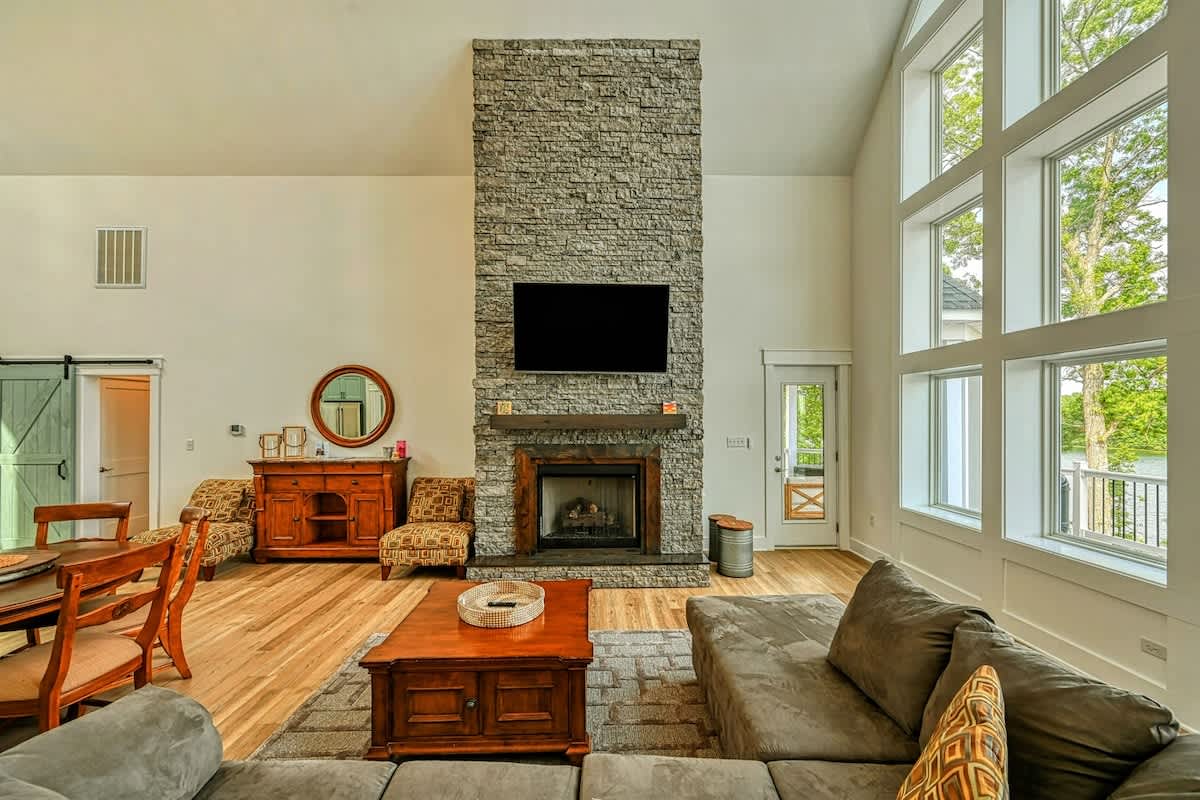 Welcome to Captain's Quarters! This stunning lakefront estate offers breathtaking Lake Anna views. Enjoy the 2-story, 2,700 sq ft dock with two boat slips, provided kayaks and paddleboards, and a fully furnished outdoor space featuring a patio, balcony, gas grill, smoker, firepit, and yard games. Inside, the great room boasts a 24-foot wall of windows. The game room includes a poker table, bowling game, foosball, and a wet bar. Four bedrooms offer lake views and direct balcony/patio access.