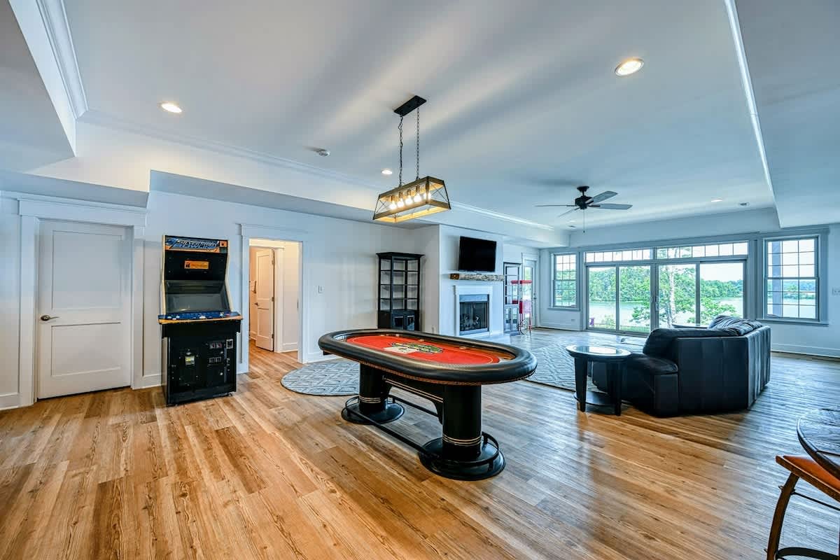 Highlighted by a 24-foot wall of windows overlooking the lake, the great room showcases a lofty, open layout for comfortable indoor gatherings with friends and family. Happy hour fun awaits in the lower level game room equipped with a deluxe poker table, Silver Strike Bowling video game, pub table, foosball table, and wet bar with a dedicated beverage fridge and ice maker. Stream your favorite shows on the smart TV in the great room, or whip up a gourmet batch of theater-quality popcorn using the kettle and settle in for a family movie night on the smart TV in the game room. A gas fireplace on each level adds a cozy ambience for evening get-togethers.