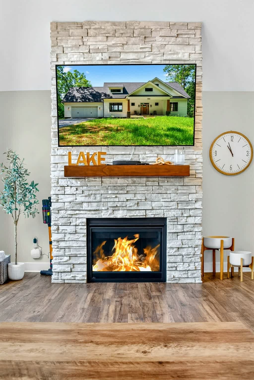 - Main level great room with lake views and stone fireplace