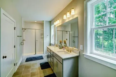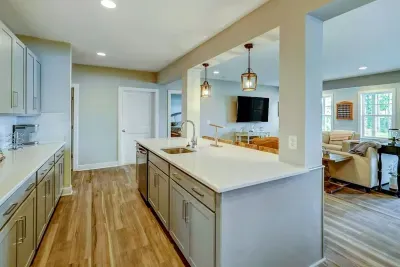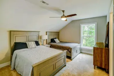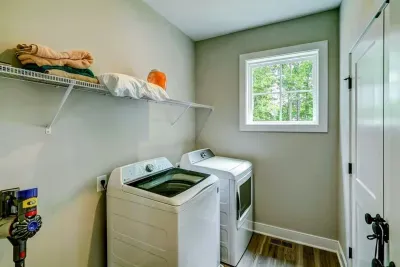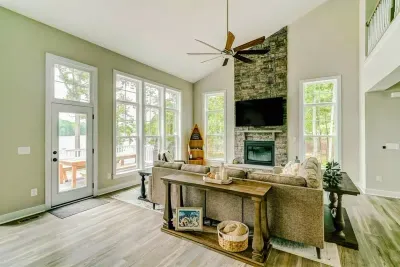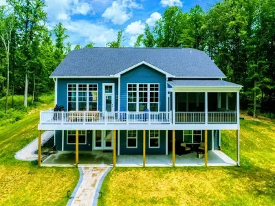 Experience comfort and luxury at our brand new modern and spacious lakefront home on the Private Side of Lake Anna. You will love the entire property including 250 feet of waterfront shoreline with a gently sloped naturally sandy bottom, warm freshwater, and a nearby quiet cove and private beach. We provide tons of water toys including 2 kayaks and 2 paddle boards. Roast some delicious s'mores outside using one of our outdoor fire pits, or have a BBQ using our Gas Grill on the deck. Enjoy the panoramic blue water views from atop of our massive deck with a screened in room. We have an open floor plan and offer 3 living areas including the main great room with a gas fireplace, a lower level game room with table shuffleboard, and golden tee arcade, and an open upper level loft area with family appropriate games. Relax in the spacious main great room with water views through the huge bright windows, a gas fireplace, and 4K Smart TV. Use the High Speed Internet and free Wi-Fi network to stream your favorite shows while you FaceTime everyone! The home has 5 full bedrooms, and 4 full bathrooms. The main floor has an open floor plan with a great room and adjacent large kitchen, pantry, primary suite (King bed), second bedroom (Queen bed), and laundry room. The lower level has the game room, home theater room, and secondary suite (King bed). The upper level has a spacious loft area, and 2 additional bedrooms including Jack (Two Double beds) & Jill (Double bed + Double / Twin Bunk) style bedrooms with a shared full bath in between them.