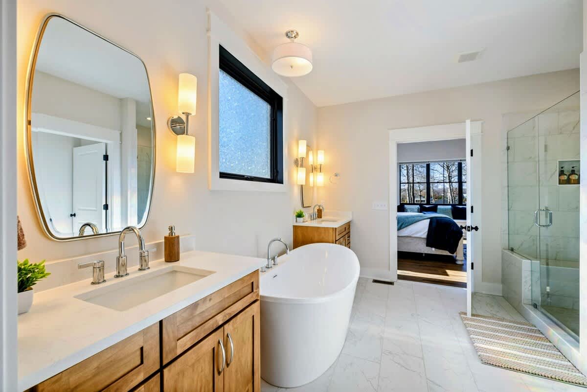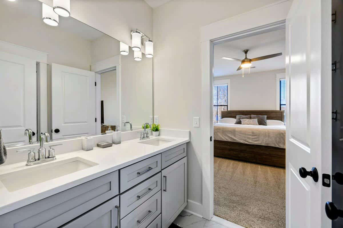 - Bedroom 4 - King Bed with Lake View, TV, and Shared Jack and Jill Style Ensuite Bathroom with Double Vanity and Combination Tub/Shower
