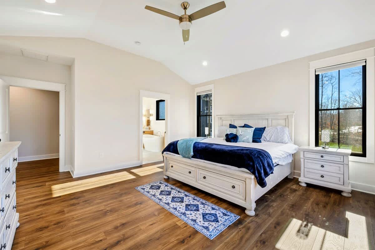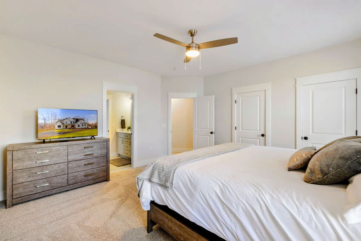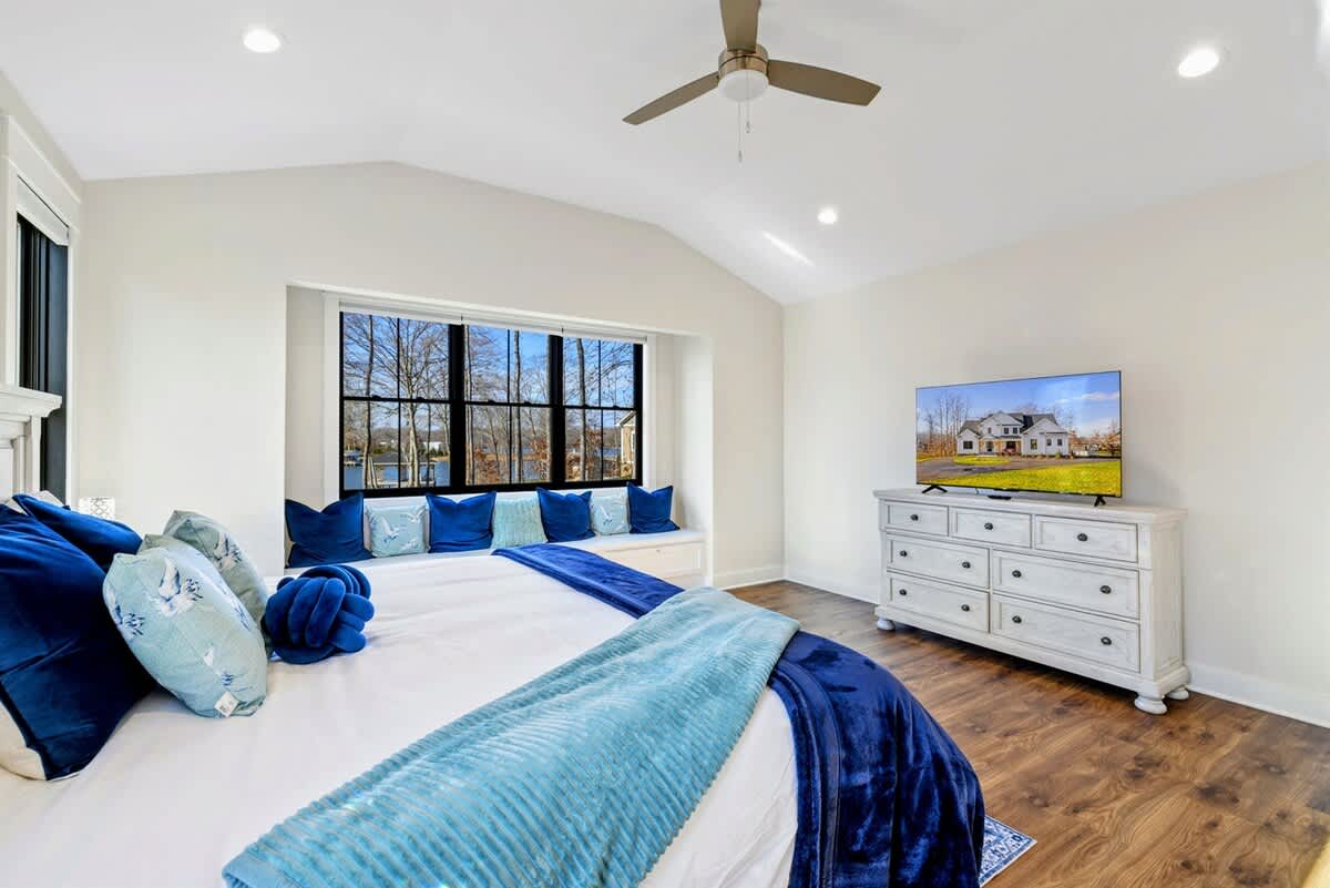 - Bedroom 1 - King Bed Primary Suite with Lake View, TV, and Private Ensuite Bathroom with Tub & Shower