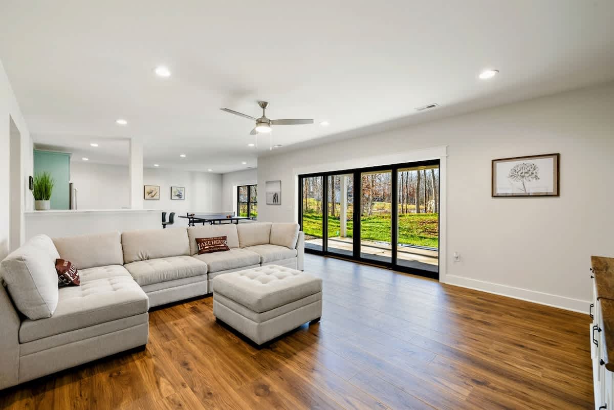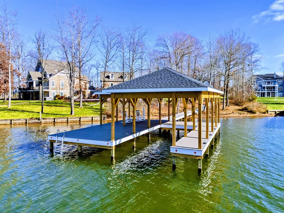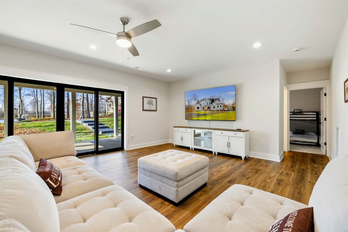 Dreams Come True is a brand new luxurious lakefront home on the Private Side of Lake Anna. Enjoy a serene waterfront lot, quiet cove, warm freshwater, and private dock and boat house with a covered boat slip and lounge area. Take in the gorgeous lake views while relaxing beside an outdoor fire pit, or on the large furnished deck or screened in area with outdoor dining options. Kick back in a comfy sofa in our Home Movie Theater or play ping pong, cornhole, or various indoor and outdoor games!