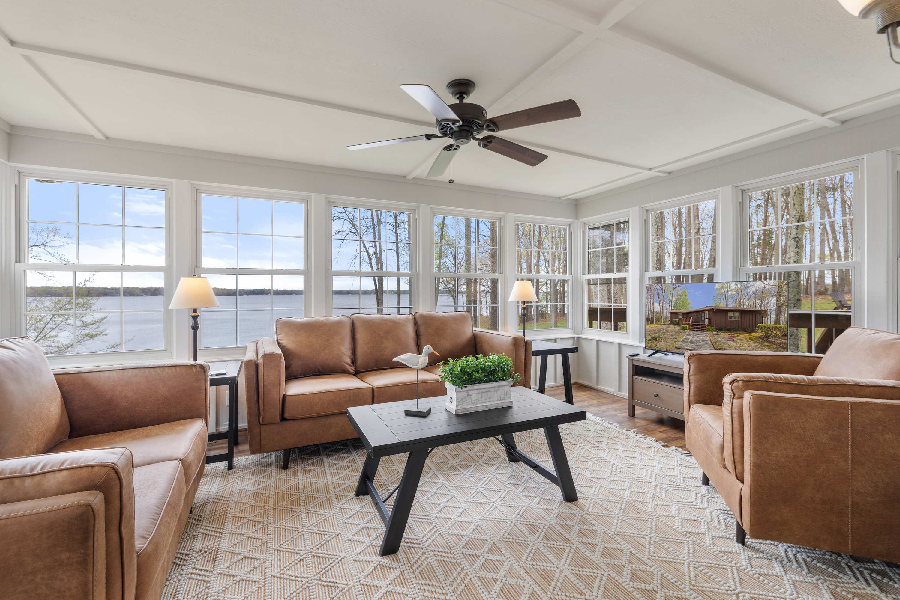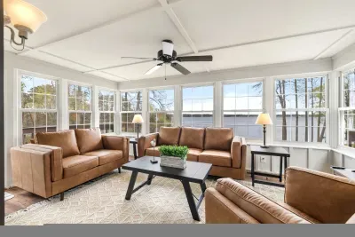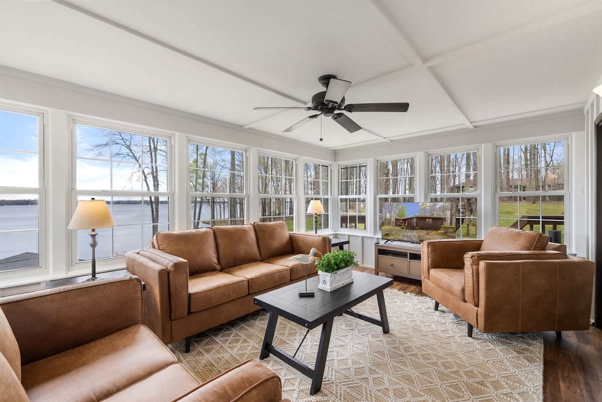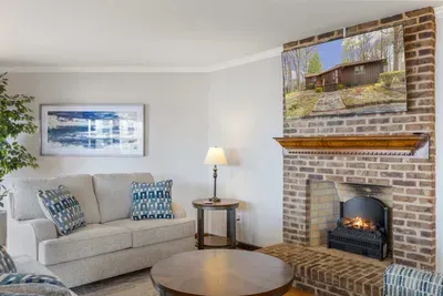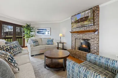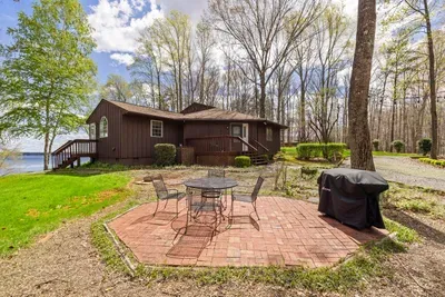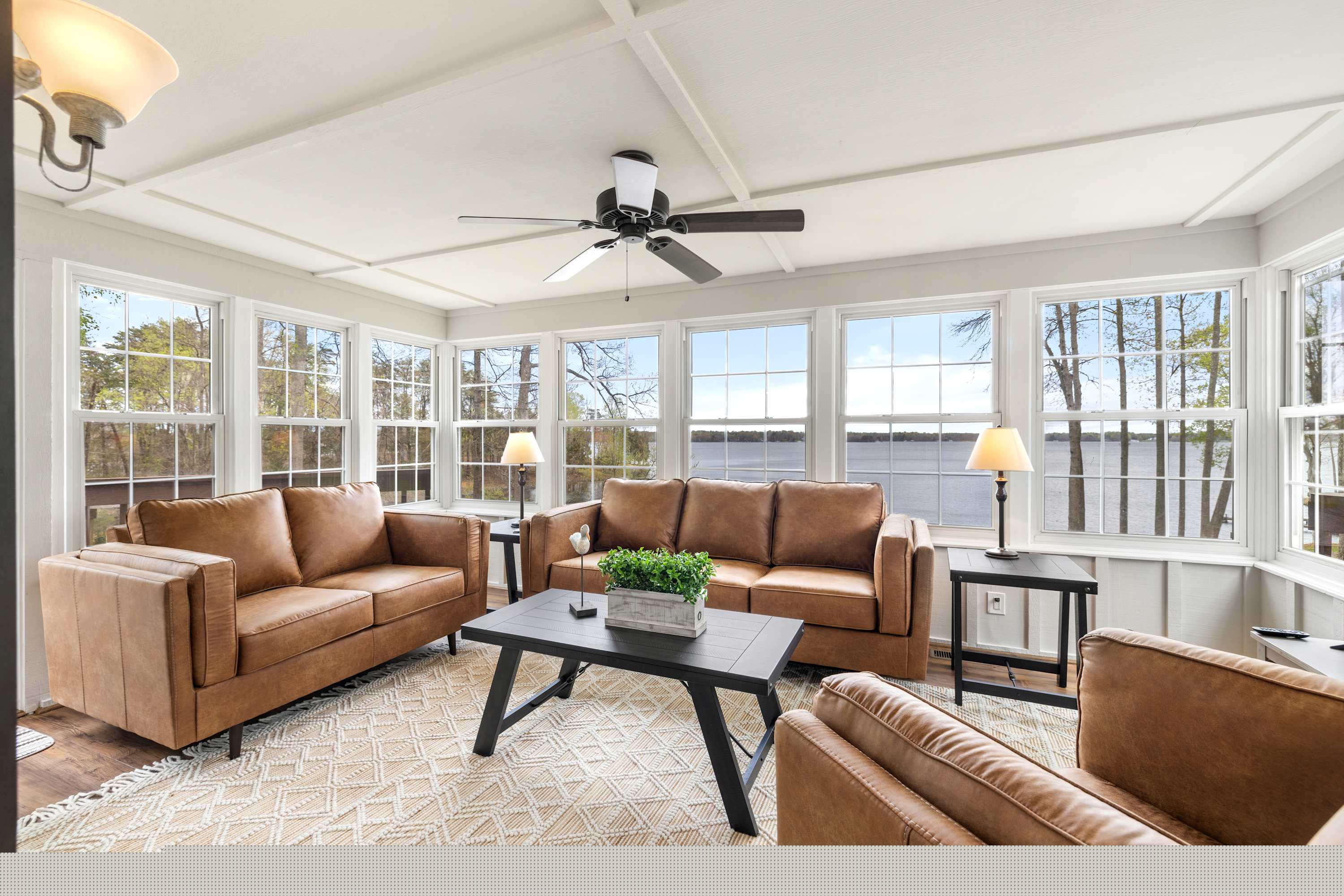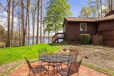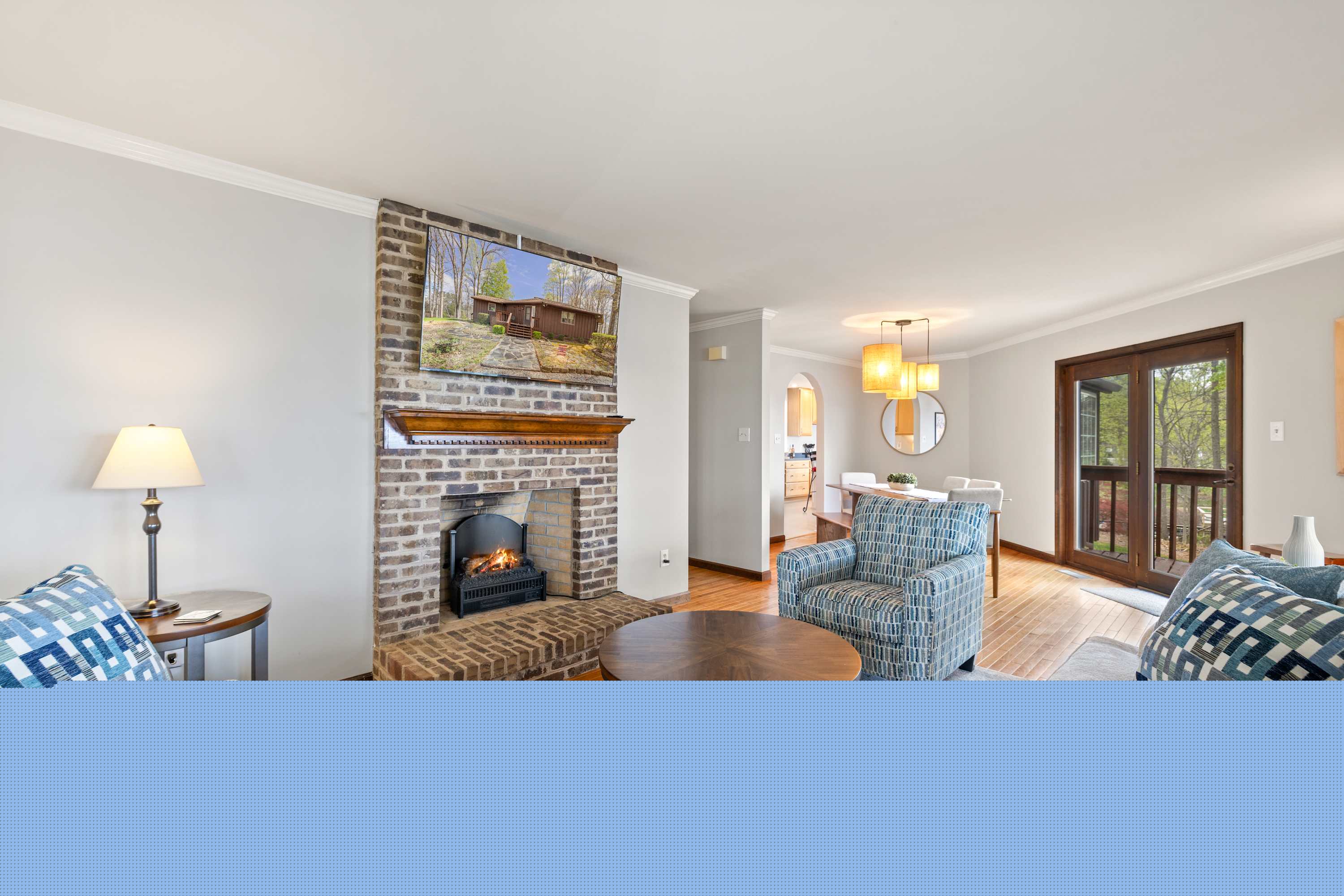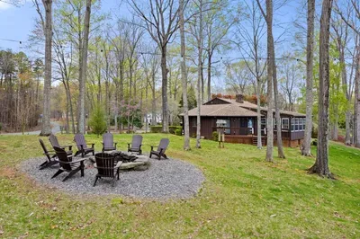 Inside, the home features over 2,000 square feet of living space, including 3 bedrooms and 2 full baths, all with stunning lake views. The family room, with its brick wood-burning fireplace, opens to the dining area and a cozy sunroom—perfect for unwinding with a book or enjoying TV while overlooking the lake. The spacious kitchen includes a bay window, plenty of countertop space, and a center island. Use the High Speed Internet and free Wi-Fi network to stream your favorite shows while you FaceTime everyone! The lakeside primary bedroom suite offers his and her closets, a large vanity, a tiled shower, and direct access to the deck. After a day on the water, gather around the fire pit to roast s'mores with family and friends.