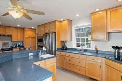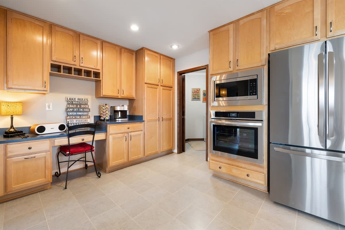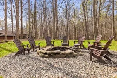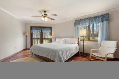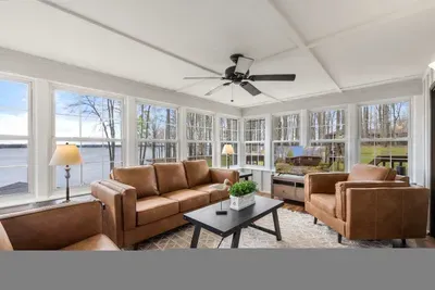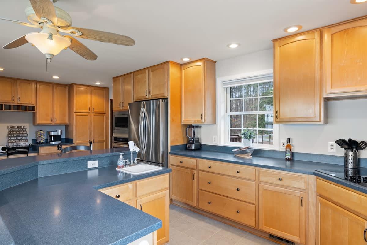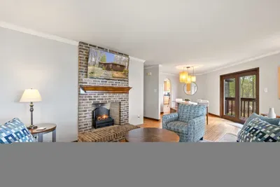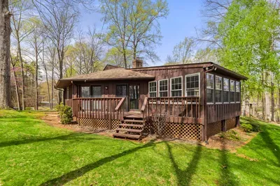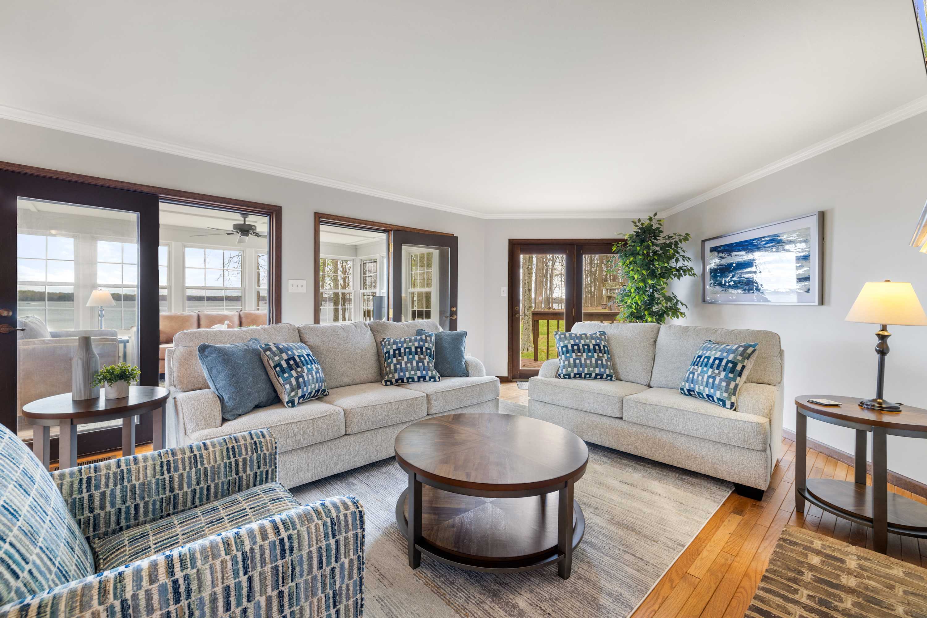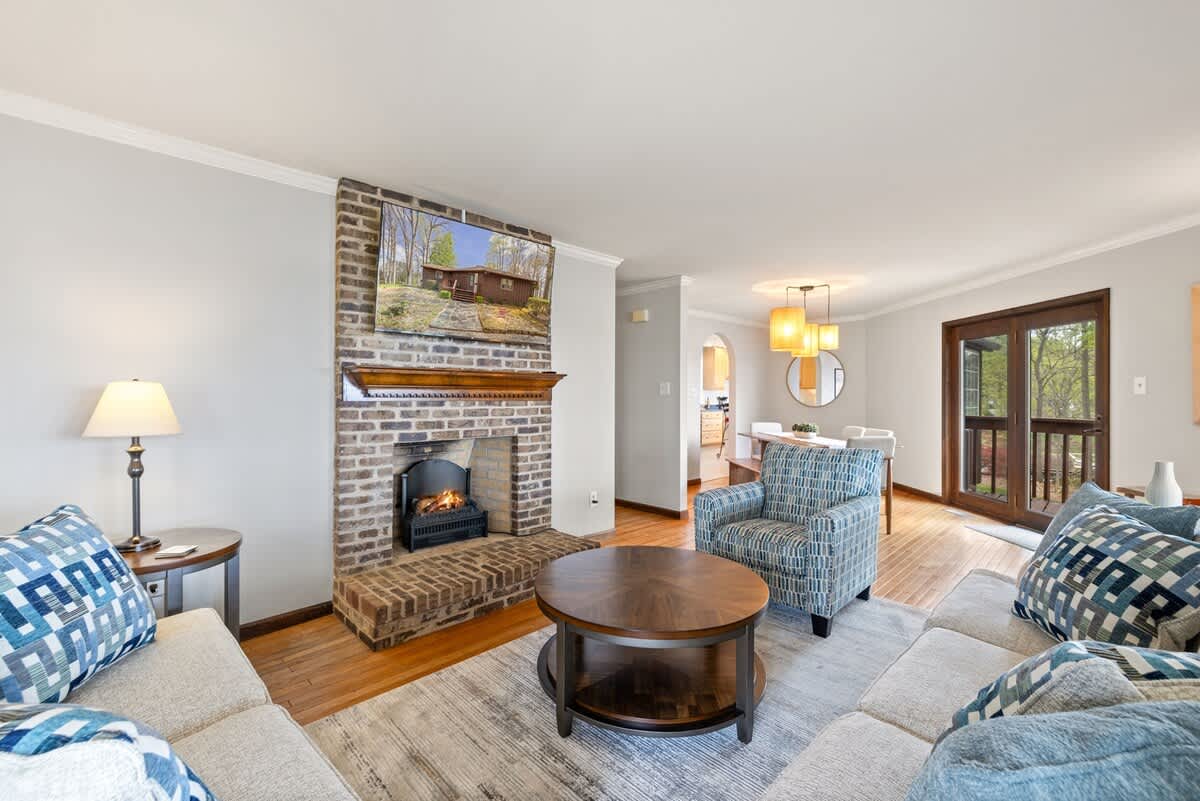 Inside, the home features over 2,000 square feet of living space, including 3 bedrooms and 2 full baths, all with stunning lake views. The family room, with its brick wood-burning fireplace, opens to the dining area and a cozy sunroom—perfect for unwinding with a book or enjoying TV while overlooking the lake. The spacious kitchen includes a bay window, plenty of countertop space, and a center island. Use the High Speed Internet and free Wi-Fi network to stream your favorite shows while you FaceTime everyone! The lakeside primary bedroom suite offers his and her closets, a large vanity, a tiled shower, and direct access to the deck. After a day on the water, gather around the fire pit to roast s'mores with family and friends.