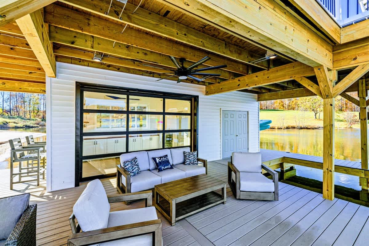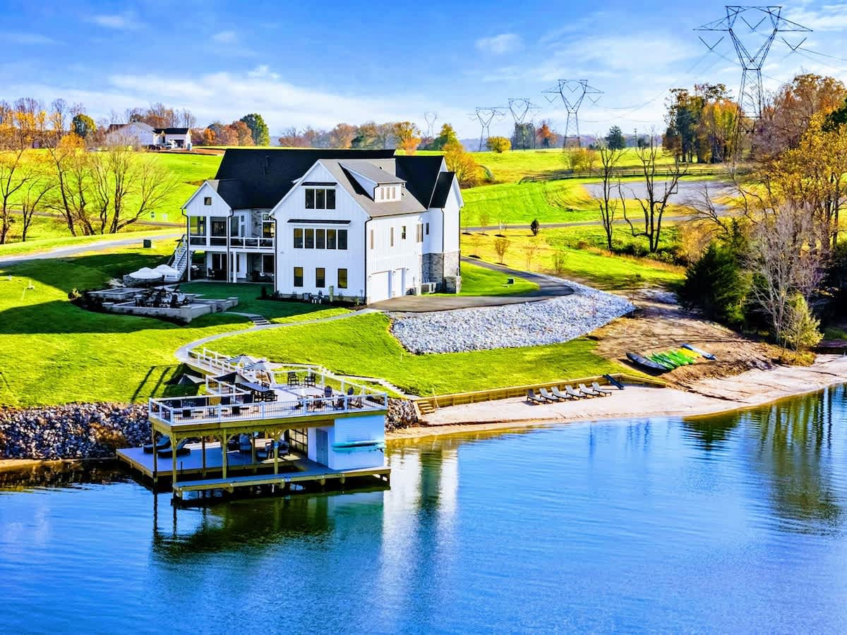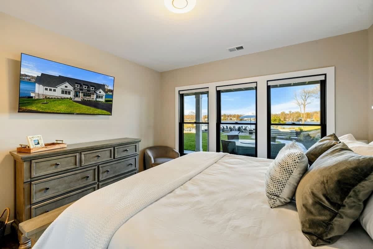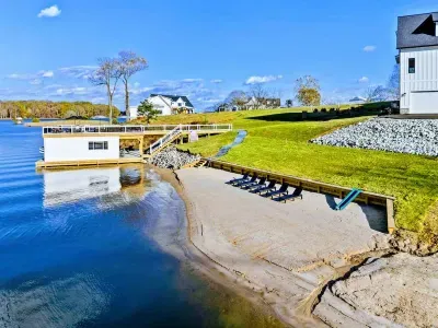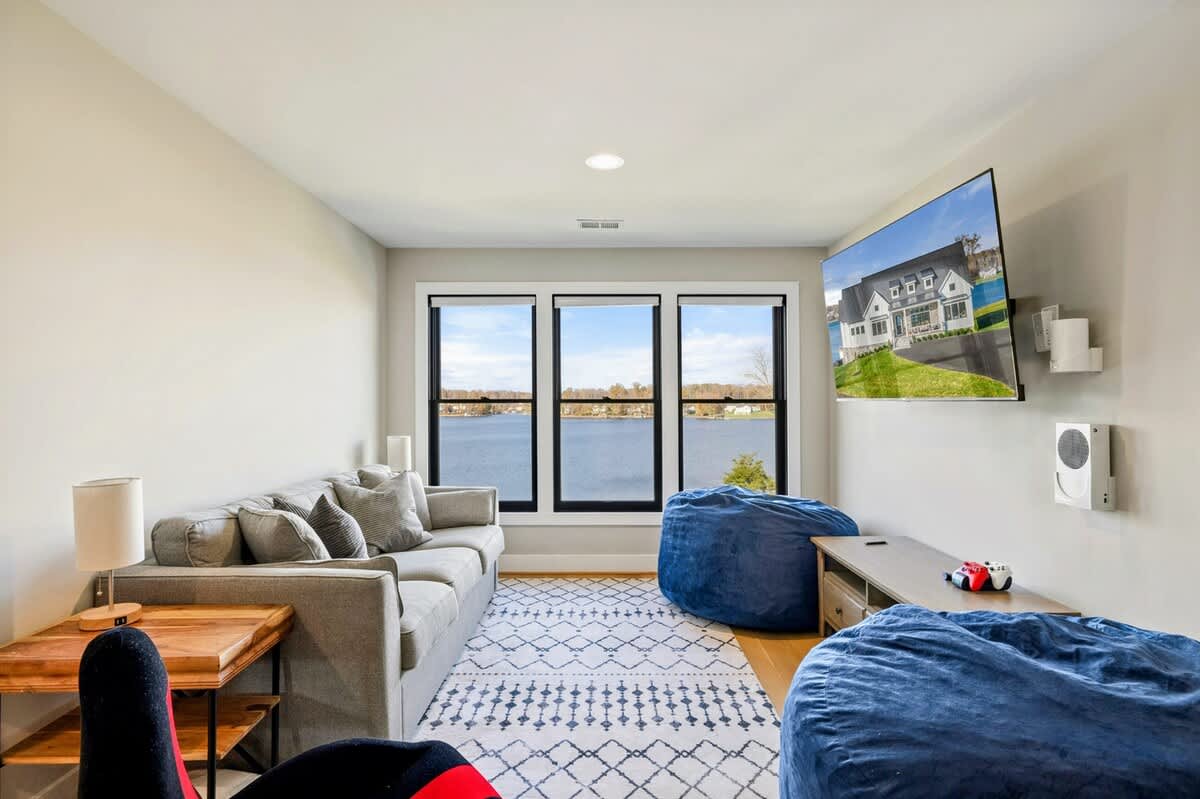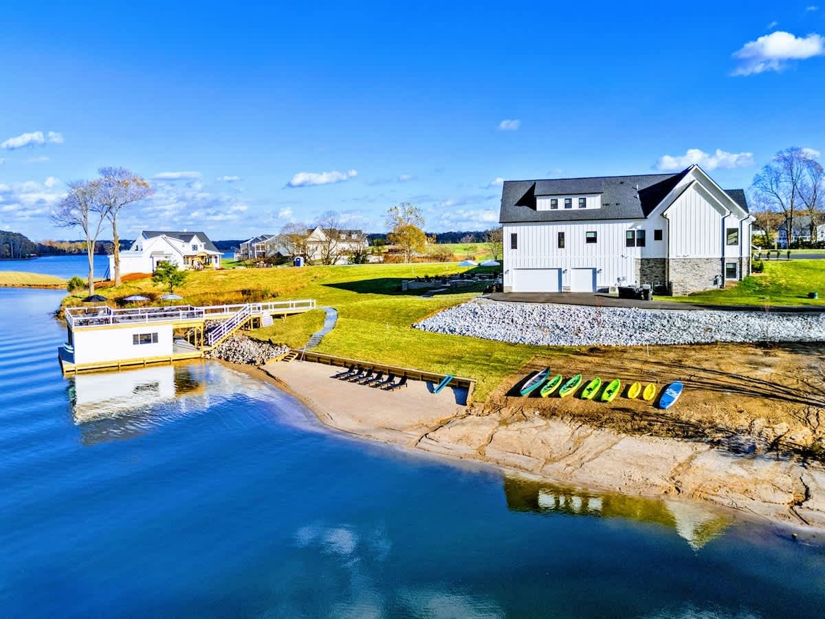 Experience comfort and luxury at our brand new modern and spacious lakefront home on the Private Side of Lake Anna. Enjoy the blue water lake views from the large boat dock and boat house, while relaxing in the Plunge Pool / Hot Tub, atop of our deck, or from the comfort of inside the home through many of the large windows. You will love the entire property including the waterfront shoreline with a gently sloped naturally sandy bottom, private beach, and warm freshwater. We provide lots of water toys including kayaks, paddle boards, and a canoe. Roast some delicious s'mores outside using our outdoor fire pit, and have a BBQ using our outdoor gas grills on the deck and patio. Some of our outdoor yard games include cornhole, volleyball, horseshoes, bocce ball, and more. Inside, this expansive home has plenty of space for everyone with 9 bedrooms, 6 full and 2 half bathrooms, an open floor plan and multiple living areas, fully equipped kitchens, and two laundry rooms. Relax in the spacious main great room with water views through the huge bright windows, a gas fireplace, and 4K Smart TV.