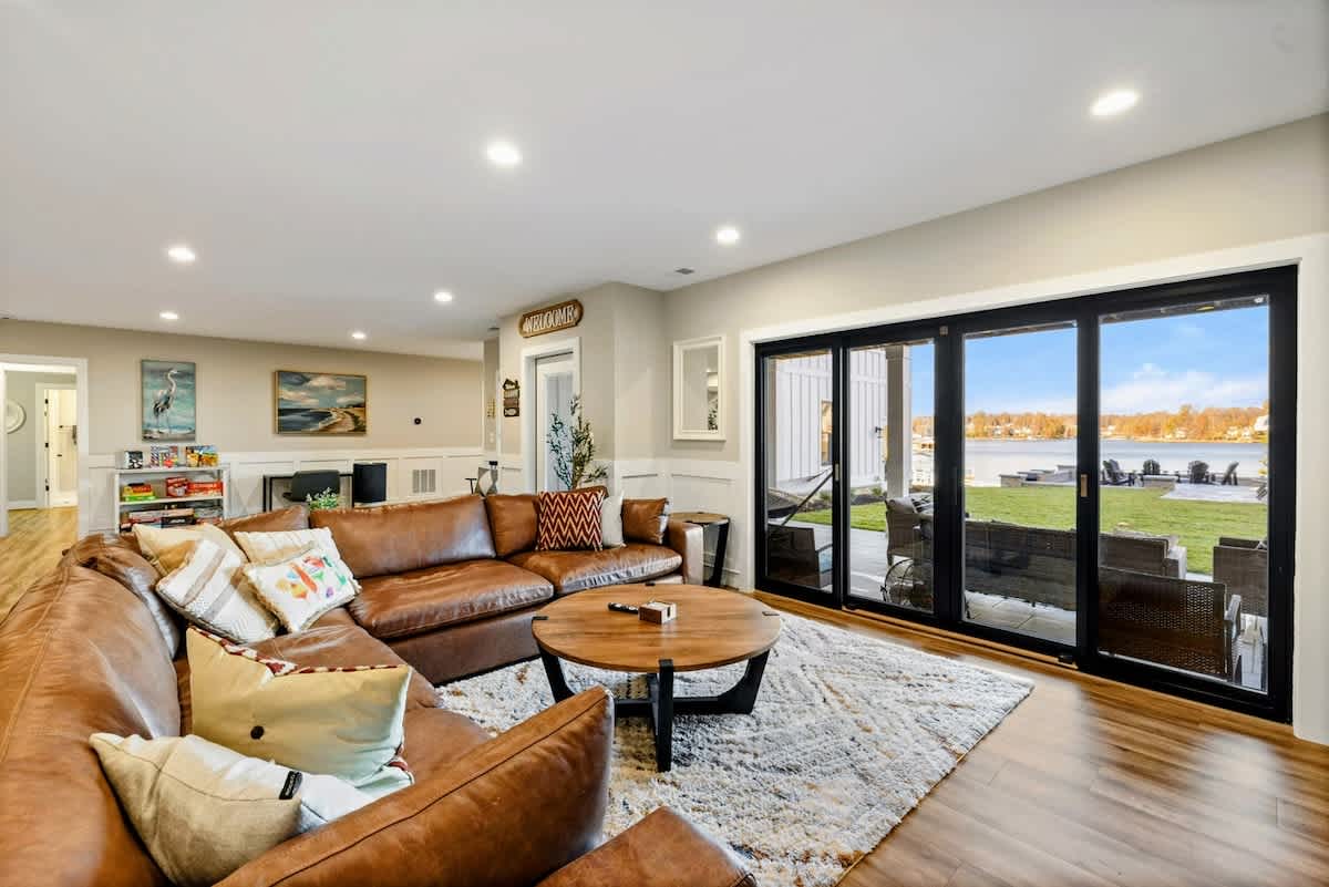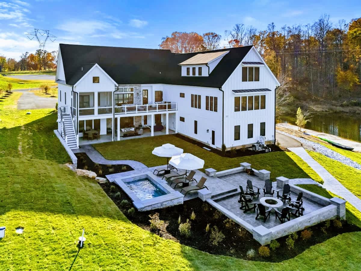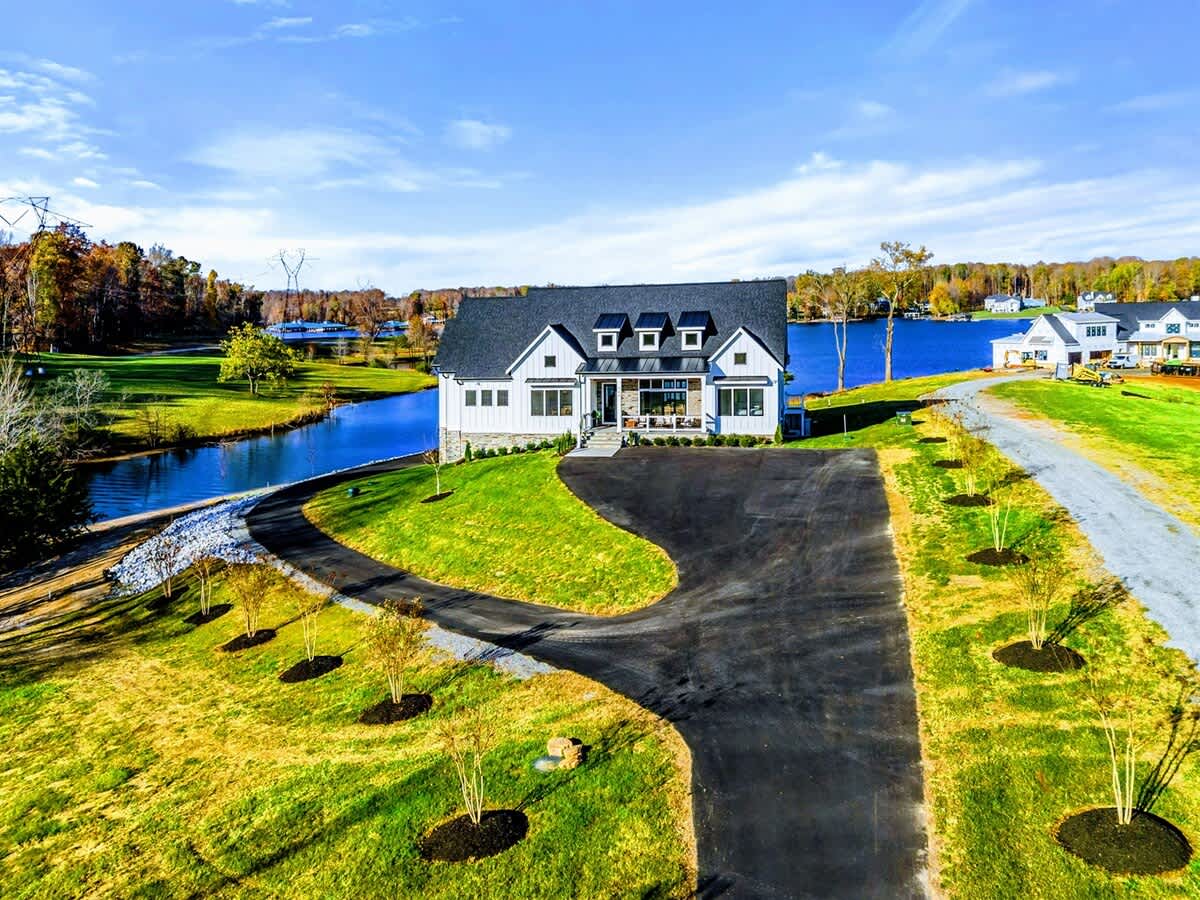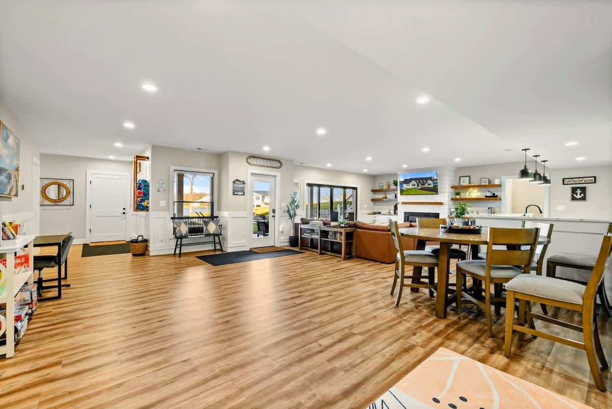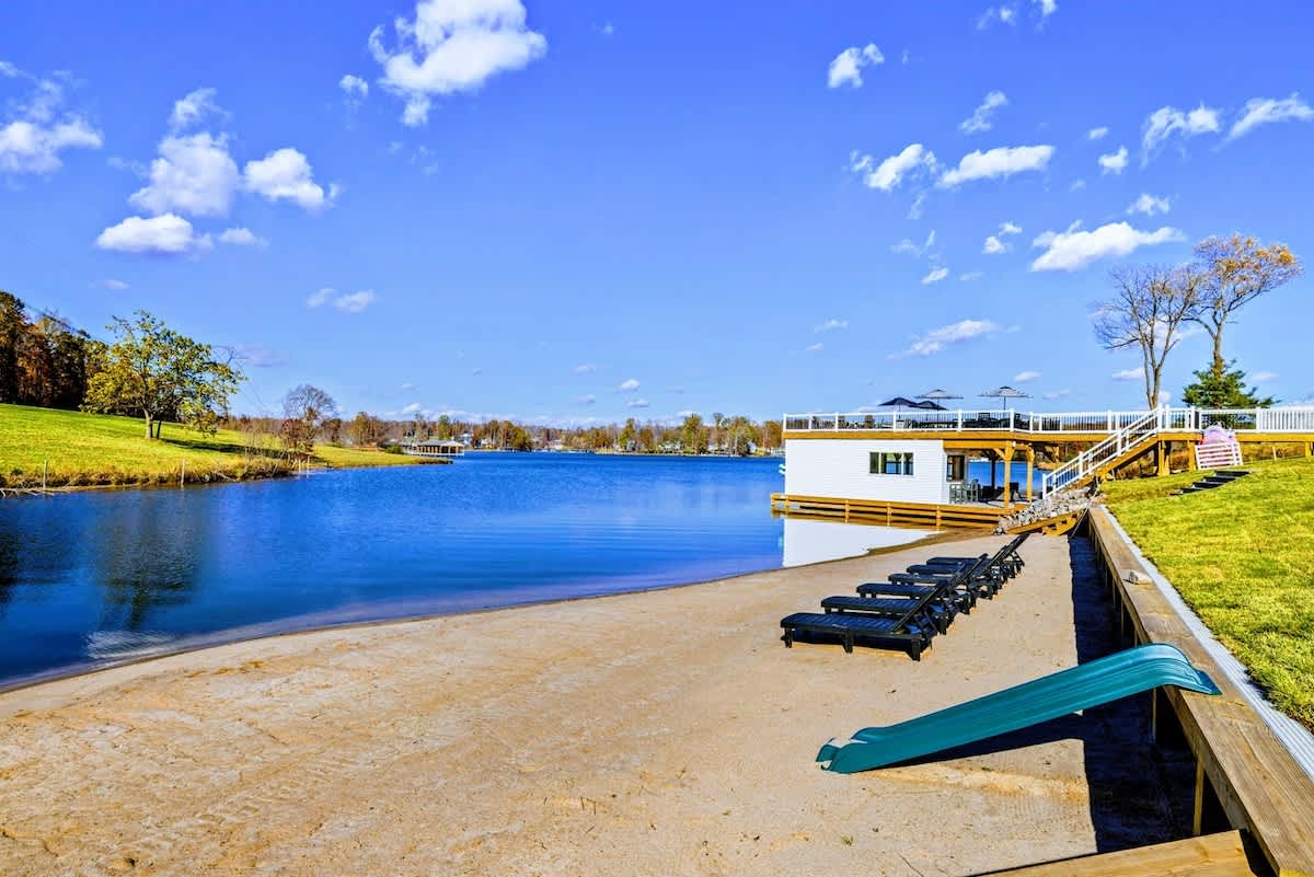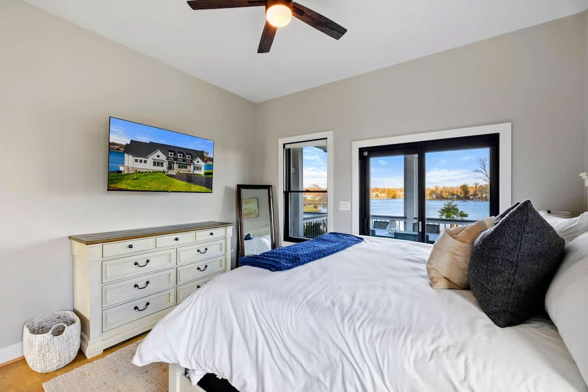 Experience comfort and luxury at our brand new modern and spacious lakefront home on the Private Side of Lake Anna. Enjoy the blue water lake views from the large boat dock and boat house, while relaxing in the Plunge Pool / Hot Tub, atop of our deck, or from the comfort of inside the home through many of the large windows. You will love the entire property including the waterfront shoreline with a gently sloped naturally sandy bottom, private beach, and warm freshwater. We provide lots of water toys including kayaks, paddle boards, and a canoe. Roast some delicious s'mores outside using our outdoor fire pit, and have a BBQ using our outdoor gas grills on the deck and patio. Some of our outdoor yard games include cornhole, volleyball, horseshoes, bocce ball, and more. Inside, this expansive home has plenty of space for everyone with 9 bedrooms, 6 full and 2 half bathrooms, an open floor plan and multiple living areas, fully equipped kitchens, and two laundry rooms. Relax in the spacious main great room with water views through the huge bright windows, a gas fireplace, and 4K Smart TV.