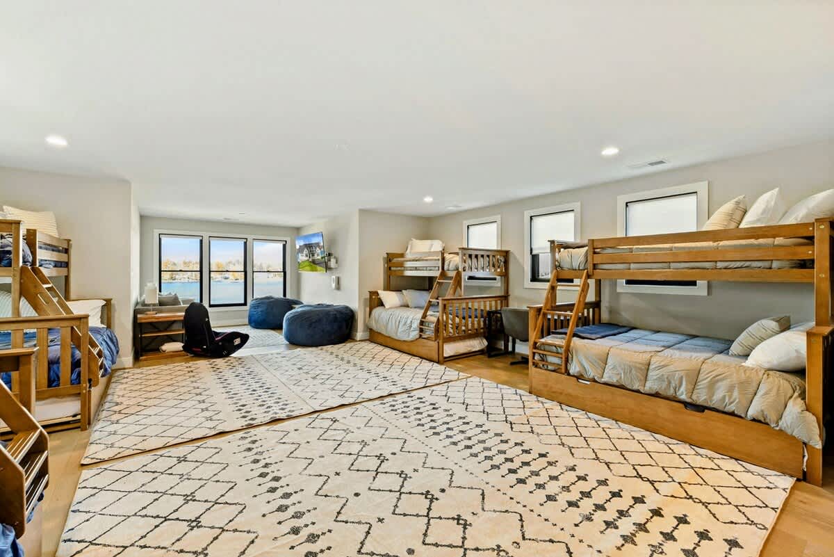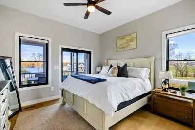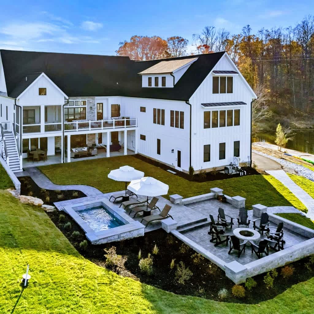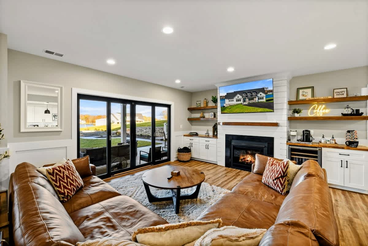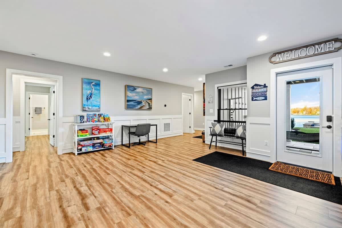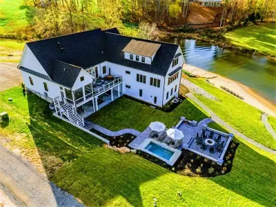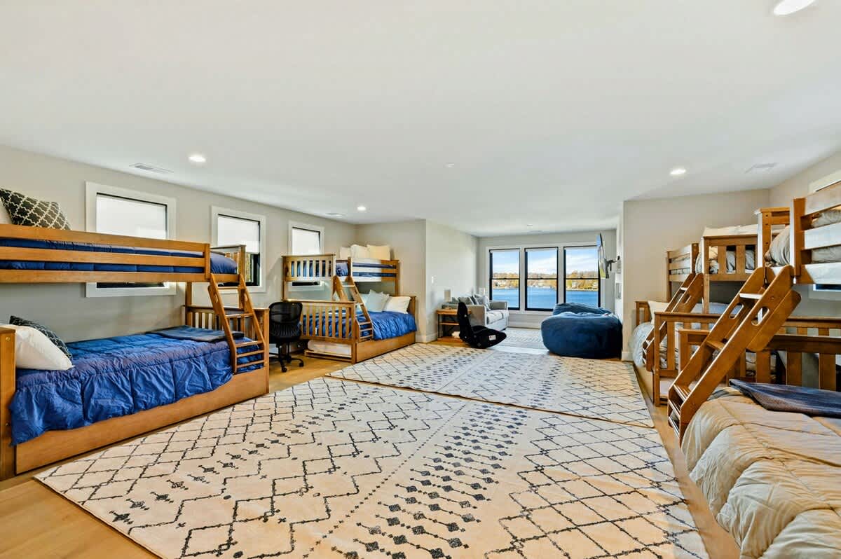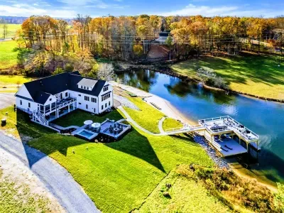 Experience comfort and luxury at our brand new modern and spacious lakefront home on the Private Side of Lake Anna. Enjoy the blue water lake views from the large boat dock and boat house, while relaxing in the Plunge Pool / Hot Tub, atop of our deck, or from the comfort of inside the home through many of the large windows. You will love the entire property including the waterfront shoreline with a gently sloped naturally sandy bottom, private beach, and warm freshwater. We provide lots of water toys including kayaks, paddle boards, and a canoe. Roast some delicious s'mores outside using our outdoor fire pit, and have a BBQ using our outdoor gas grills on the deck and patio. Some of our outdoor yard games include cornhole, volleyball, horseshoes, bocce ball, and more. Inside, this expansive home has plenty of space for everyone with 9 bedrooms, 6 full and 2 half bathrooms, an open floor plan and multiple living areas, fully equipped kitchens, and two laundry rooms. Relax in the spacious main great room with water views through the huge bright windows, a gas fireplace, and 4K Smart TV.
