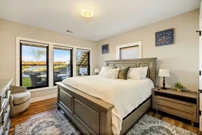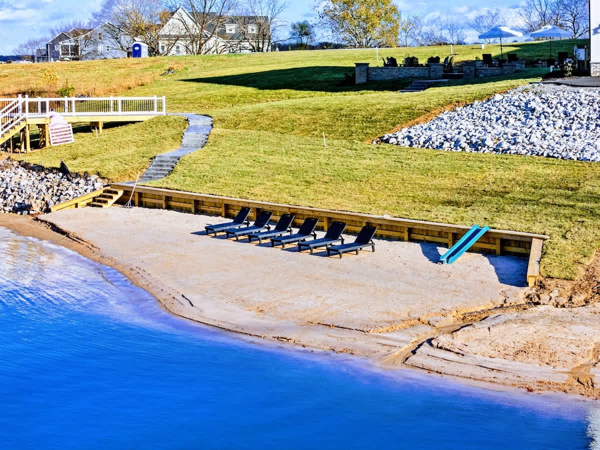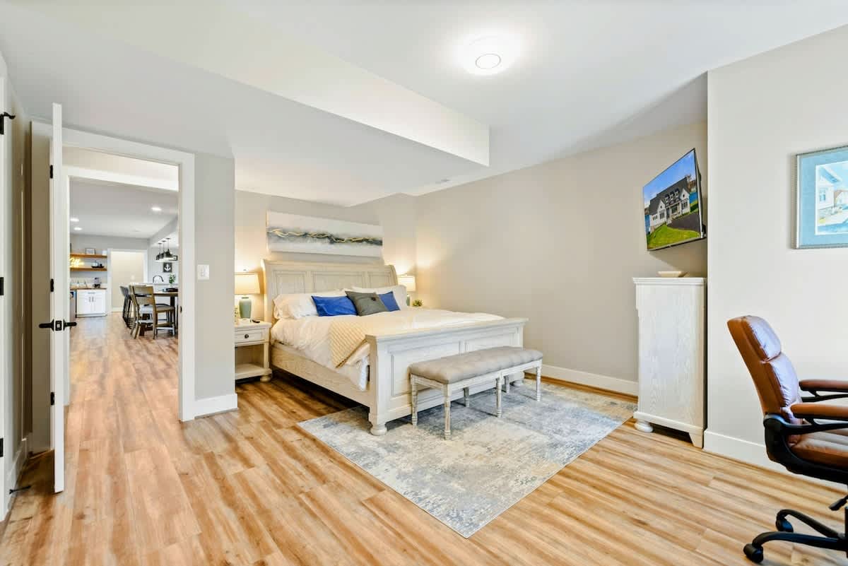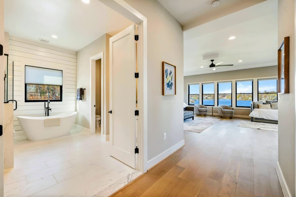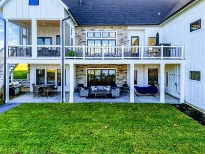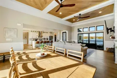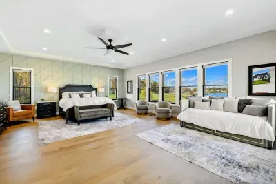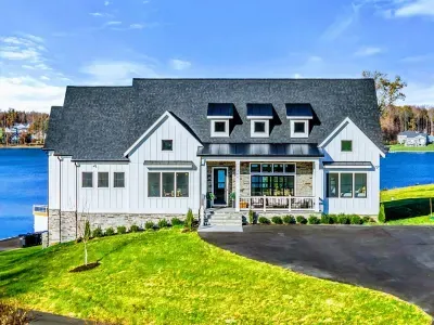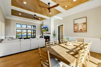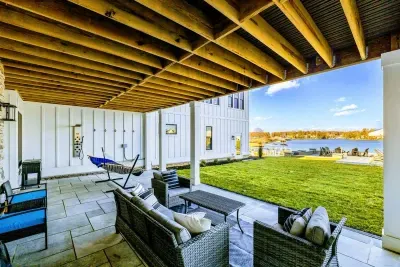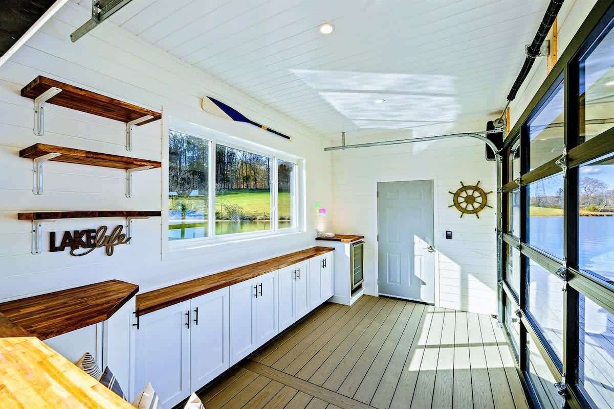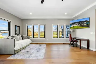 Experience comfort and luxury at our brand new modern and spacious lakefront home on the Private Side of Lake Anna. Enjoy the blue water lake views from the large boat dock and boat house, while relaxing in the Plunge Pool / Hot Tub, atop of our deck, or from the comfort of inside the home through many of the large windows. You will love the entire property including the waterfront shoreline with a gently sloped naturally sandy bottom, private beach, and warm freshwater. We provide lots of water toys including kayaks, paddle boards, and a canoe. Roast some delicious s'mores outside using our outdoor fire pit, and have a BBQ using our outdoor gas grills on the deck and patio. Some of our outdoor yard games include cornhole, volleyball, horseshoes, bocce ball, and more. Inside, this expansive home has plenty of space for everyone with 9 bedrooms, 6 full and 2 half bathrooms, an open floor plan and multiple living areas, fully equipped kitchens, and two laundry rooms. Relax in the spacious main great room with water views through the huge bright windows, a gas fireplace, and 4K Smart TV.