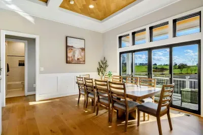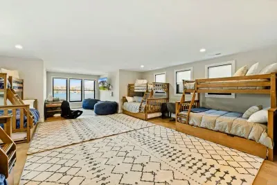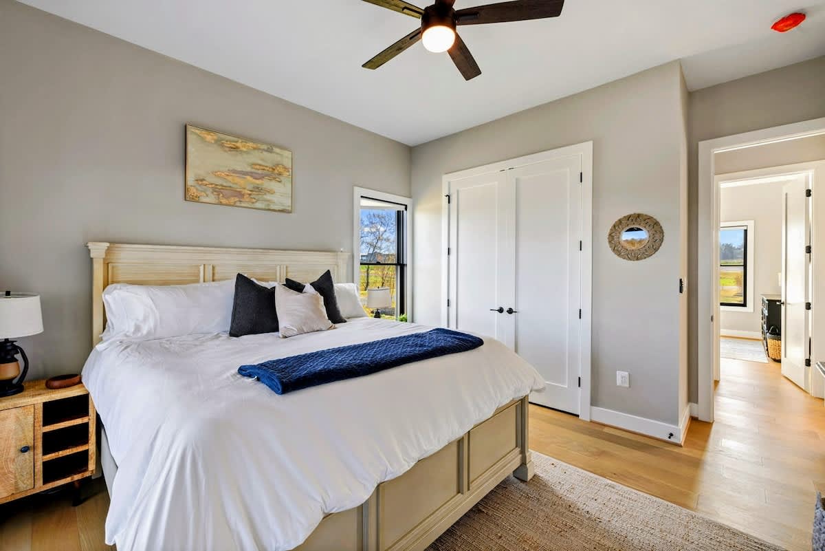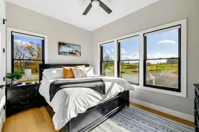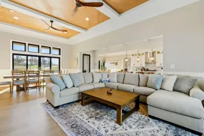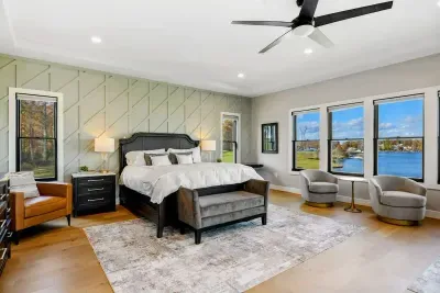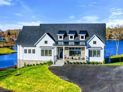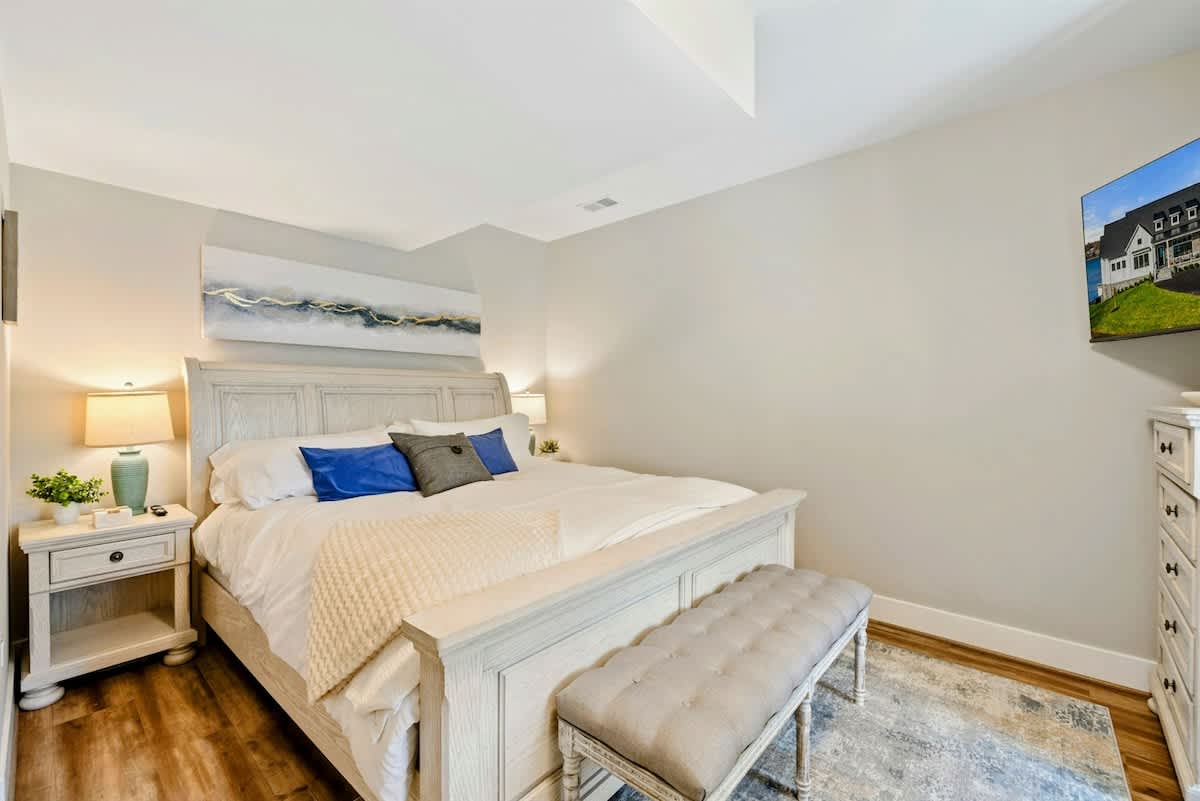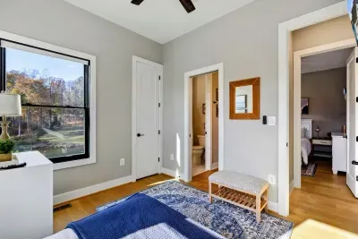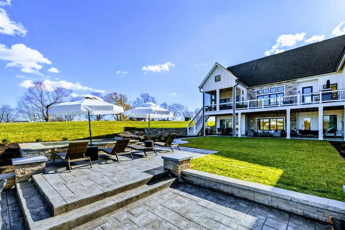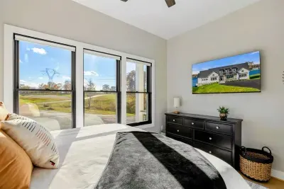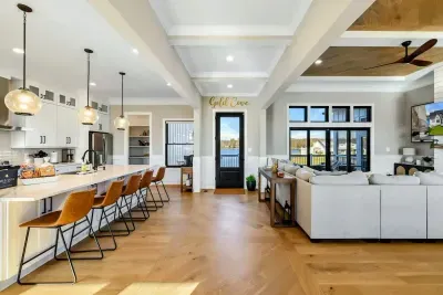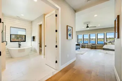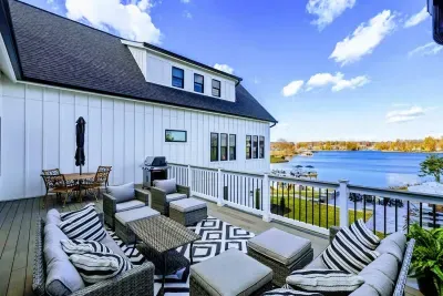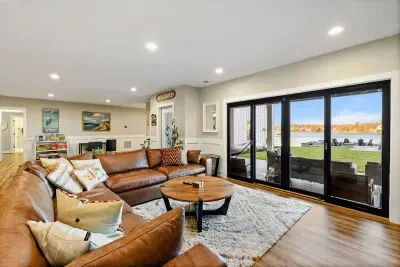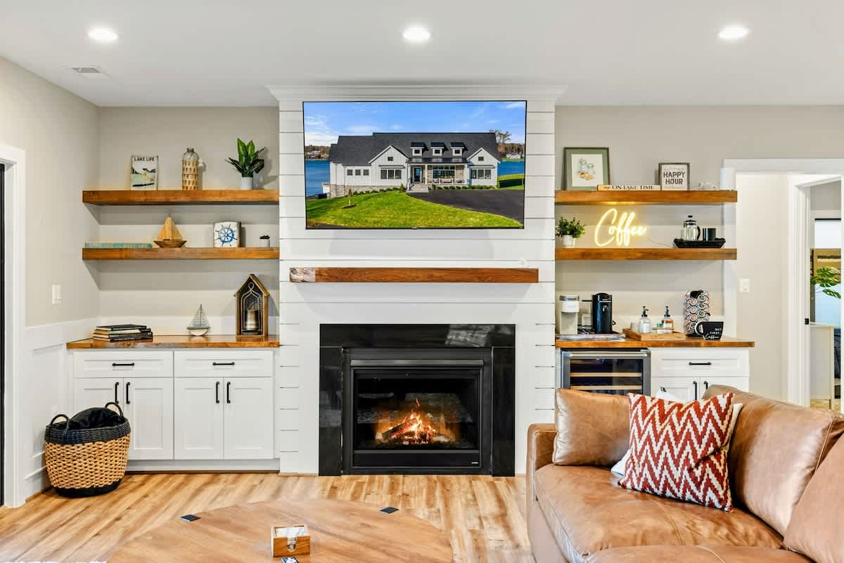 Experience comfort and luxury at our brand new modern and spacious lakefront home on the Private Side of Lake Anna. Enjoy the blue water lake views from the large boat dock and boat house, while relaxing in the Plunge Pool / Hot Tub, atop of our deck, or from the comfort of inside the home through many of the large windows. You will love the entire property including the waterfront shoreline with a gently sloped naturally sandy bottom, private beach, and warm freshwater. We provide lots of water toys including kayaks, paddle boards, and a canoe. Roast some delicious s'mores outside using our outdoor fire pit, and have a BBQ using our outdoor gas grills on the deck and patio. Some of our outdoor yard games include cornhole, volleyball, horseshoes, bocce ball, and more. Inside, this expansive home has plenty of space for everyone with 9 bedrooms, 6 full and 2 half bathrooms, an open floor plan and multiple living areas, fully equipped kitchens, and two laundry rooms. Relax in the spacious main great room with water views through the huge bright windows, a gas fireplace, and 4K Smart TV.