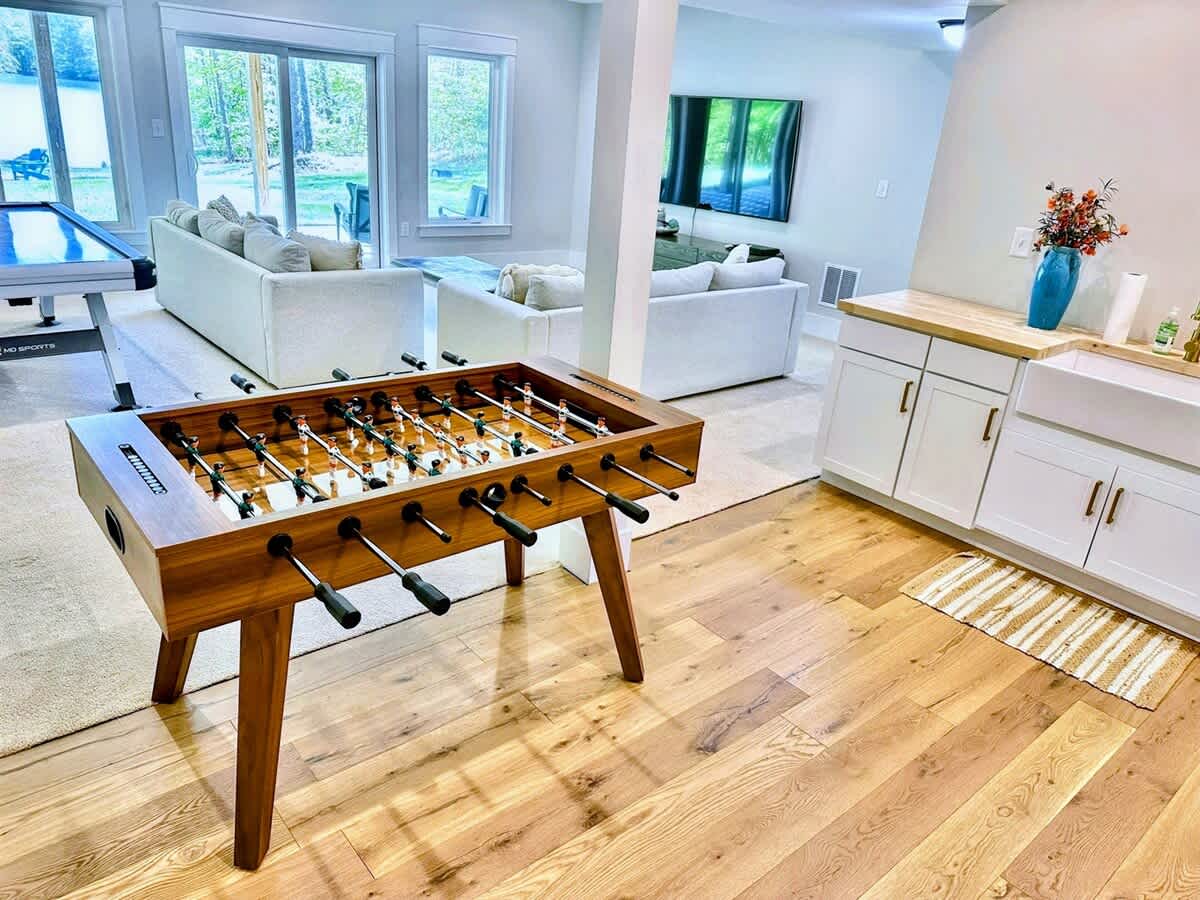-Game room features smart TV, a foosball table and an air hockey table.