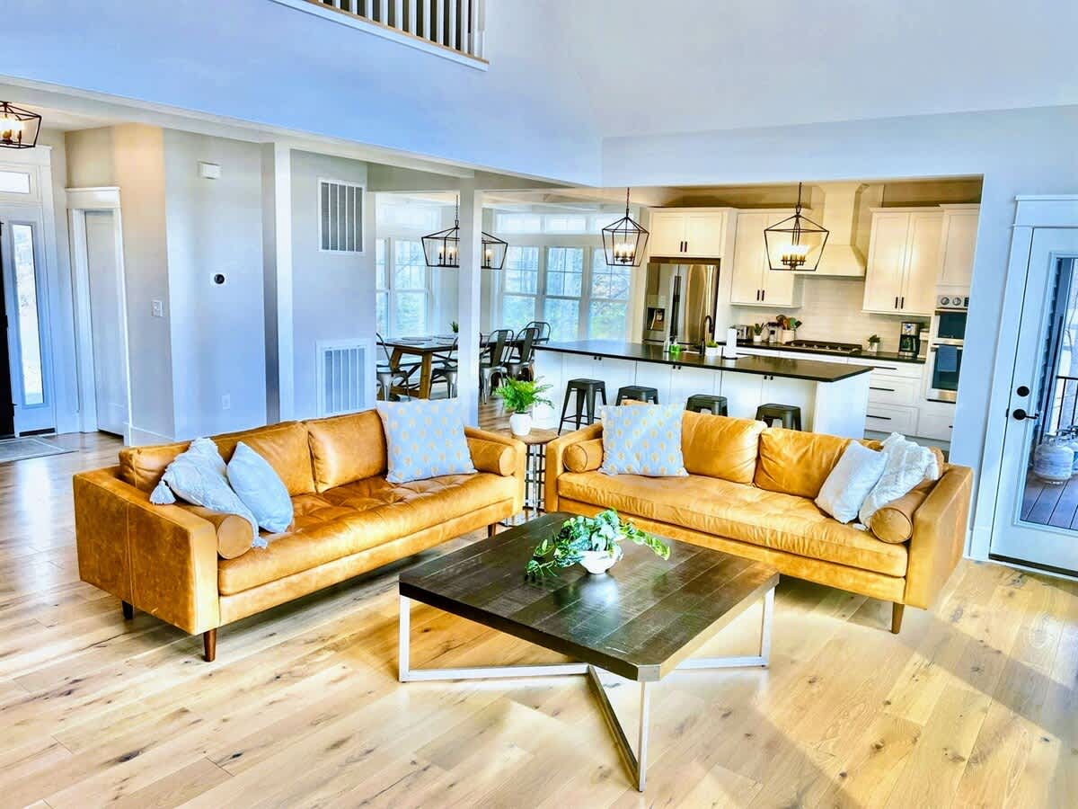 -Open floor plan with gourmet kitchen - 10 ft granite island (plenty of seating), white cabinets, stainless steel appliances, Restoration Hardware dining table and new Leather Sofas.
