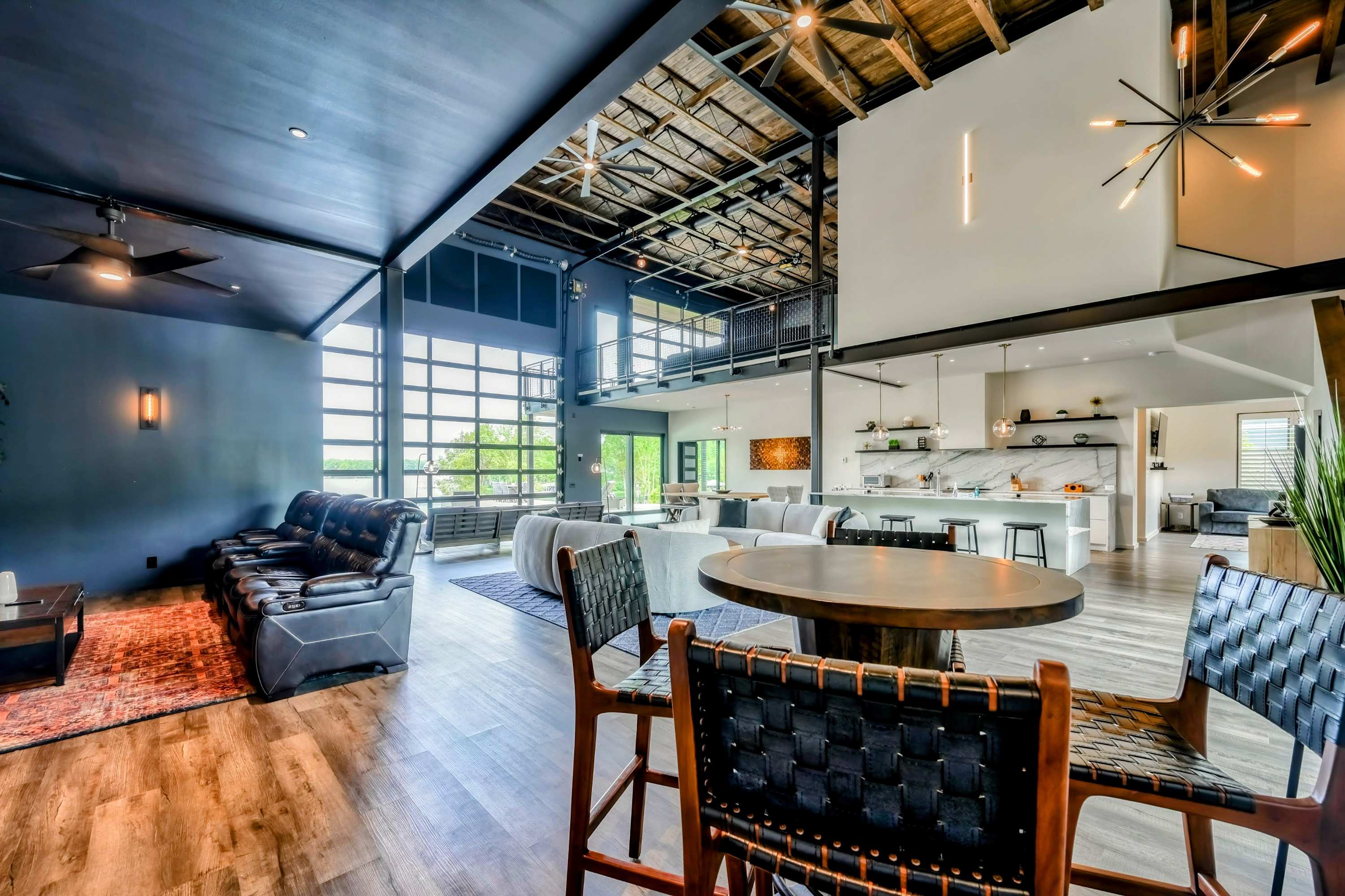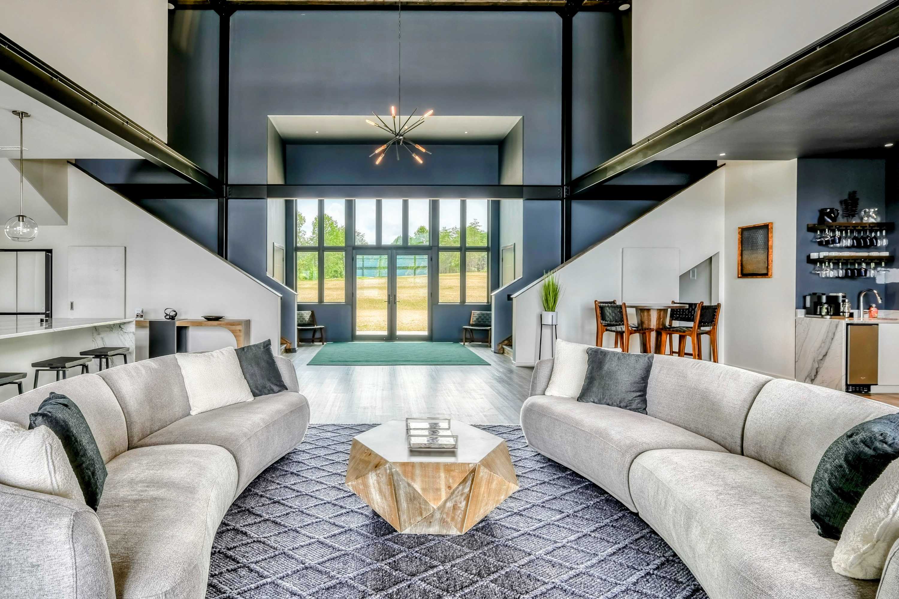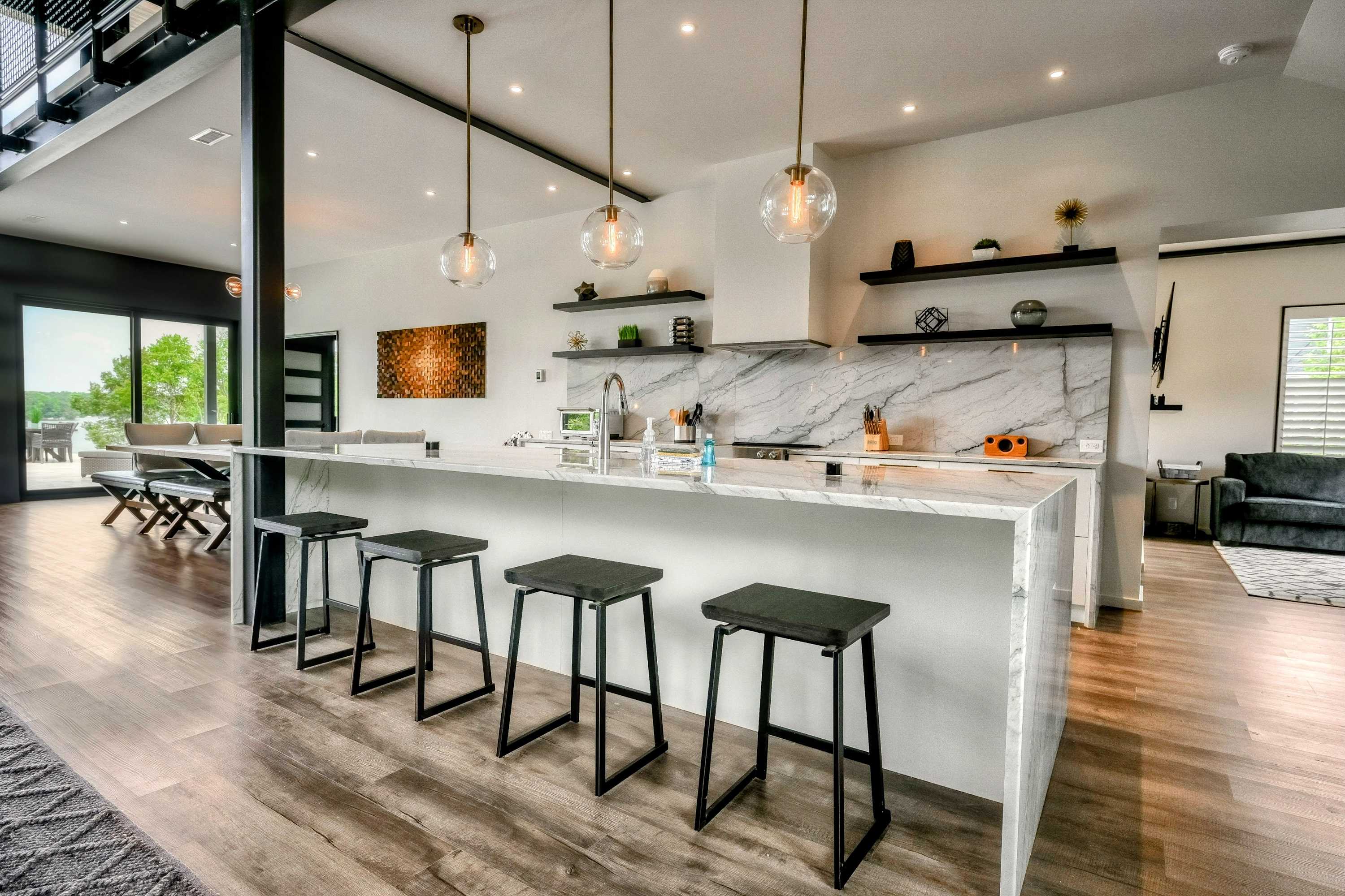 The elegance of Lake Anna Luxury extends indoors with a spacious open-plan living area, combining the living room, dining room, and kitchen into a harmonious space for gathering and entertainment. The kitchen, equipped with marble countertops and premium appliances, invites culinary exploration, complemented by a plethora dining options both indoors and out.