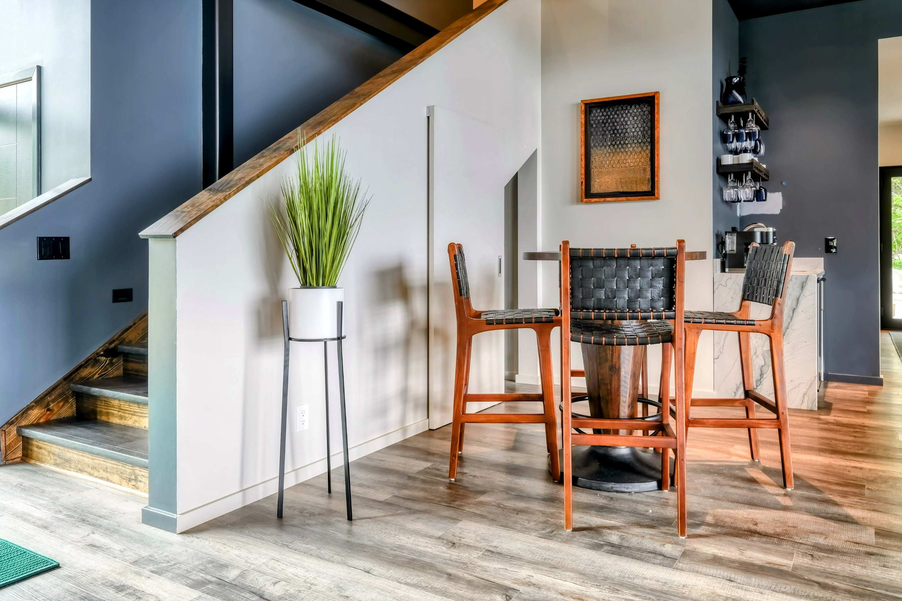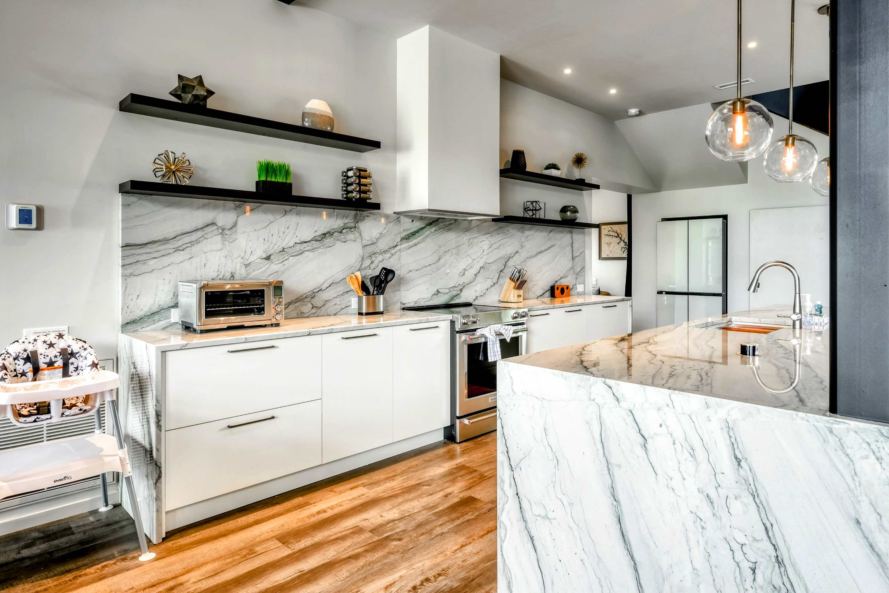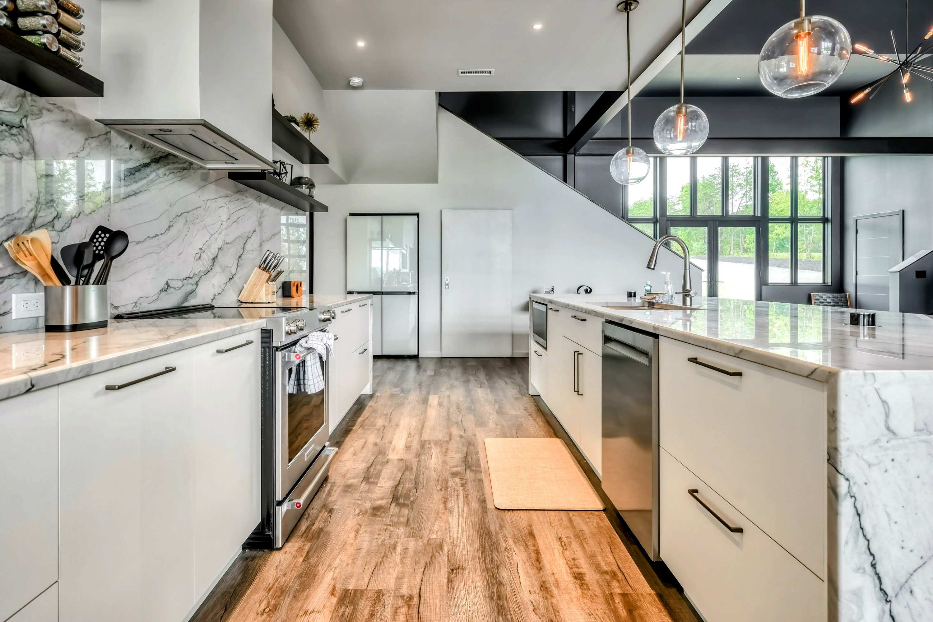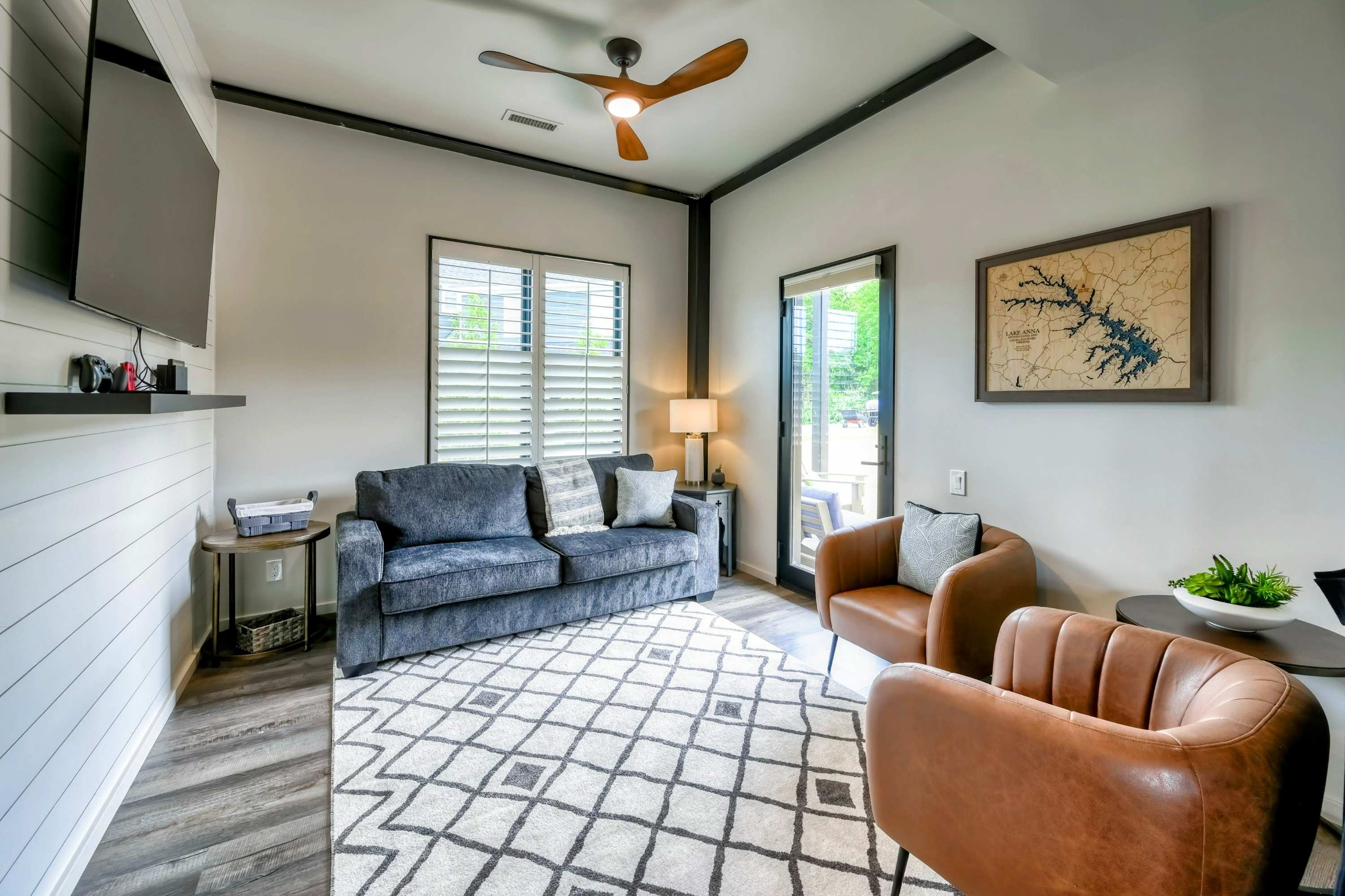 The elegance of Lake Anna Luxury extends indoors with a spacious open-plan living area, combining the living room, dining room, and kitchen into a harmonious space for gathering and entertainment. The kitchen, equipped with marble countertops and premium appliances, invites culinary exploration, complemented by a plethora dining options both indoors and out.