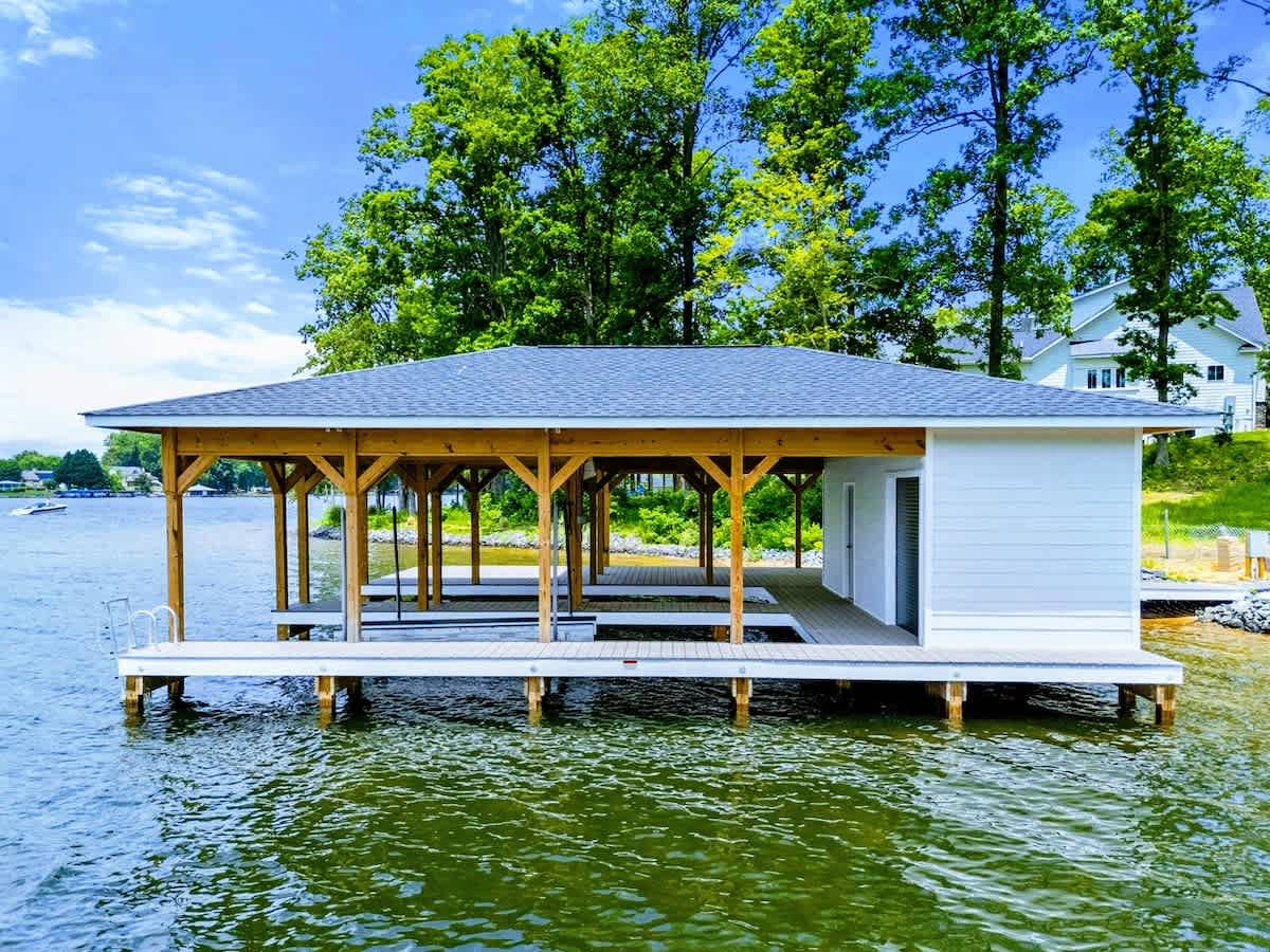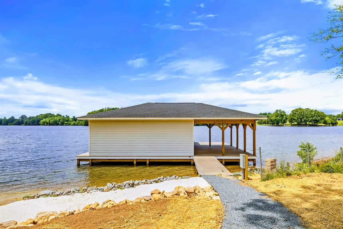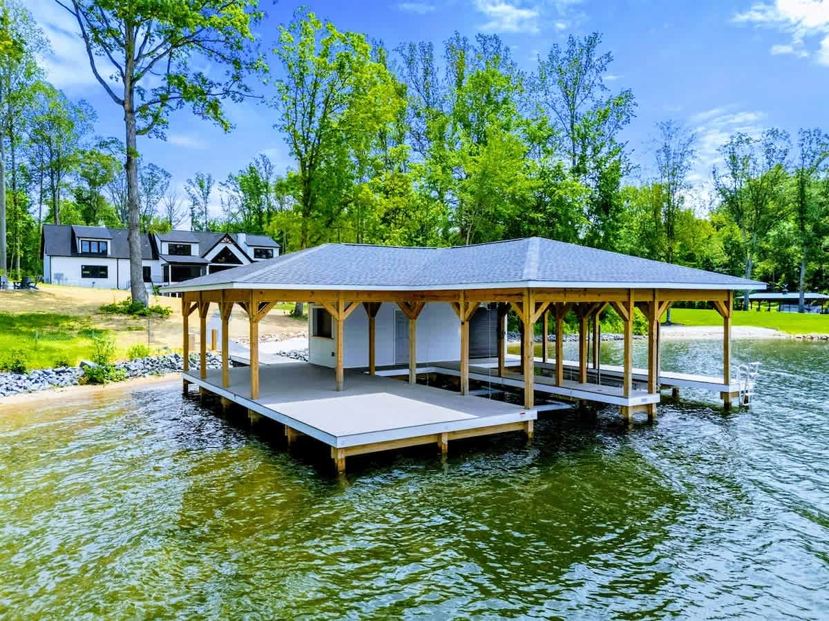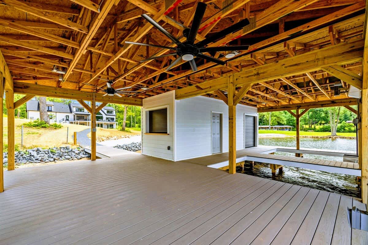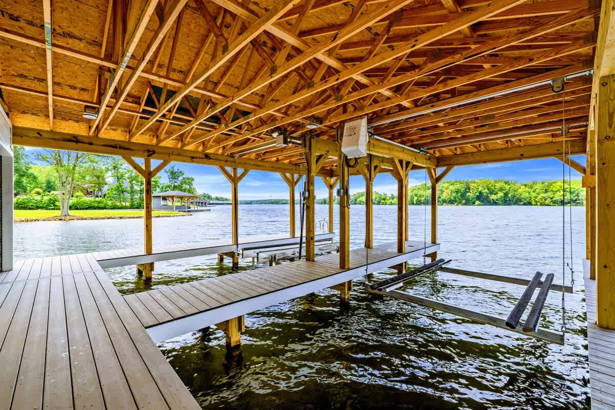 - Private boathouse with sun deck + sandy swim beach