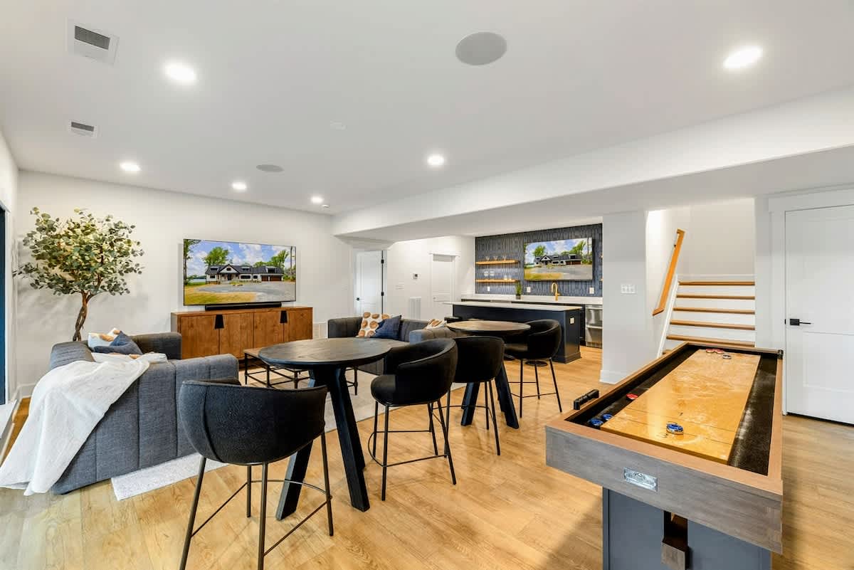 - Lower level game room with arcade games, shuffleboard, Smart TV, and kitchenette