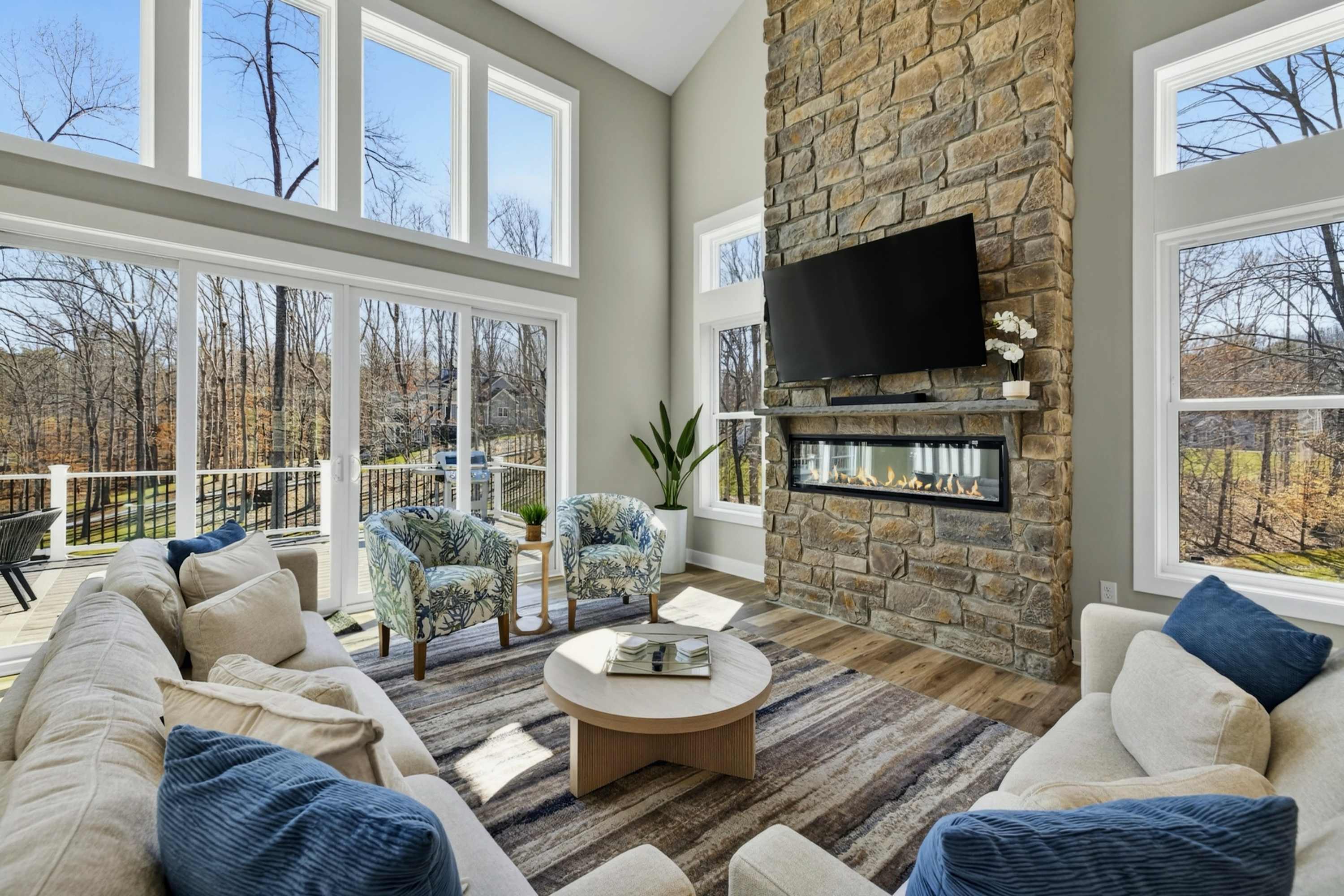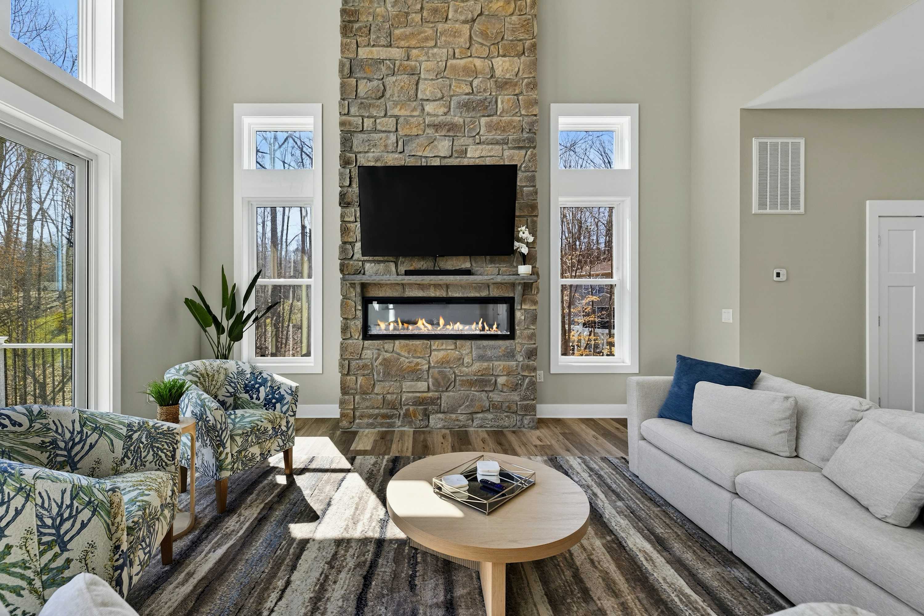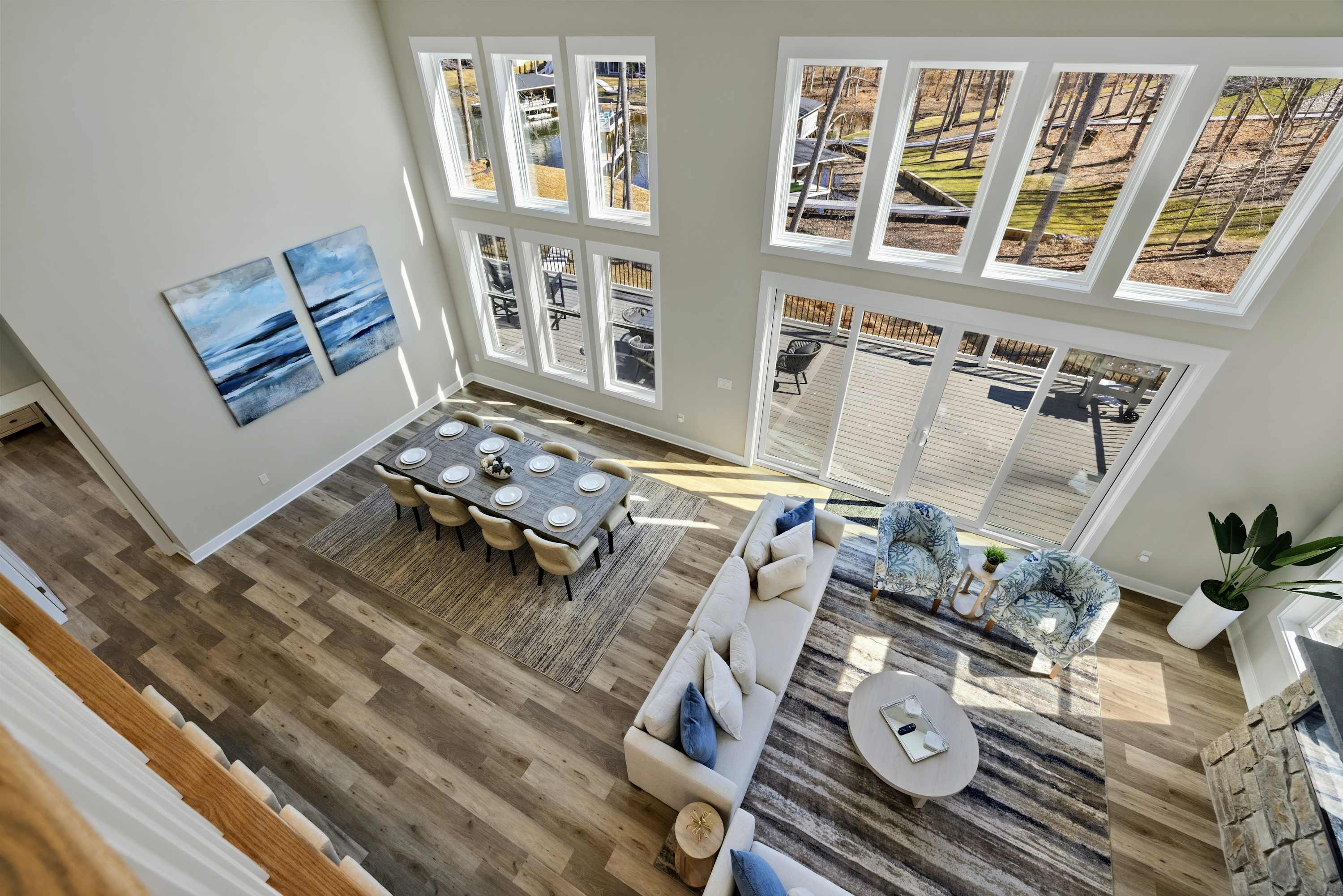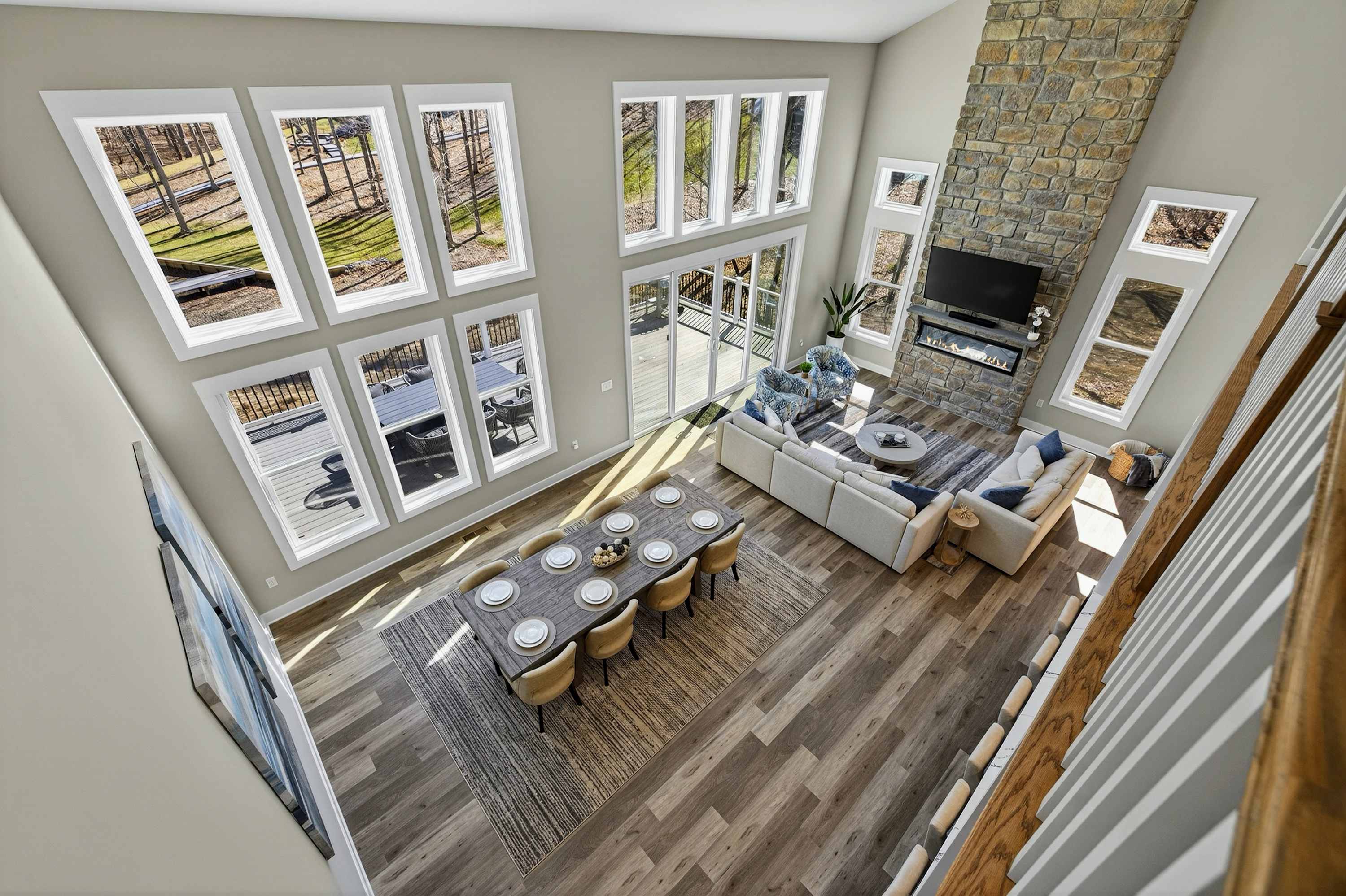 - Great room: floor-to-ceiling lake views, indoor fireplace, Smart TV
