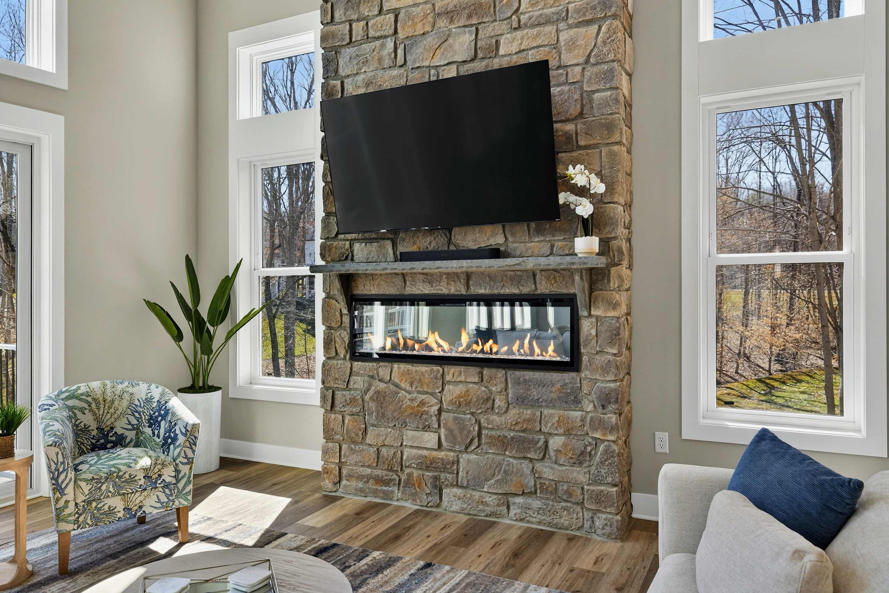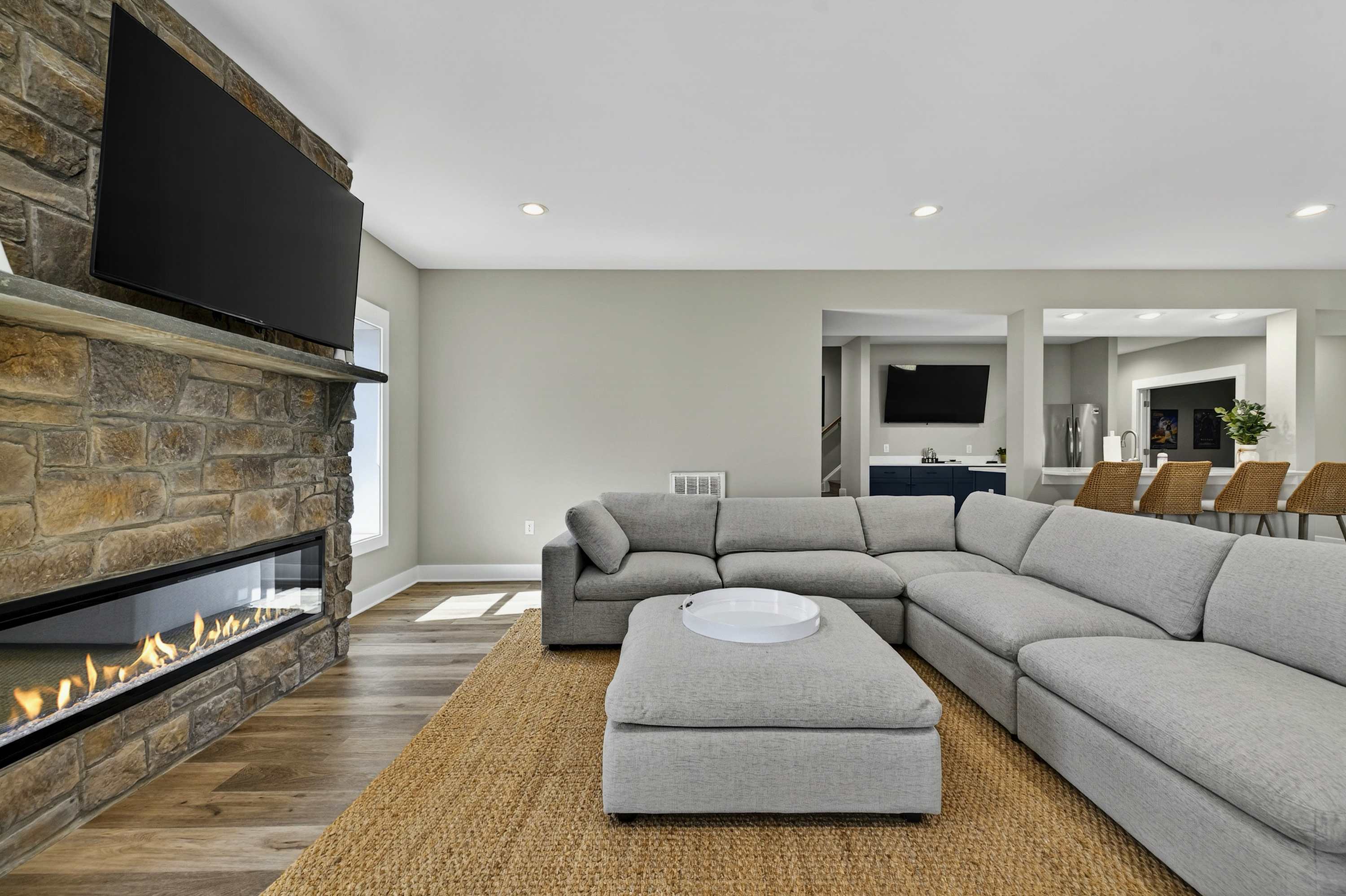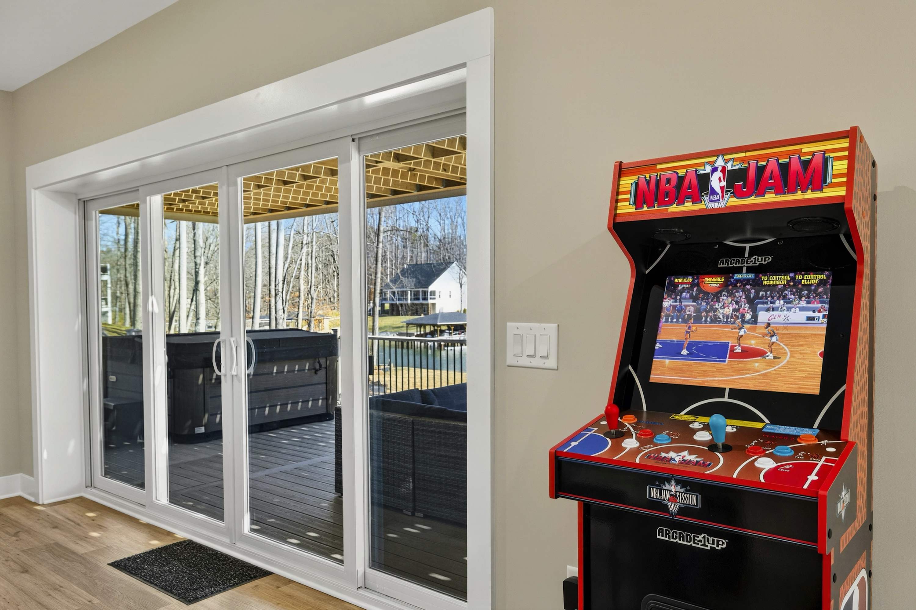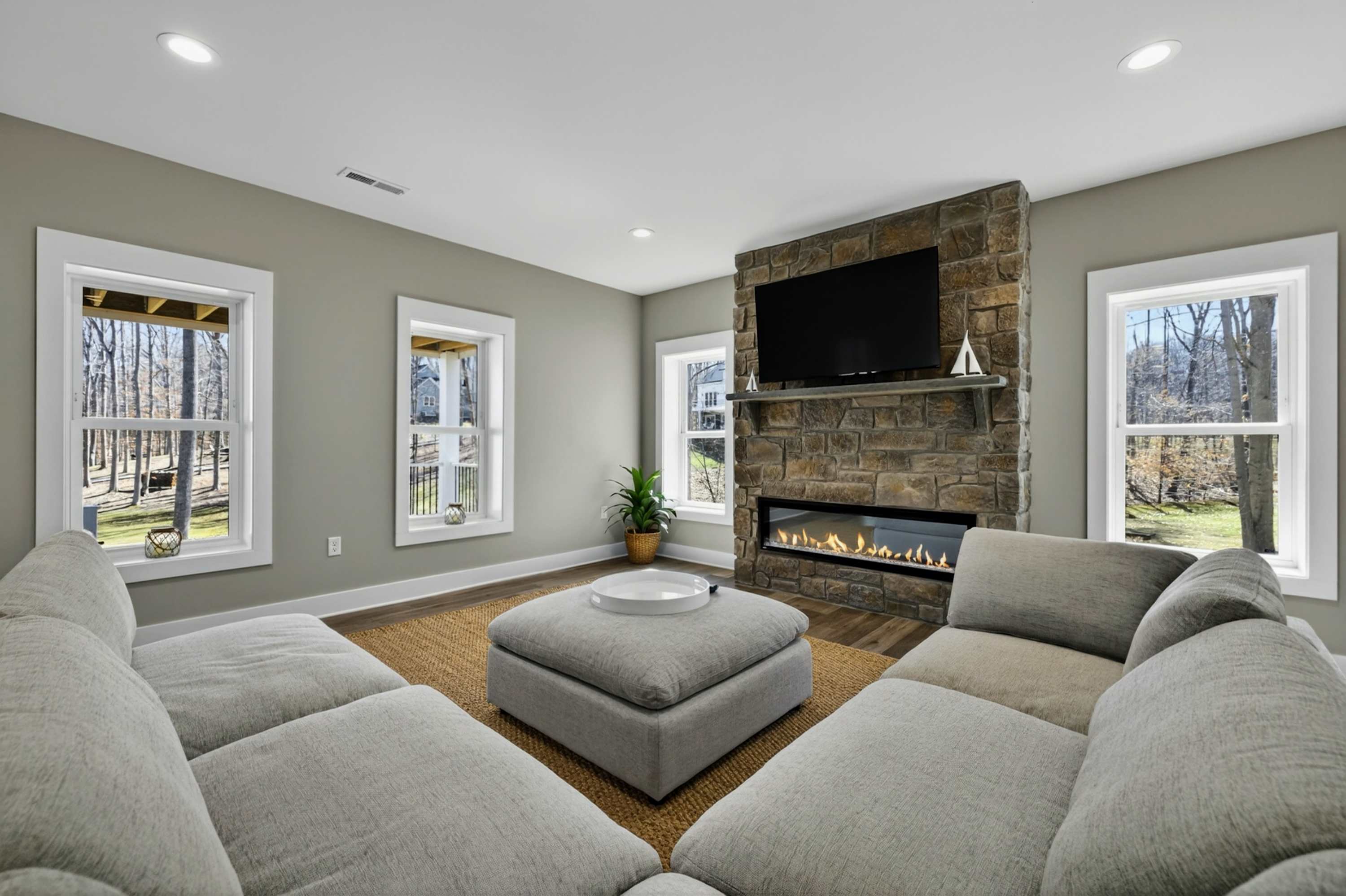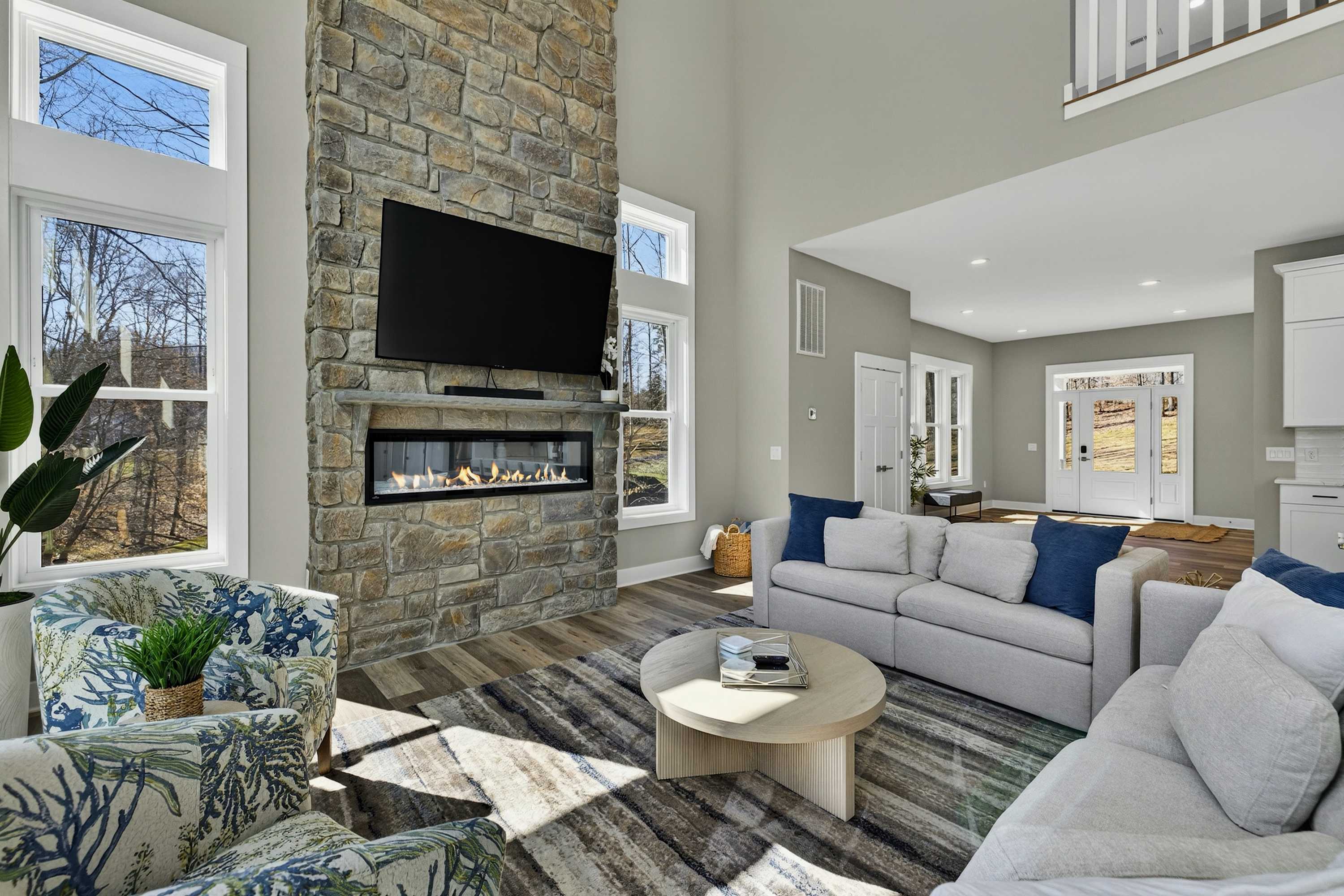 - Great room: floor-to-ceiling lake views, indoor fireplace, Smart TV