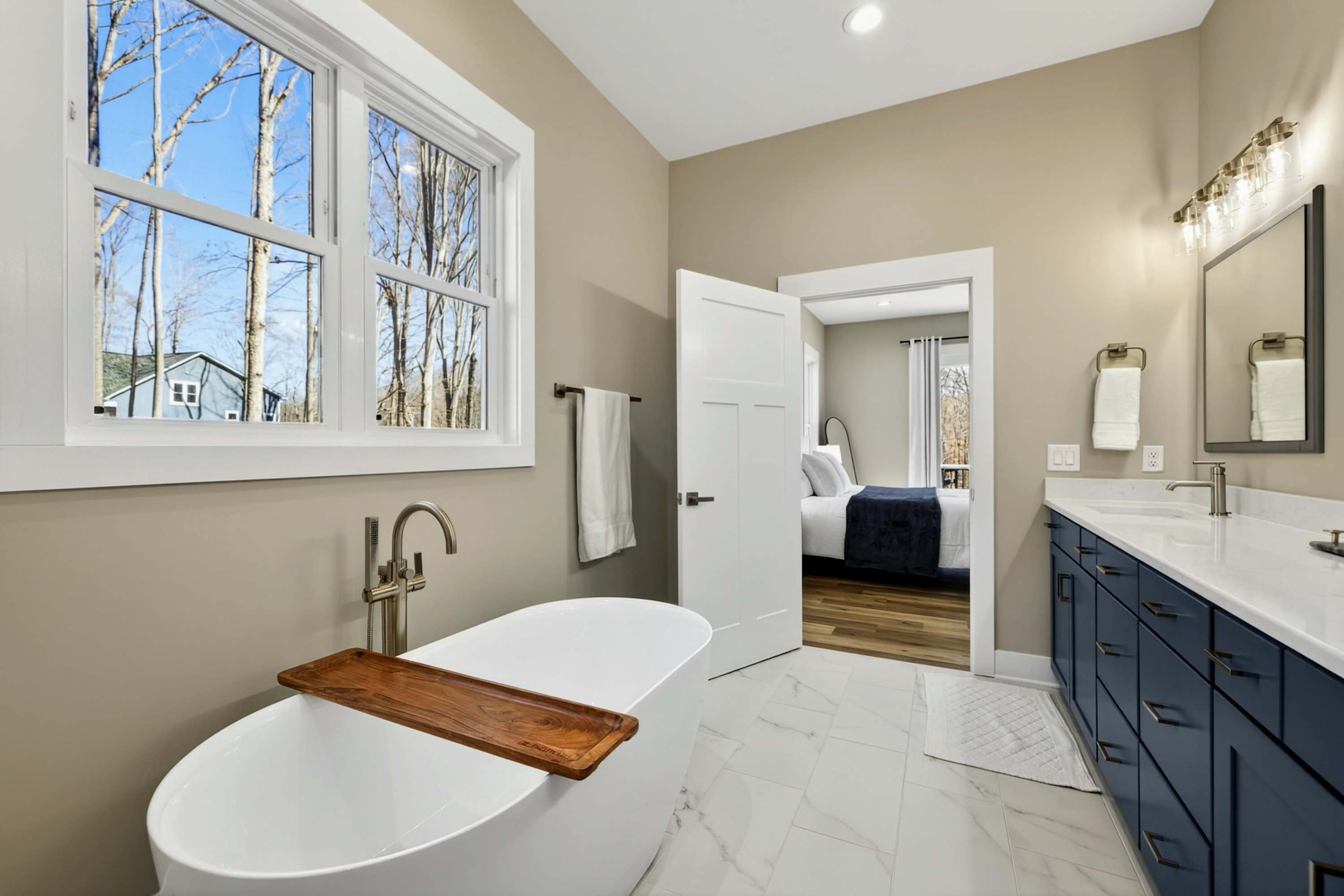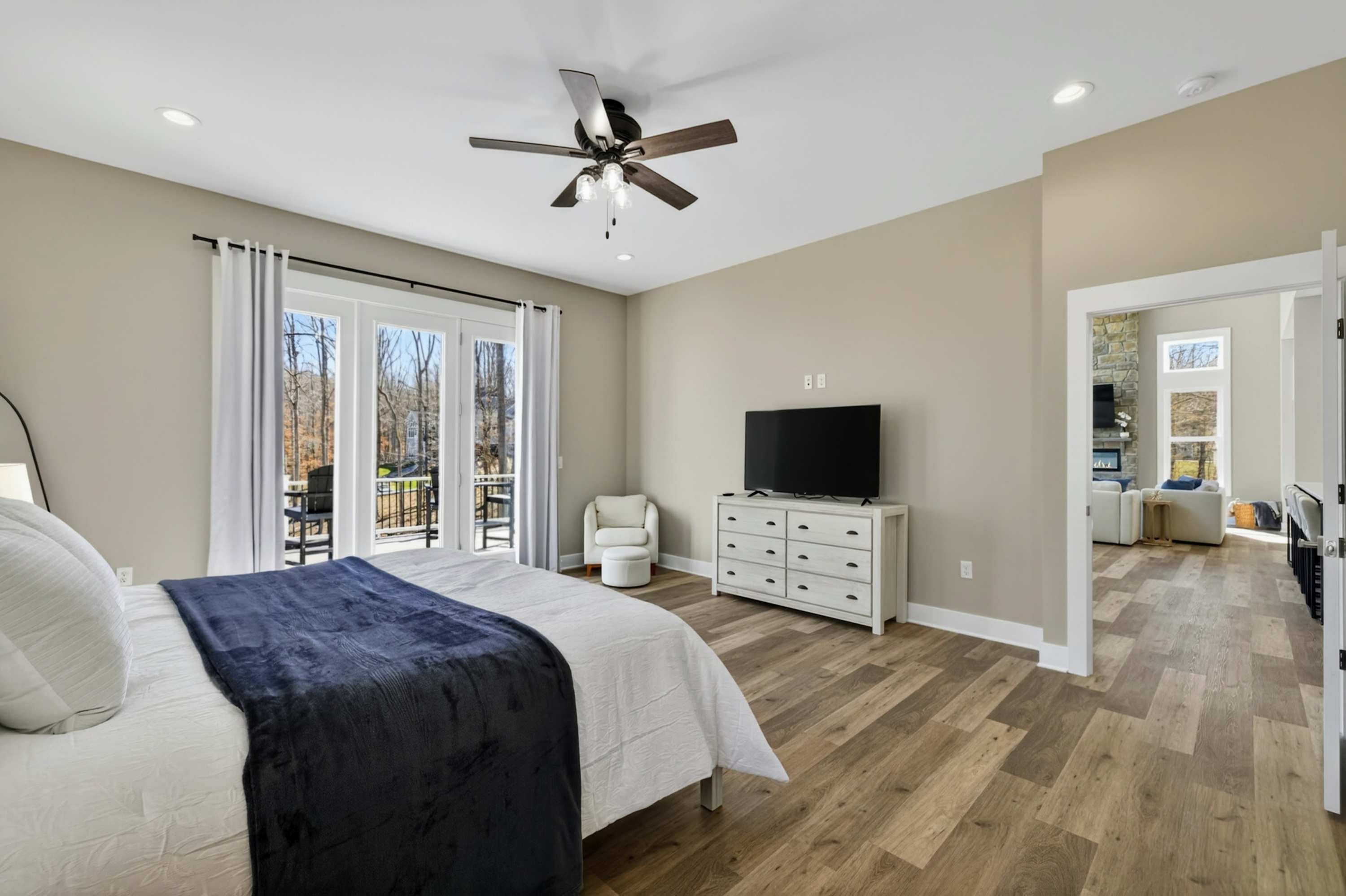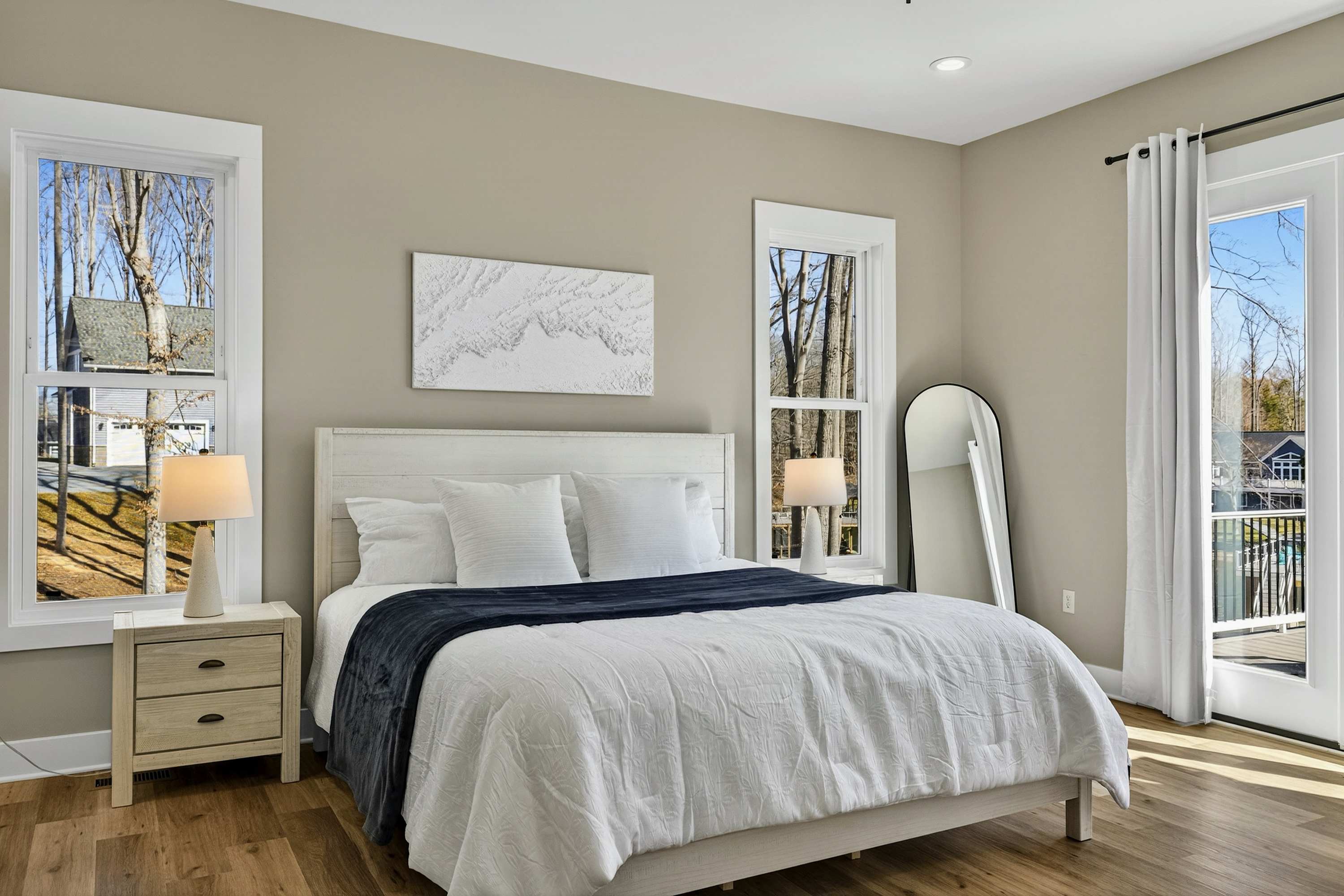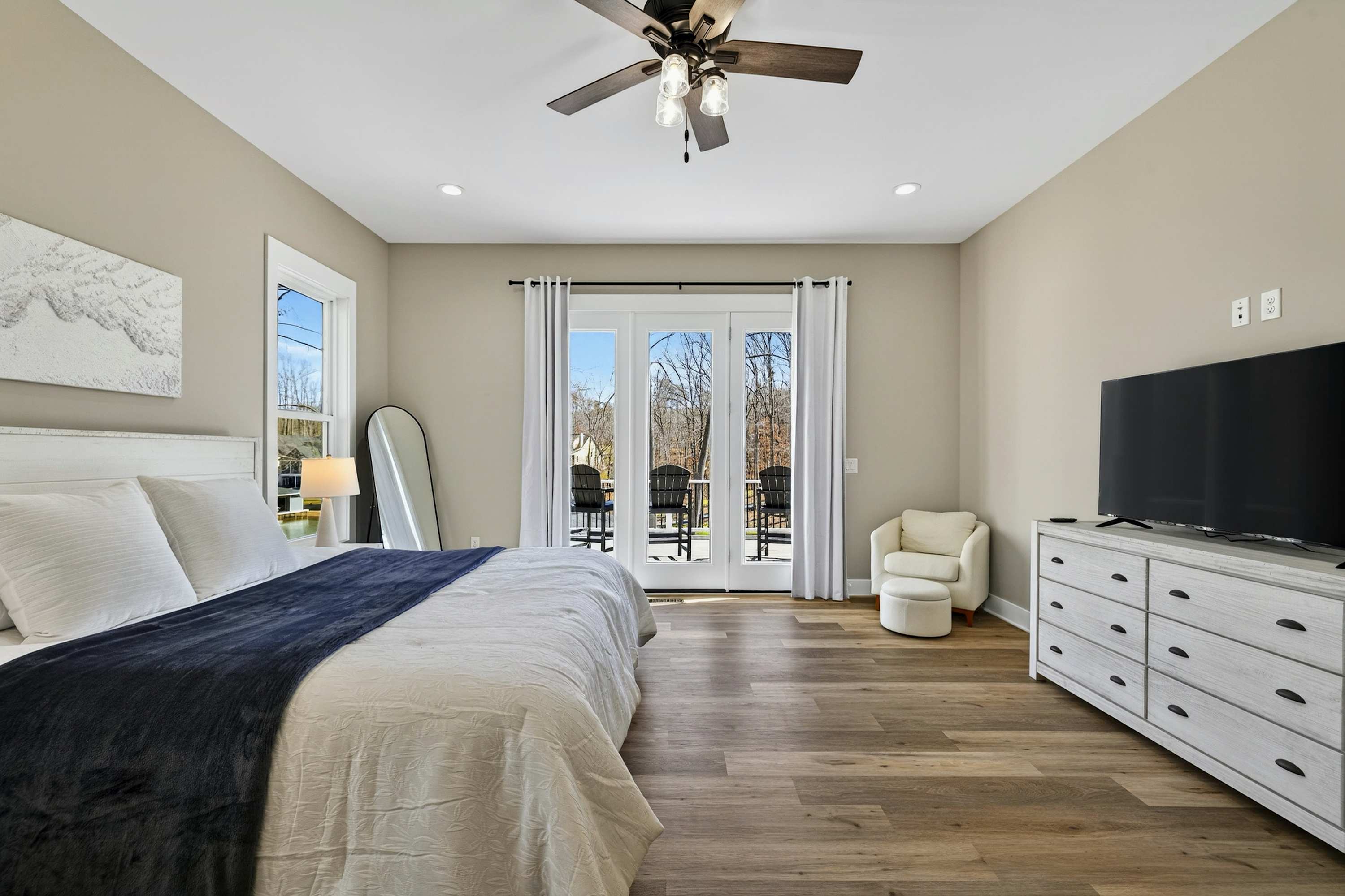 - Bedroom 1 (Primary Suite): King bed, ensuite bath with soaking tub and separate shower, private deck access
