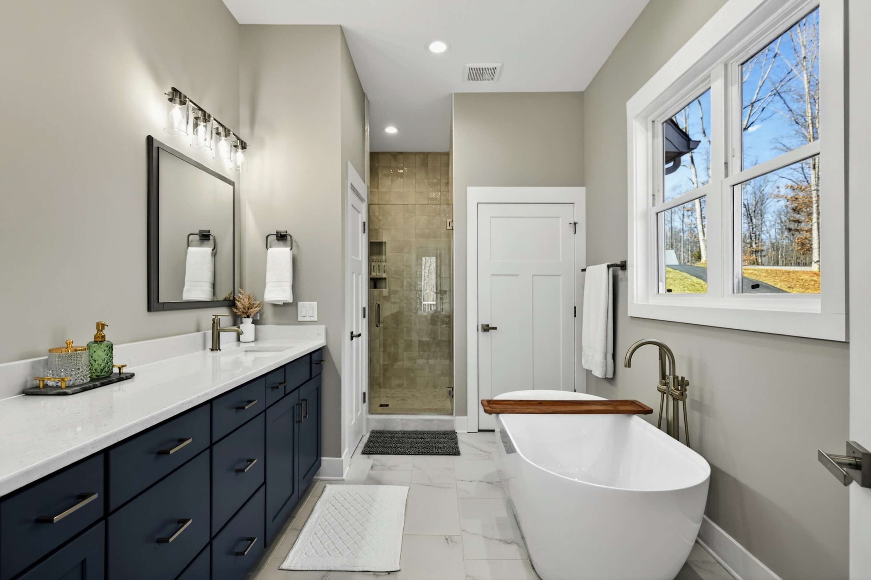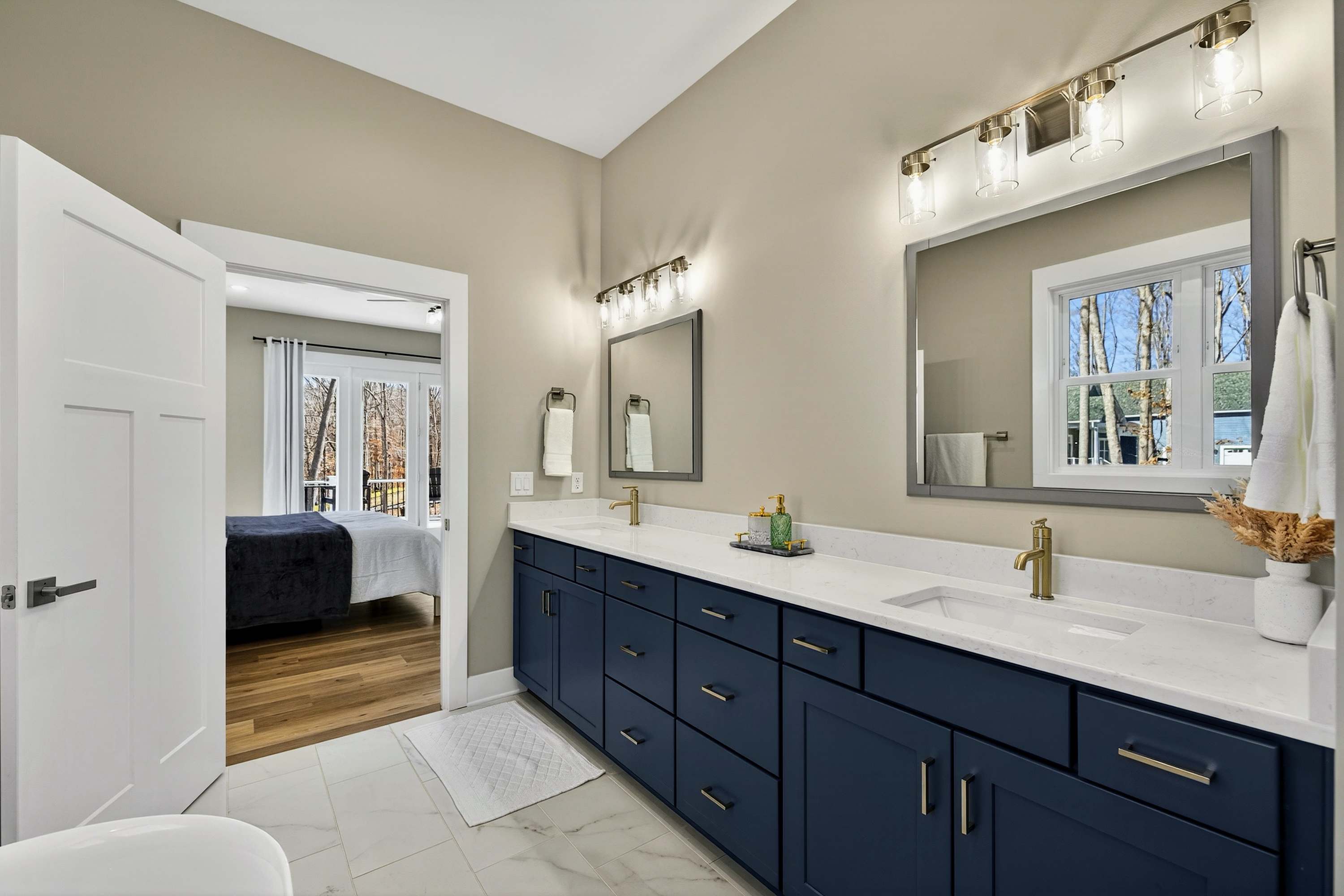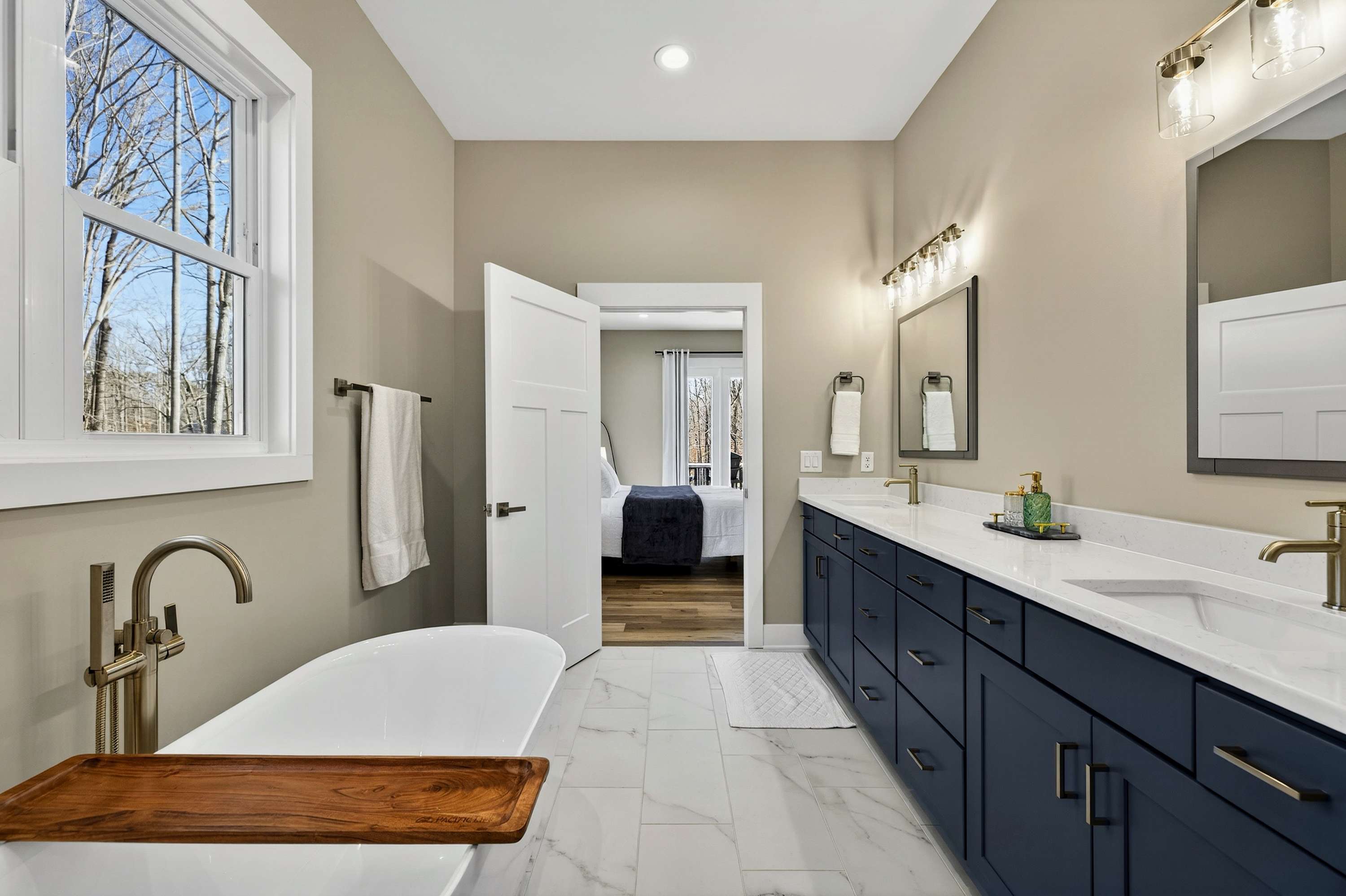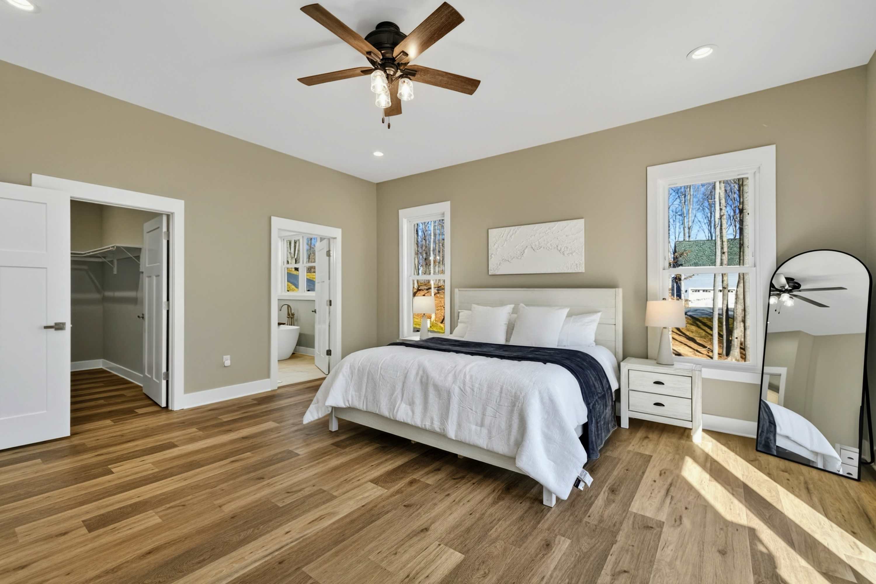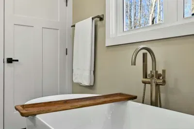 - Bedroom 1 (Primary Suite): King bed, ensuite bath with soaking tub and separate shower, private deck access