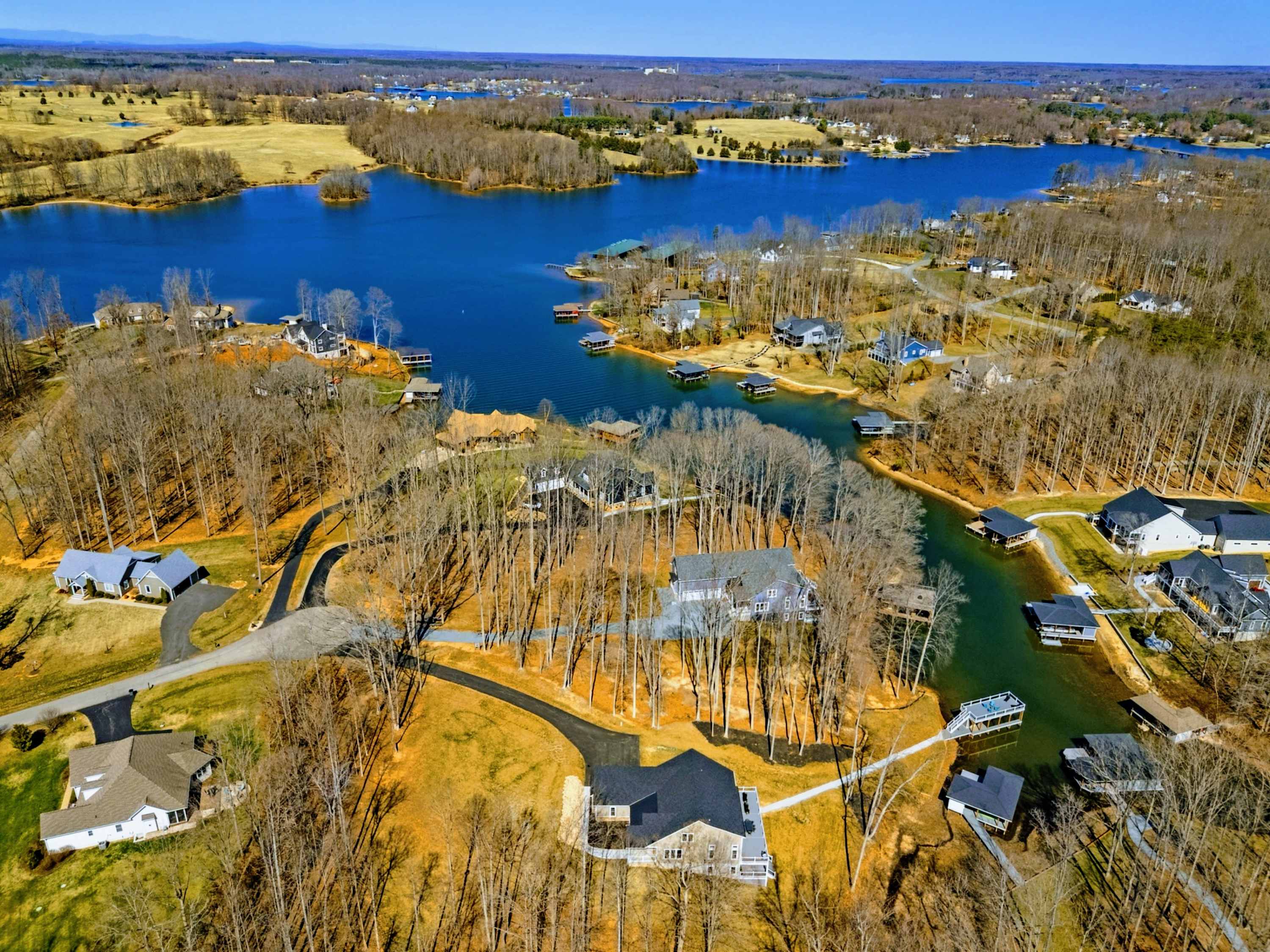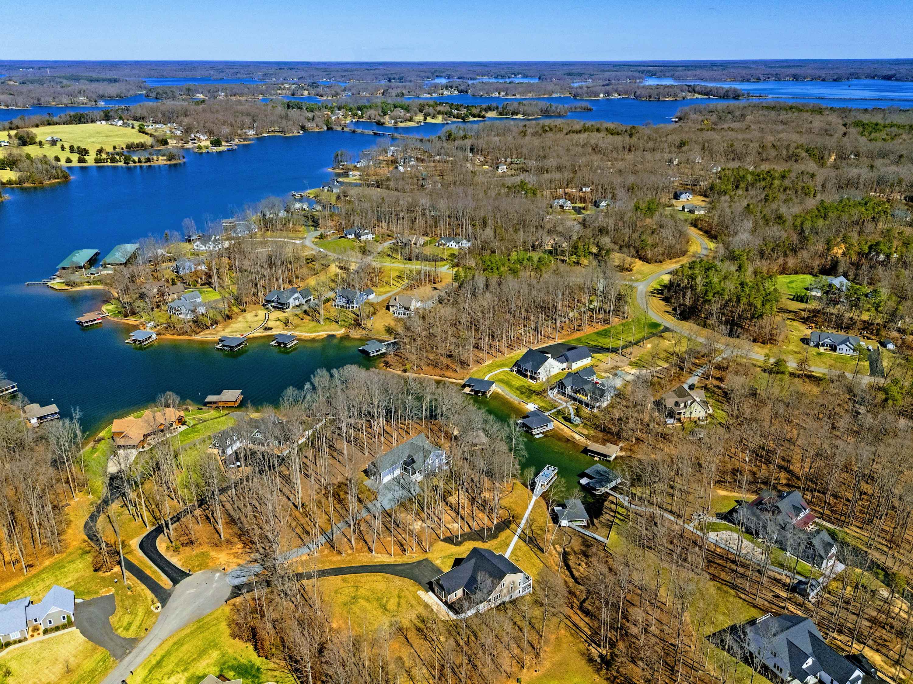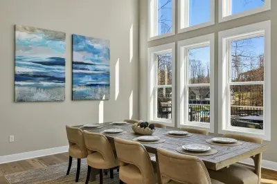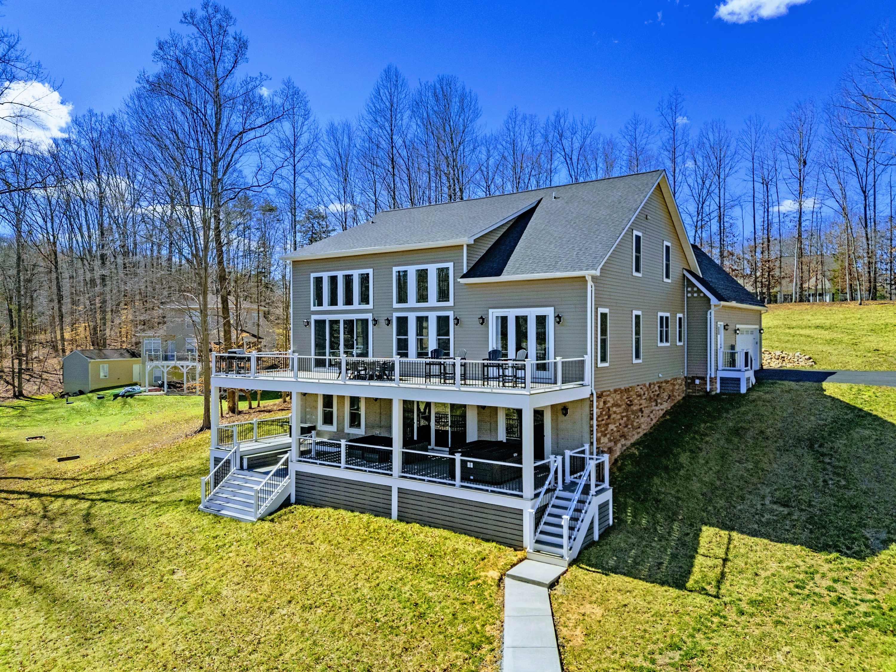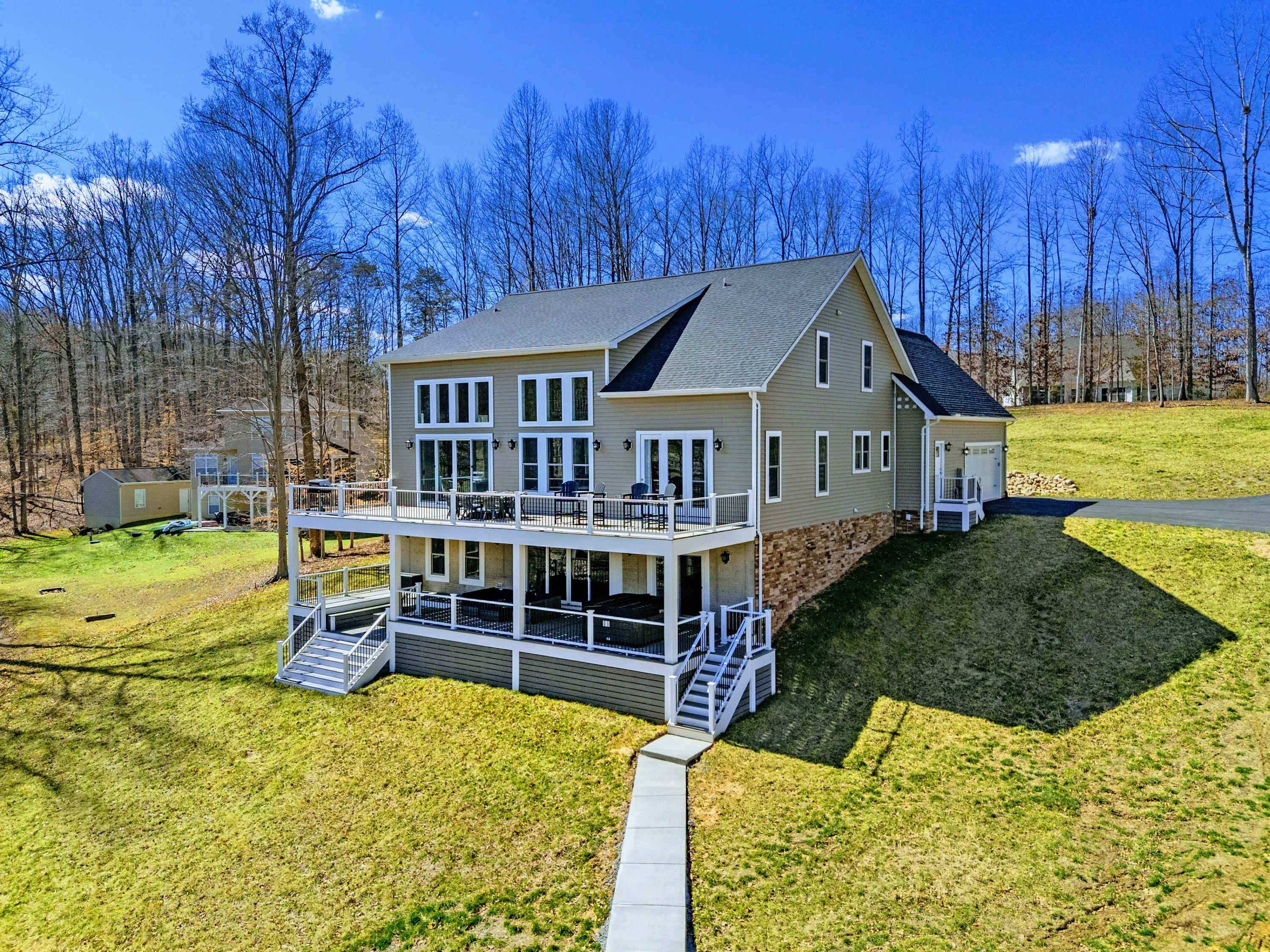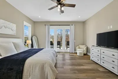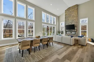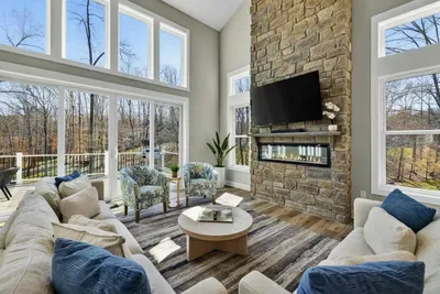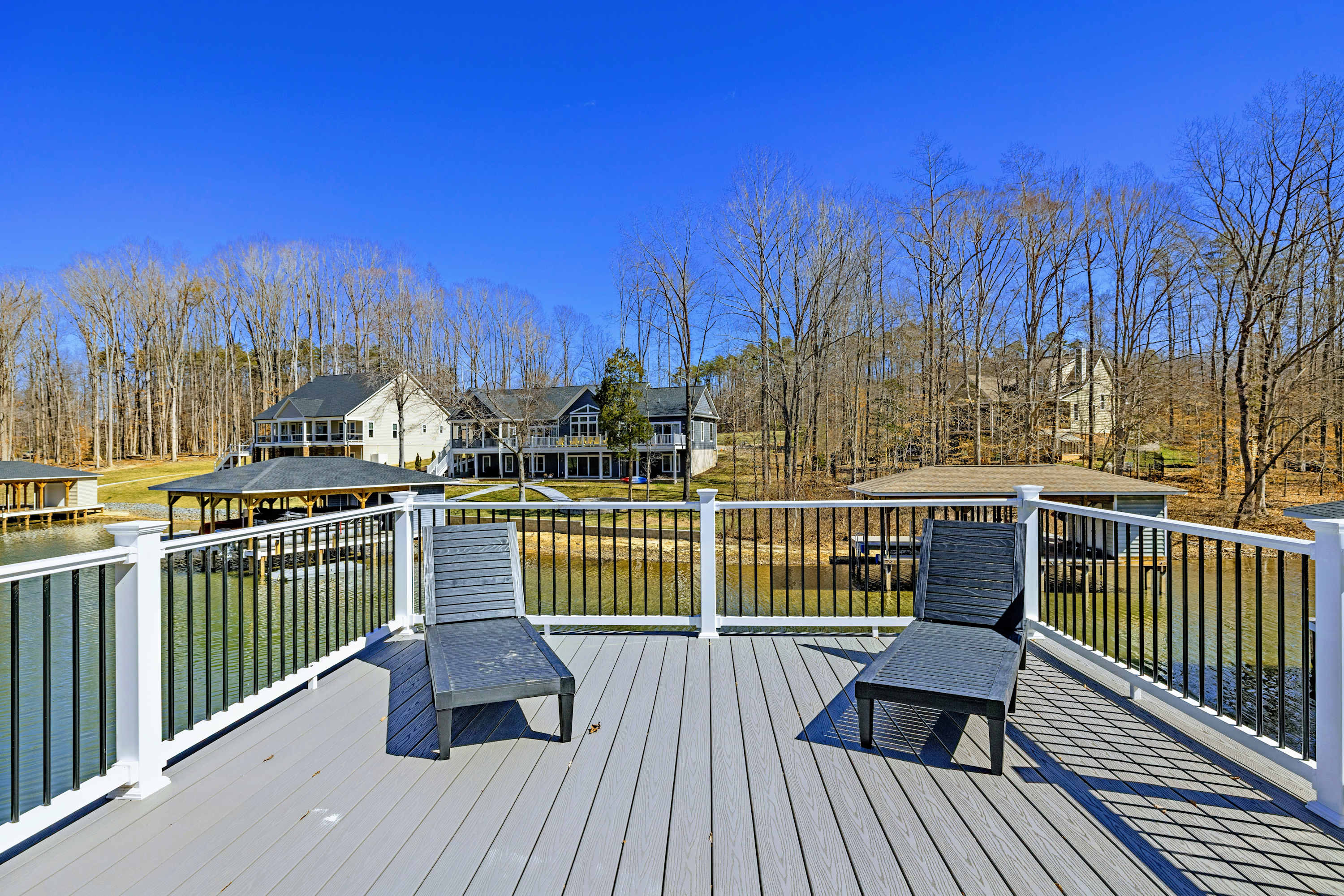Experience comfort and space at this brand new 4,846-square-foot lakefront estate on the private, warm side of Lake Anna. High Watermark sits on a quiet cove off Deep Creek with a covered boathouse and boat slip, giving guests calm, protected water right at the back door. Five bedrooms, 4.5 baths, and three levels of living designed to give 17 guests room to breathe while keeping everyone together.