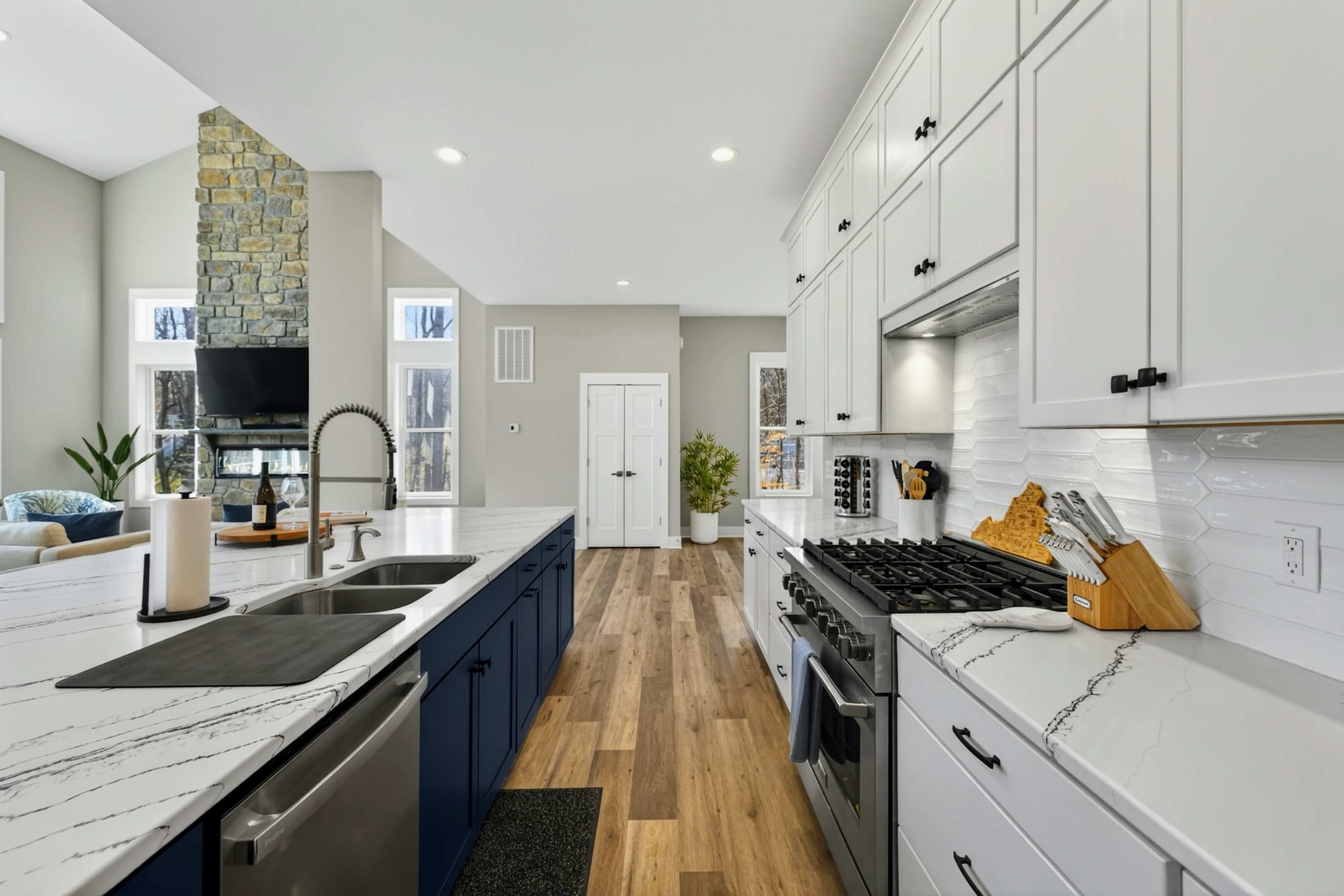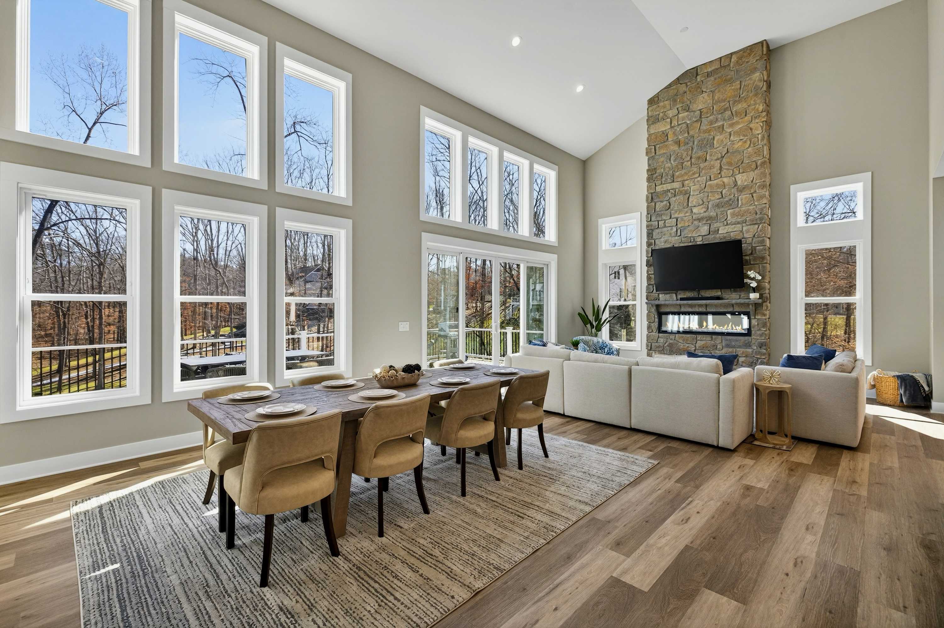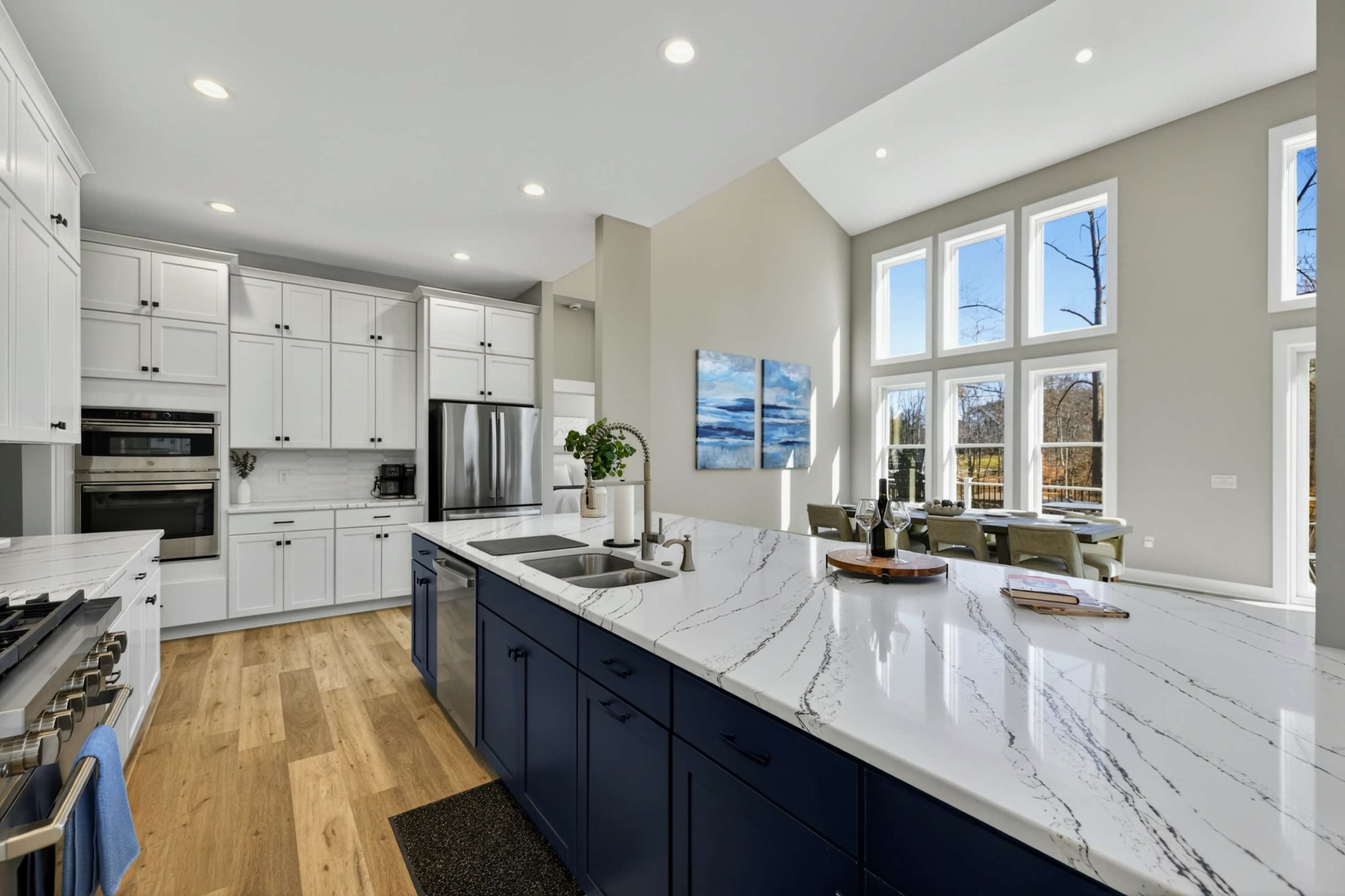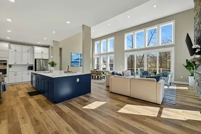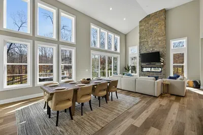 The great room is the center of the home. Floor-to-ceiling windows frame the cove and lake beyond, and the open layout flows from the chef's kitchen through the dining area and living room onto the west-facing deck. The kitchen is built for real cooking — gas range, professional hood, large island with bar seating, full suite of appliances, and enough counter space for multiple cooks at once. The dining table seats the full group.