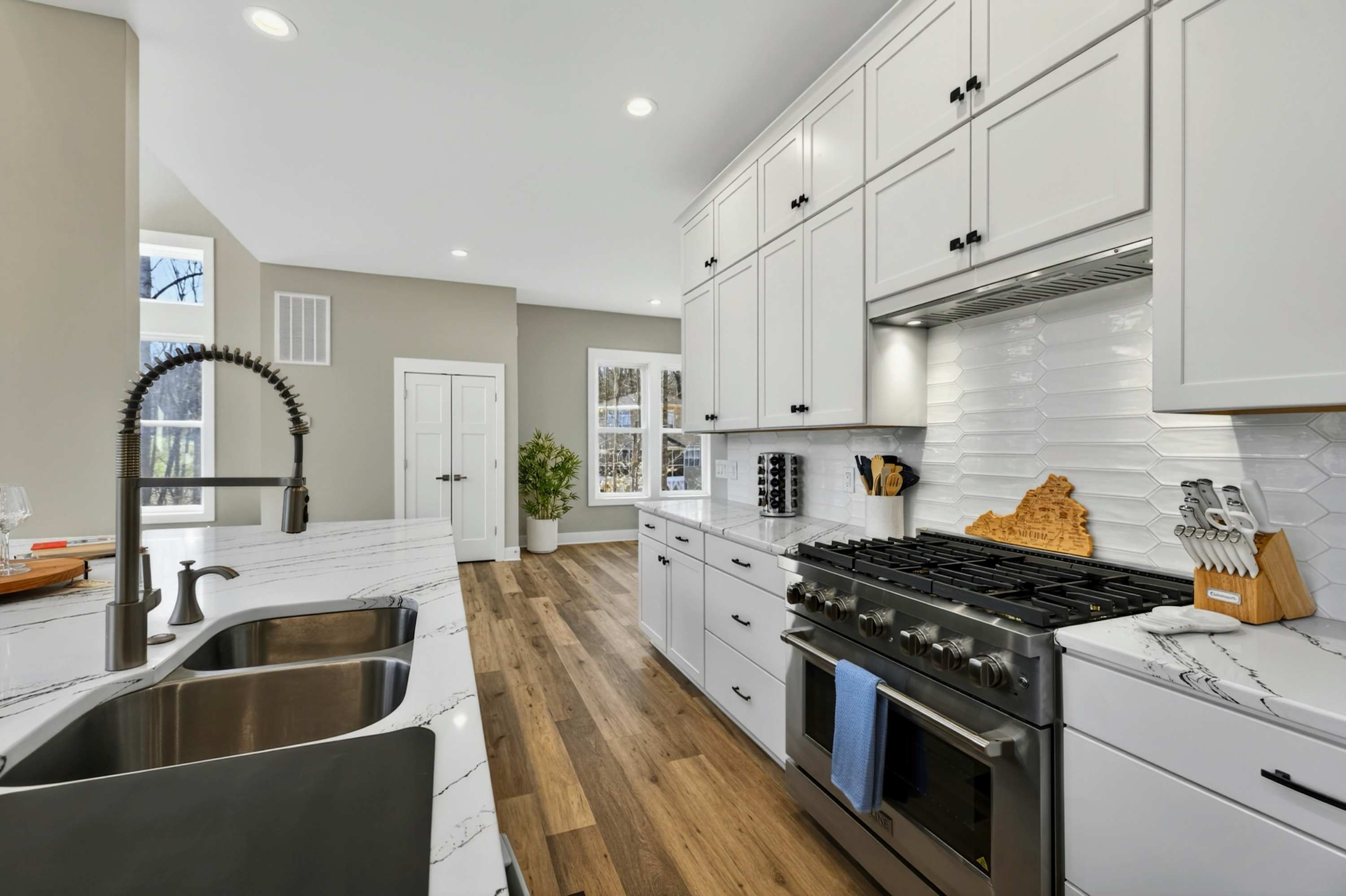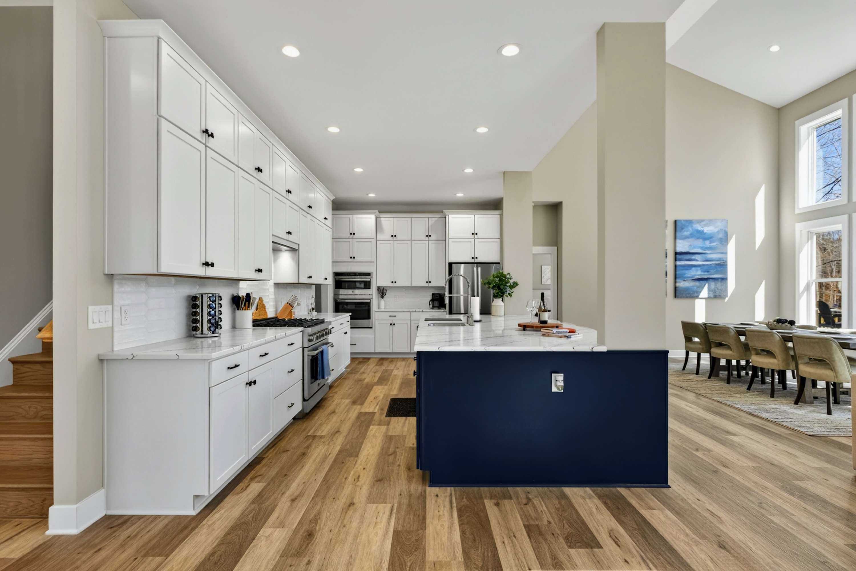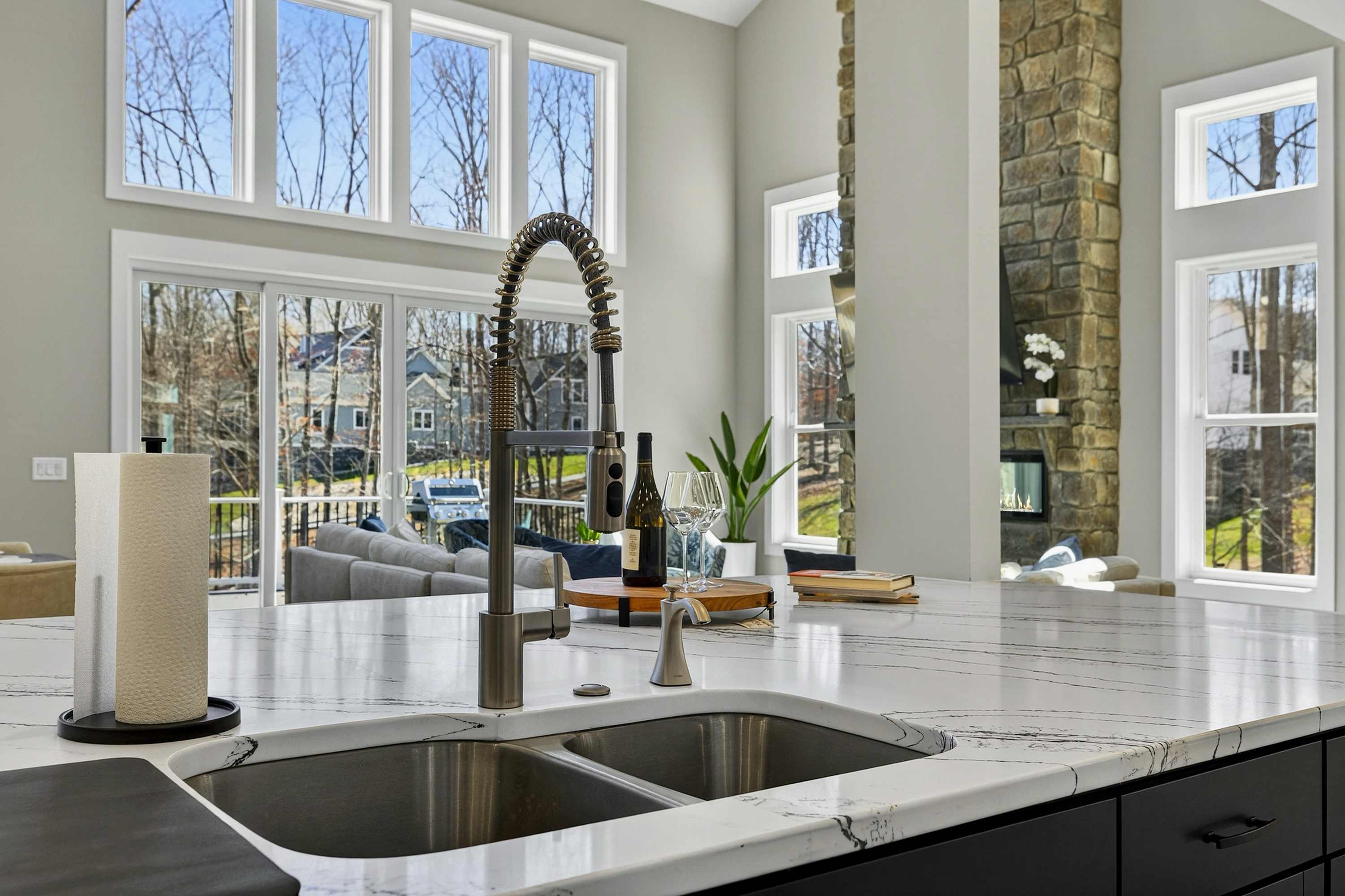 The great room is the center of the home. Floor-to-ceiling windows frame the cove and lake beyond, and the open layout flows from the chef's kitchen through the dining area and living room onto the west-facing deck. The kitchen is built for real cooking — gas range, professional hood, large island with bar seating, full suite of appliances, and enough counter space for multiple cooks at once. The dining table seats the full group.
