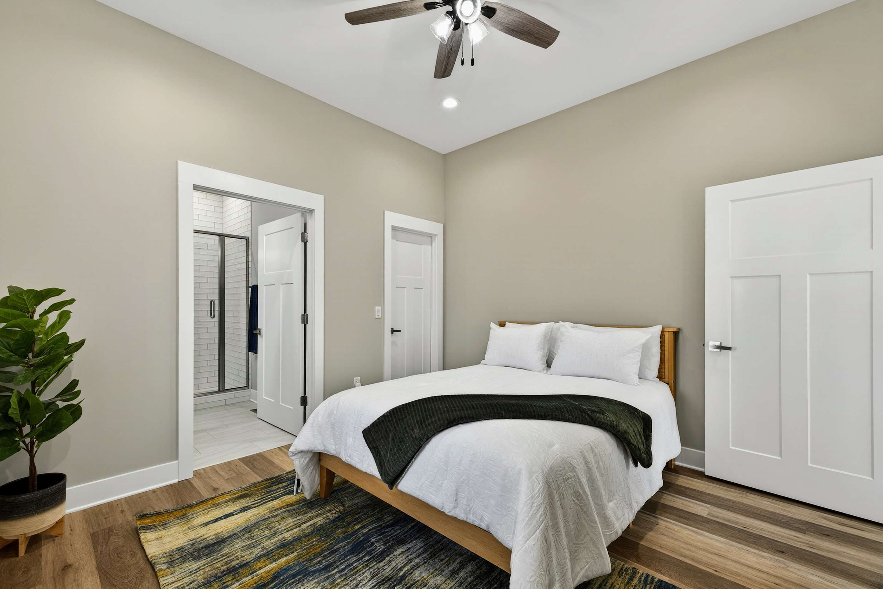 - Bedroom 2: Queen bed, ensuite bath with shower