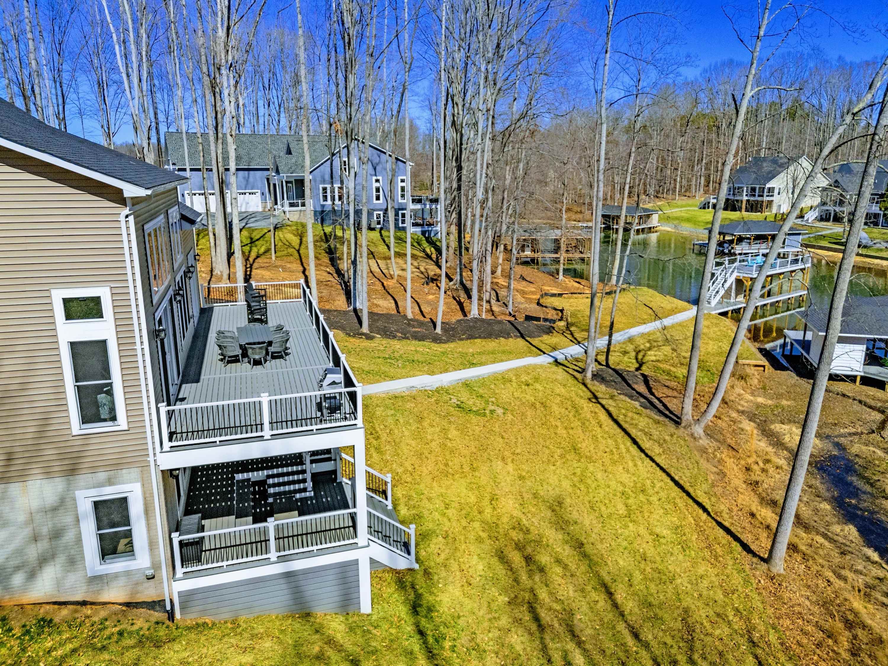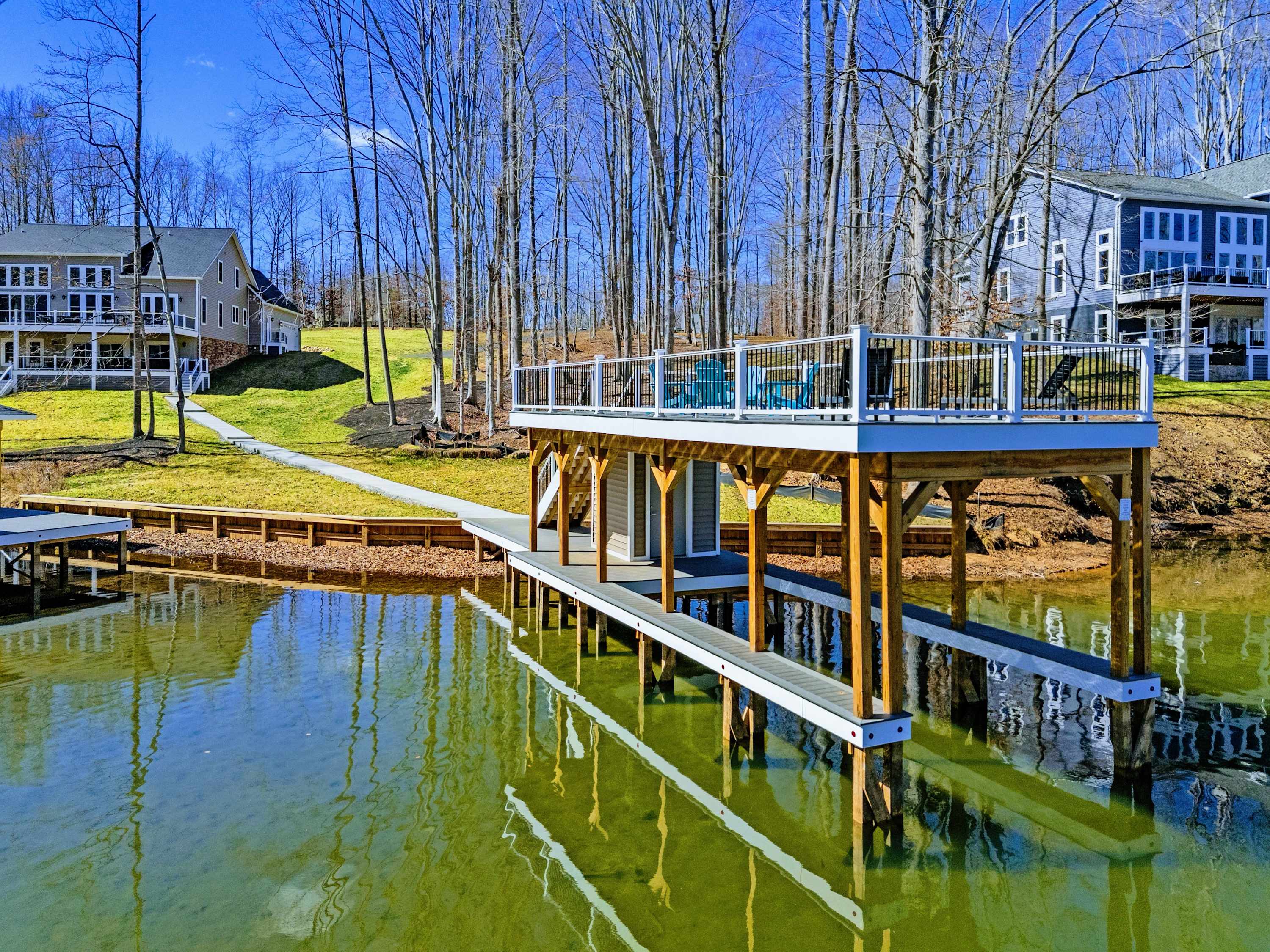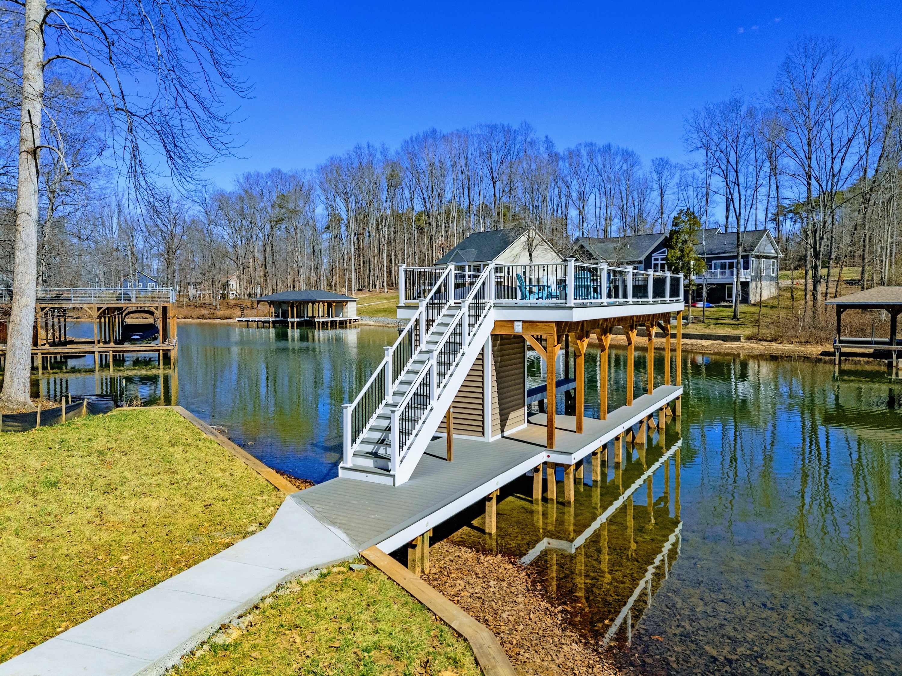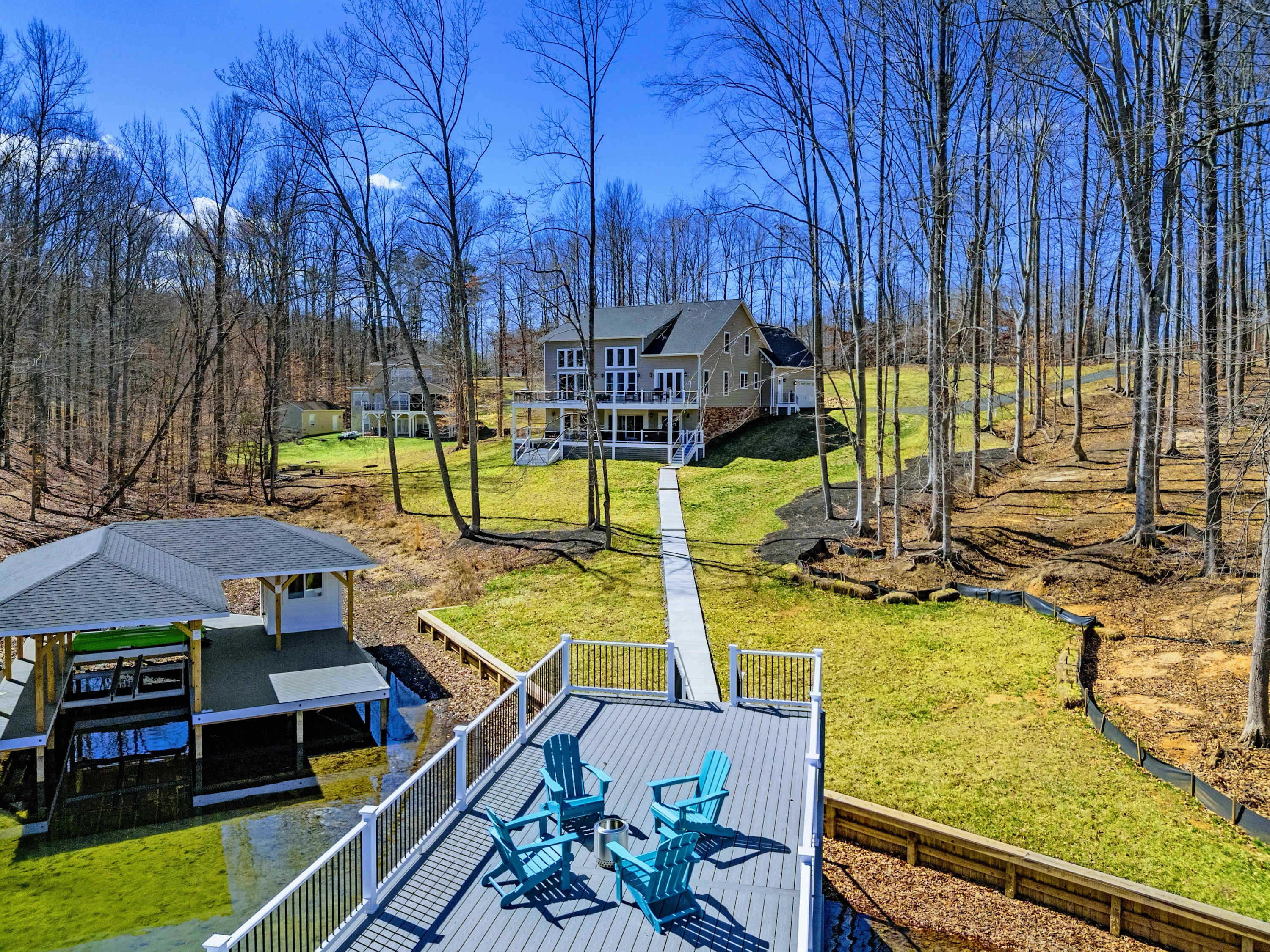 The covered boathouse and boat slip sit at the end of the dock, with calm cove water ideal for swimming, kayaking, or sitting with a drink at sunset. Kayaks are included — no rental needed. The flat, open lawn between the house and water is made for yard games or lawn chairs.
