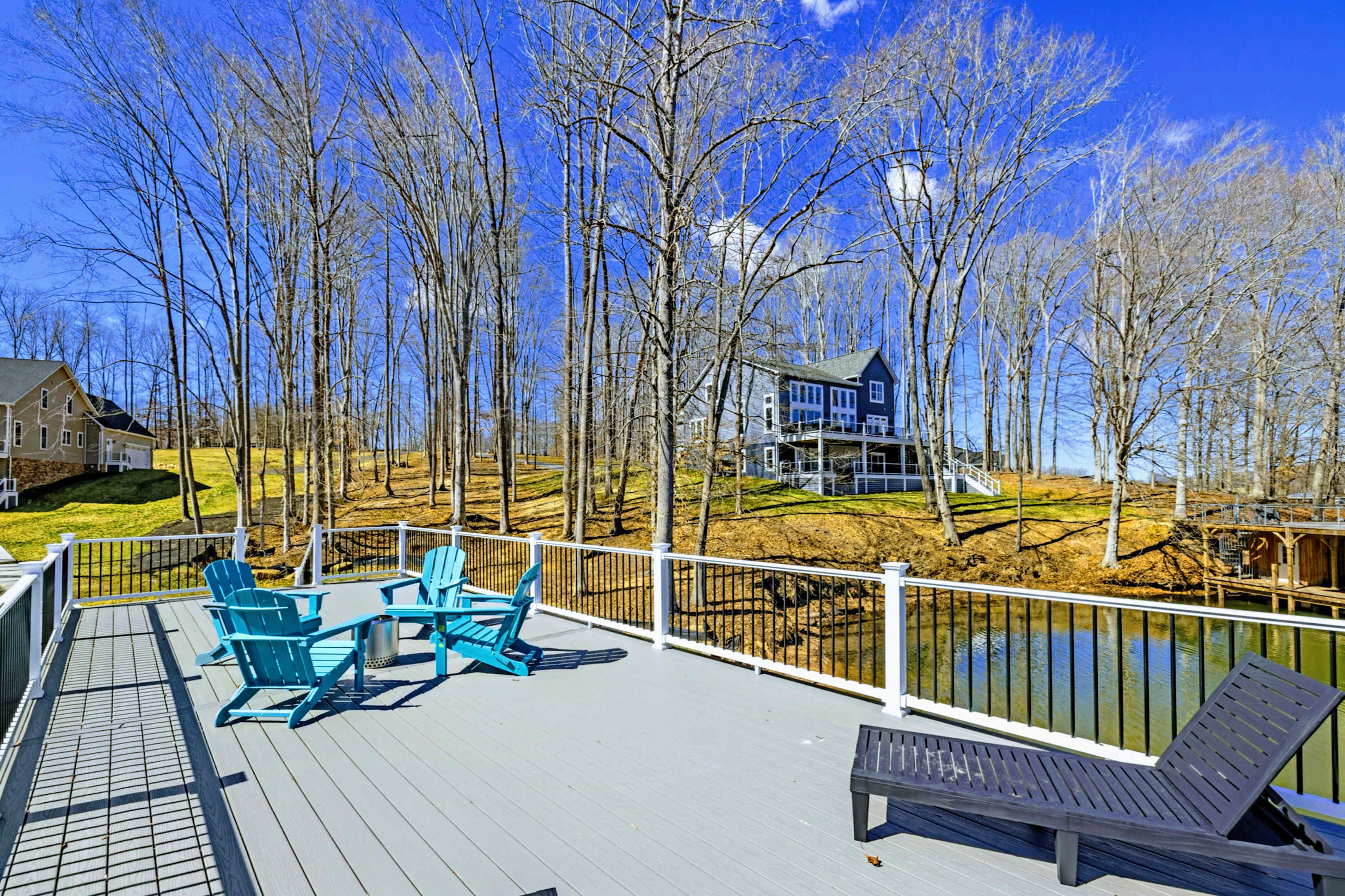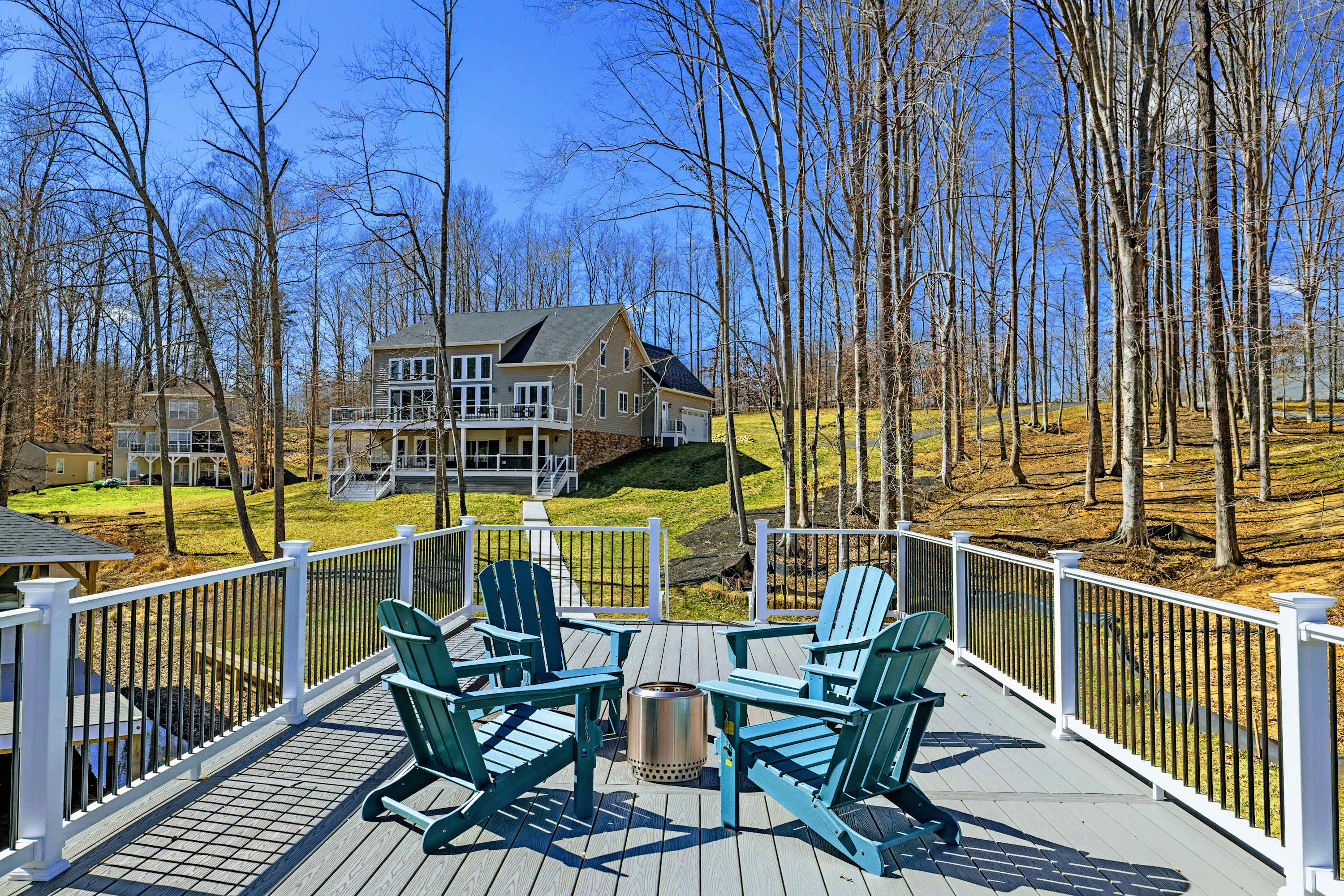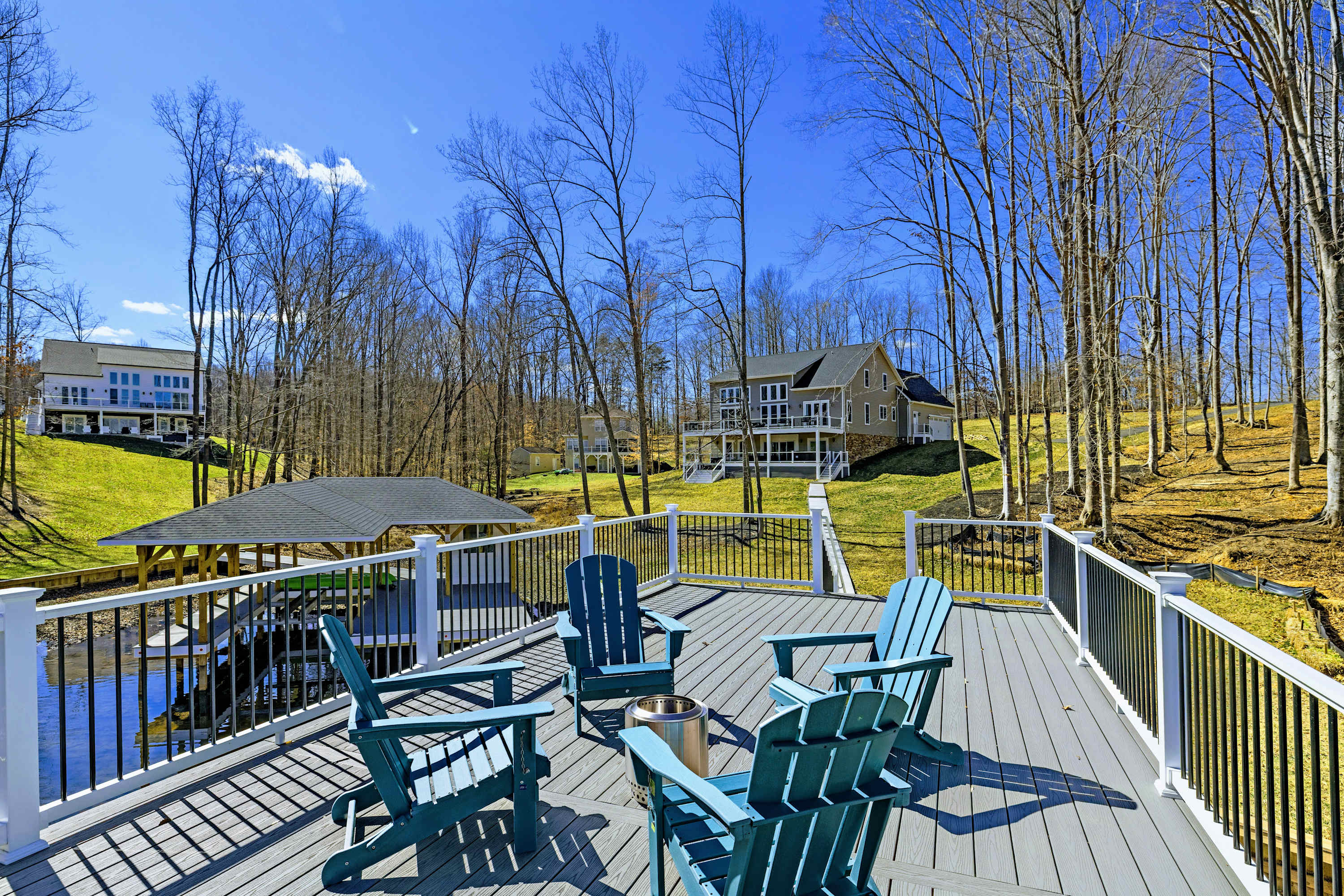 - Fire pit with Adirondack seating at the water's edge