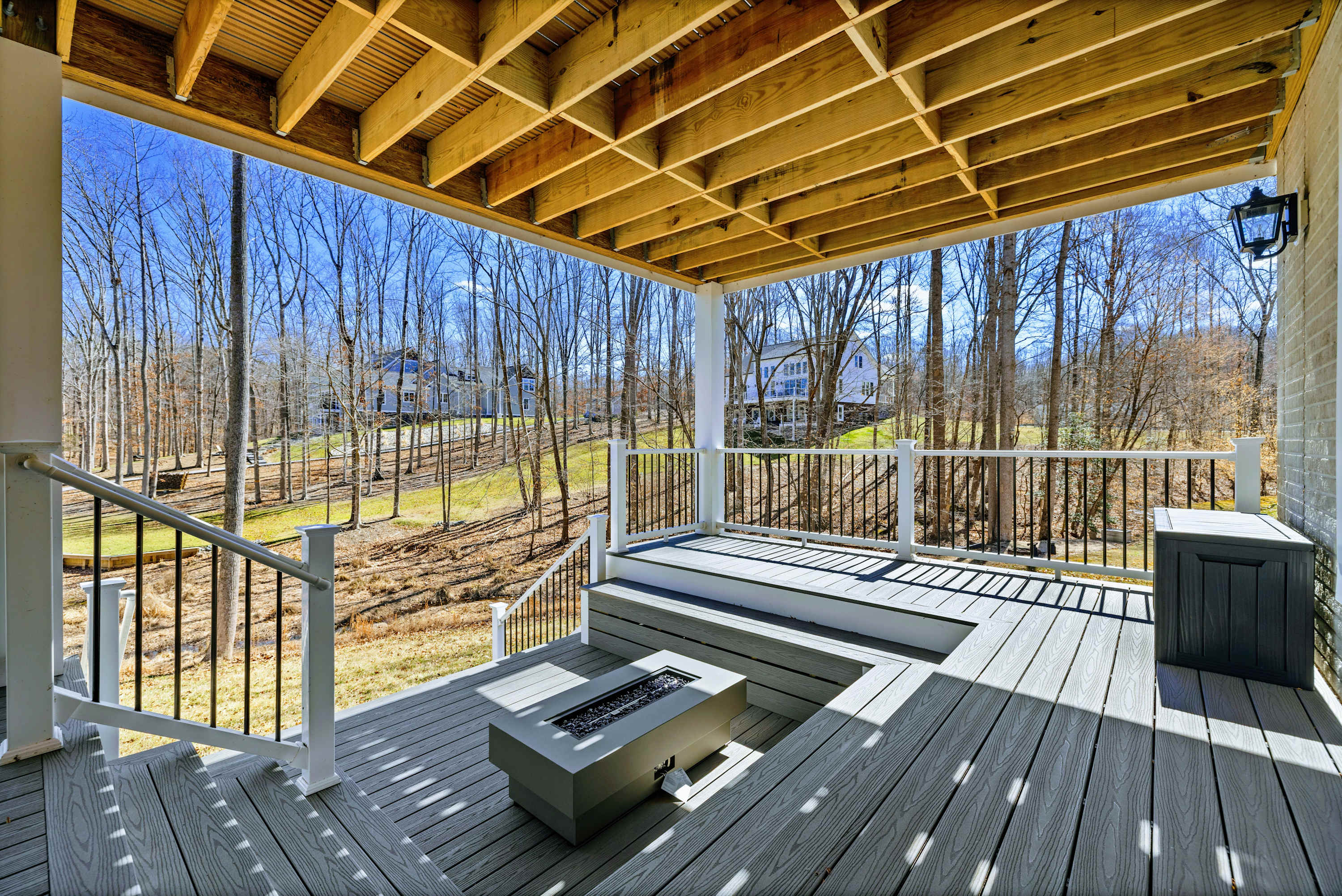 - West-facing deck: outdoor dining, fire pit, hot tub with cove views