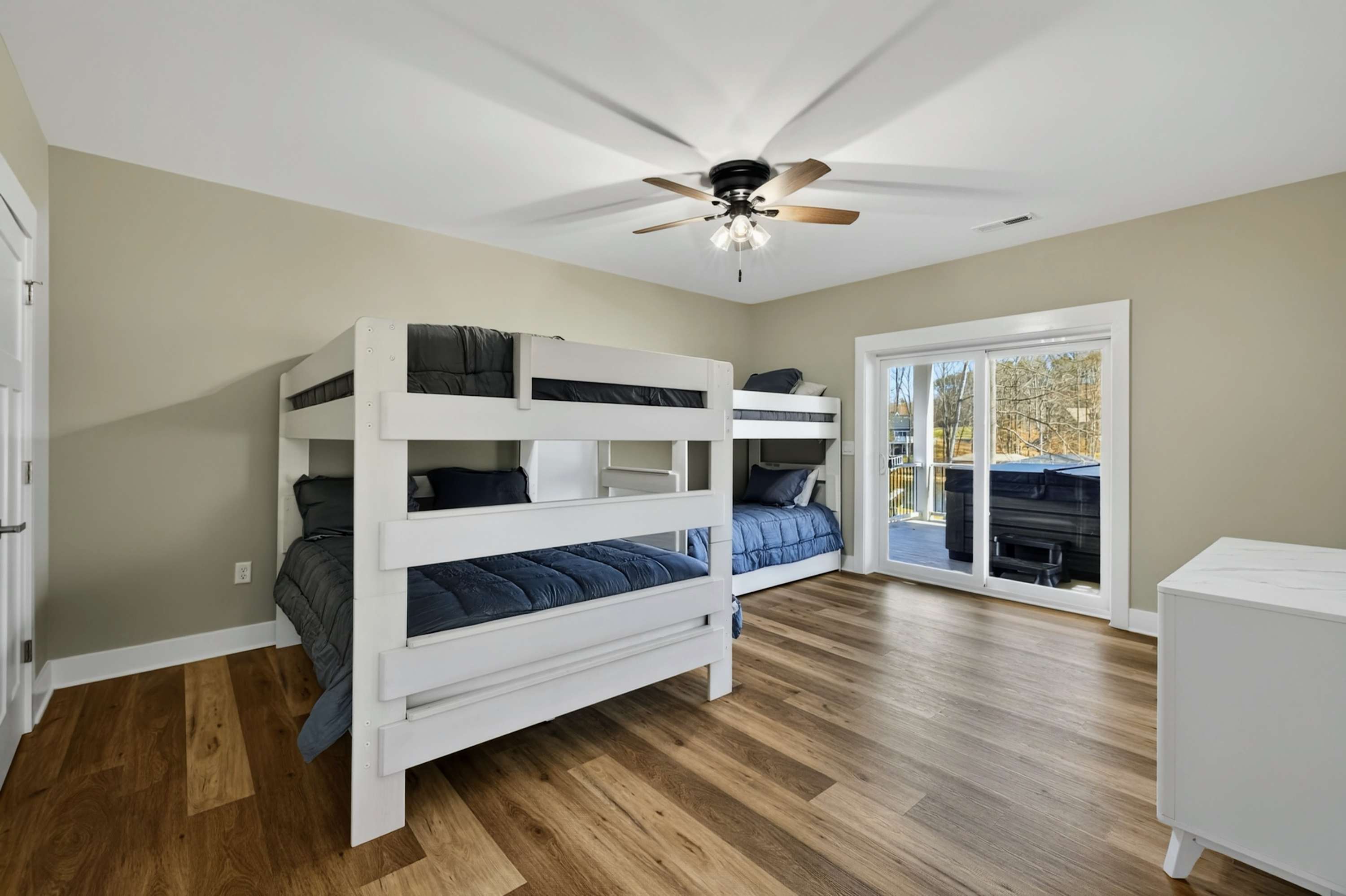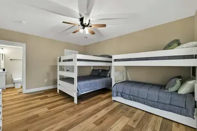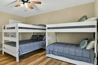 - Bedroom 5 (Bunk Room): 2 queen-over-queen bunks, 1 twin bunk with trundle — the room younger guests claim first