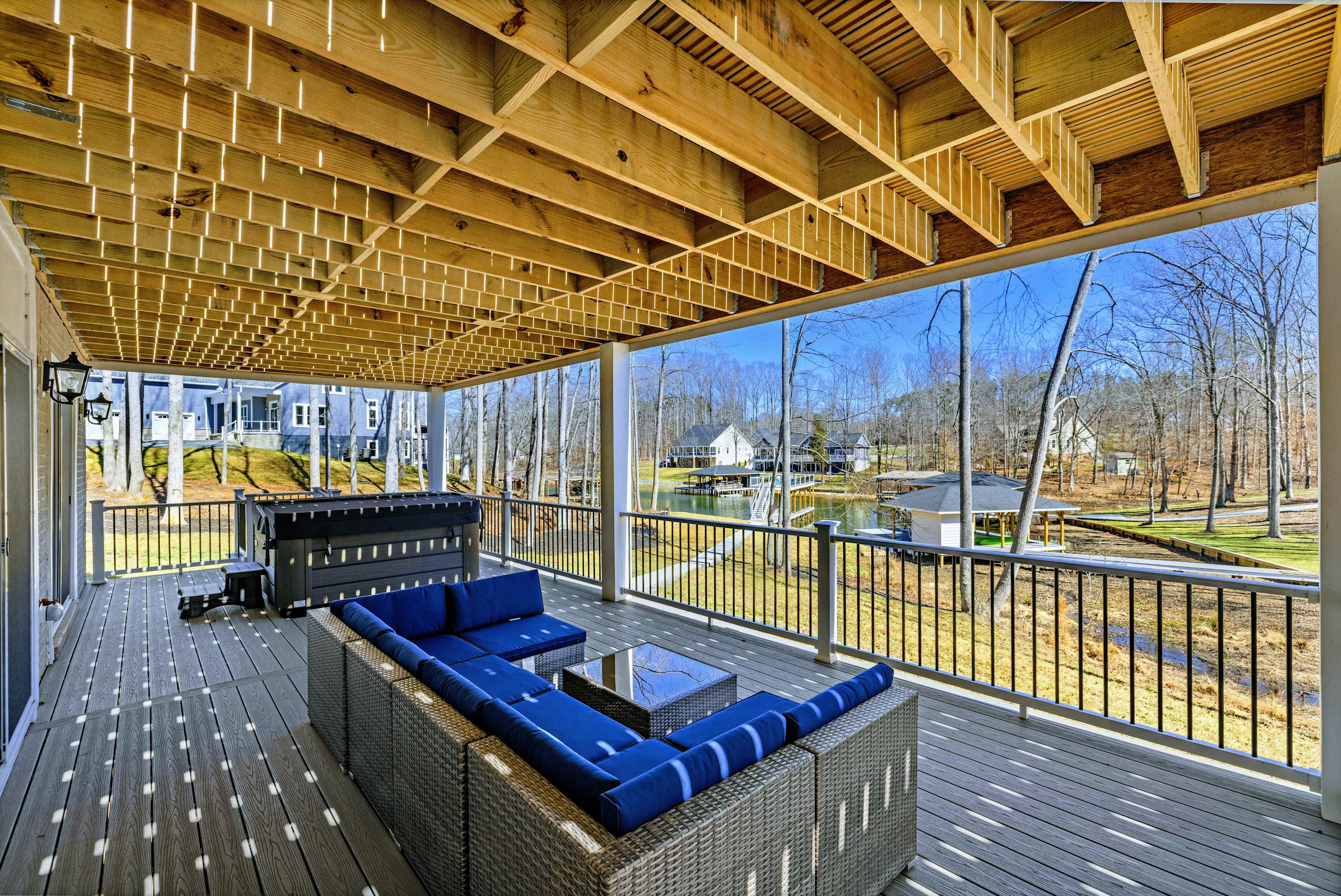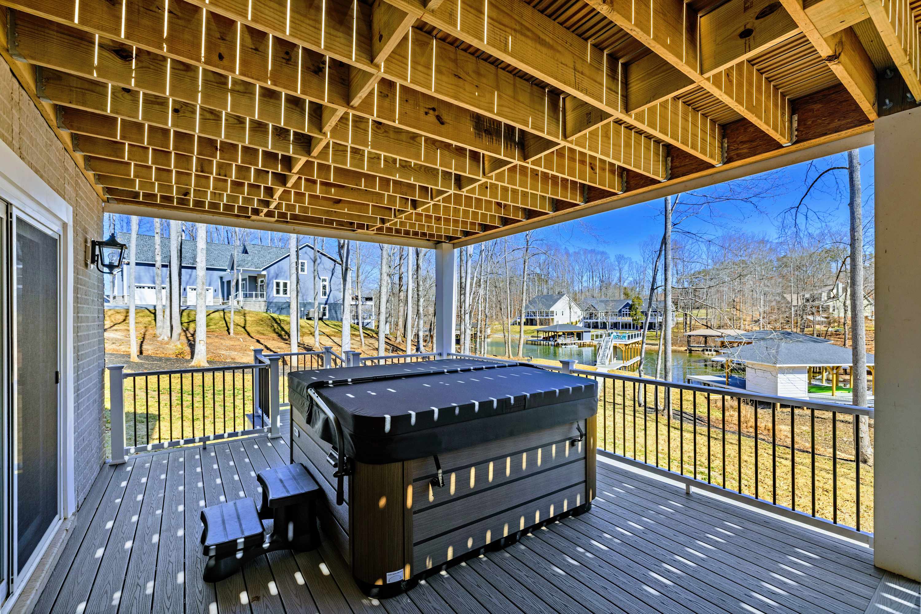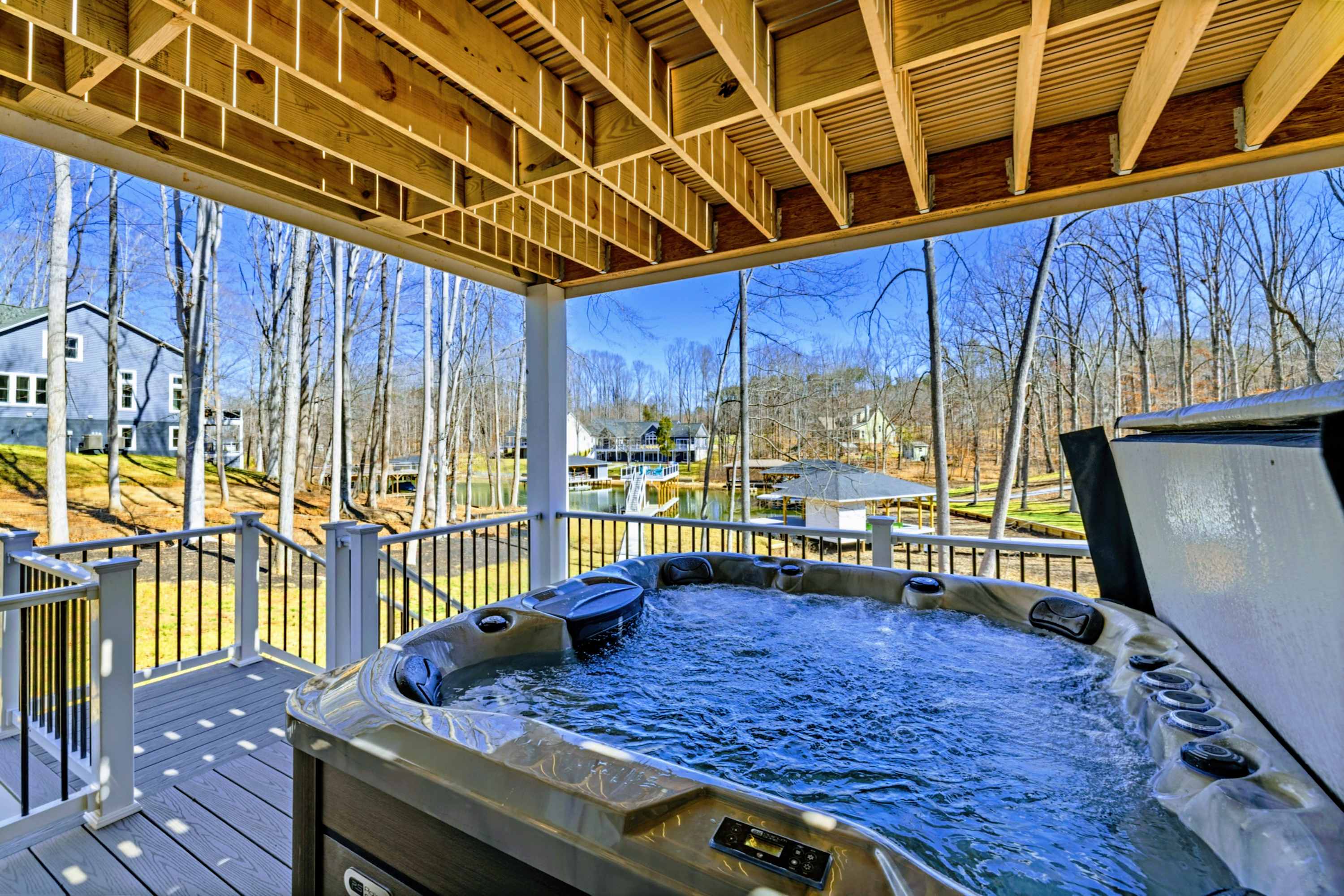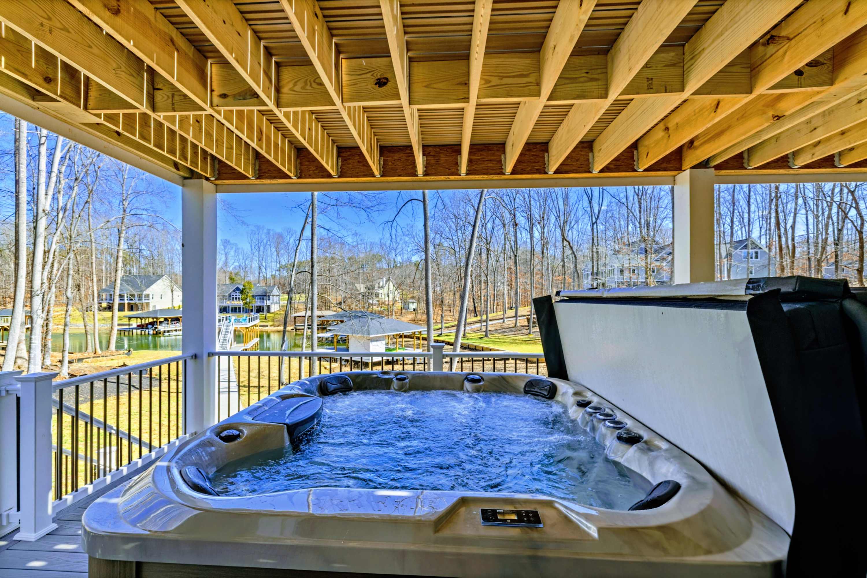 Perched on the deck above the waterline with an unobstructed view of the cove. Soak after a full day on the lake and watch the stars come out.