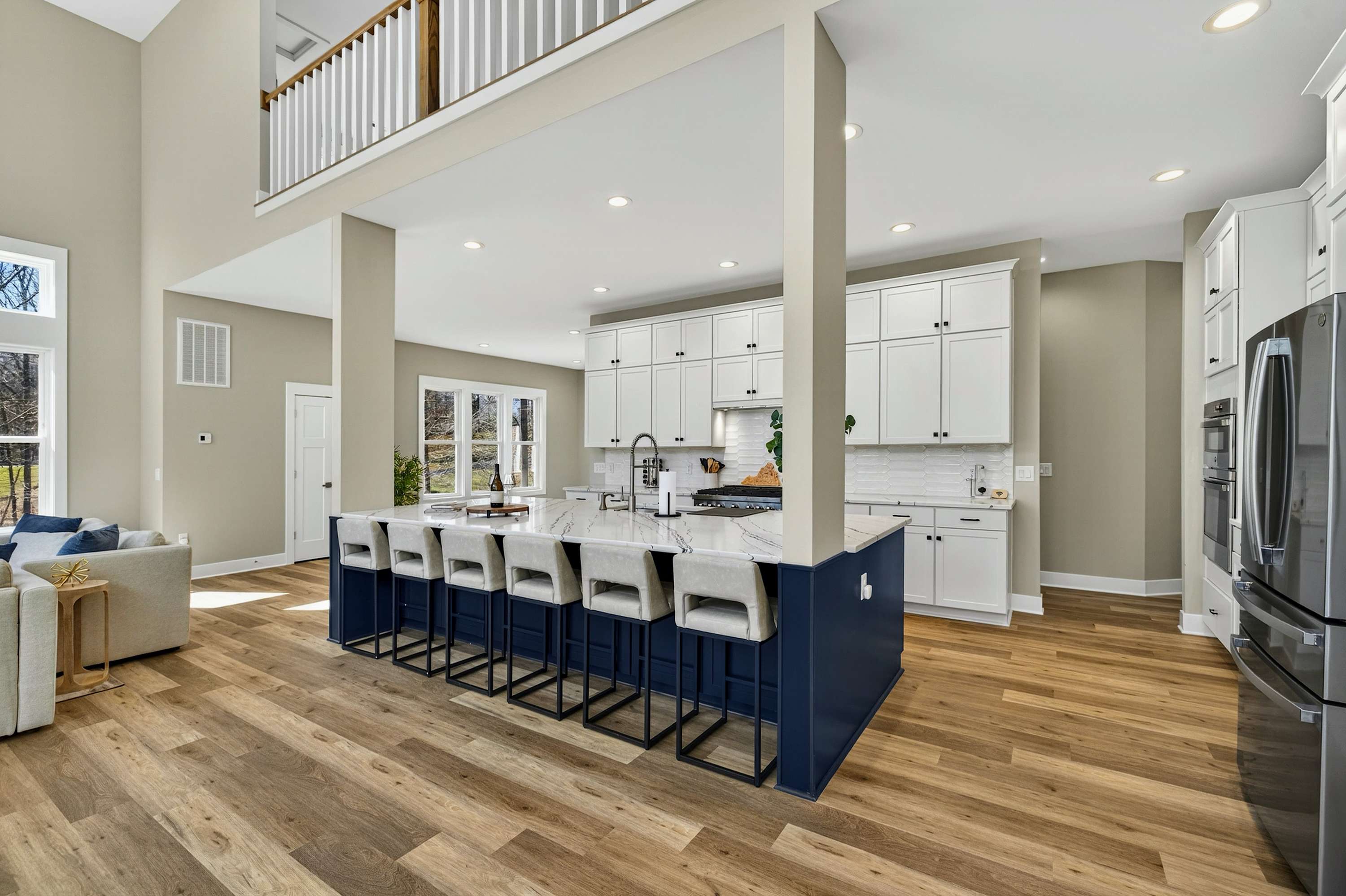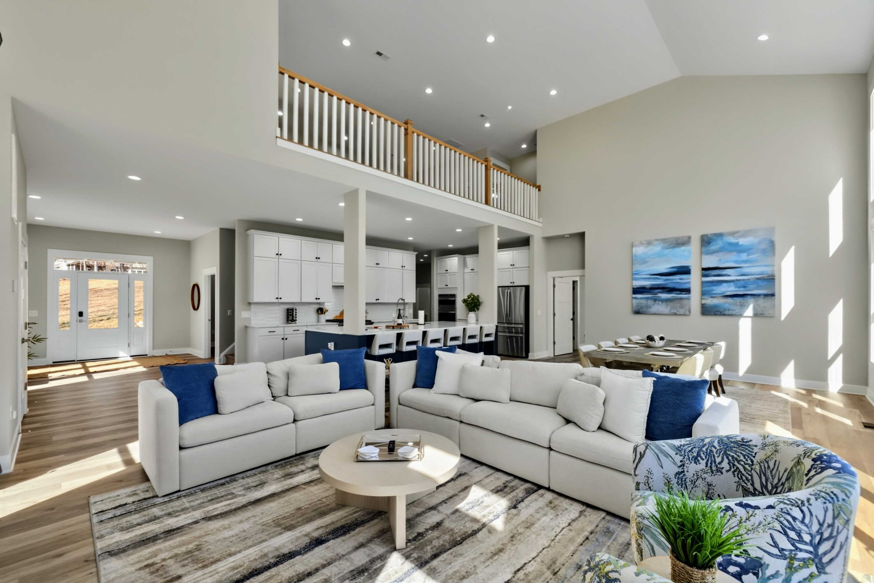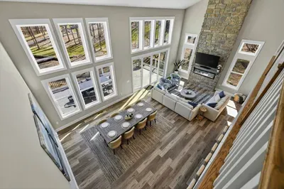 The upper level holds two bedrooms and an open loft above the great room with long sightlines down to the living area and out to the lake. A convertible sofa in the loft offers an additional sleeping option for larger groups.