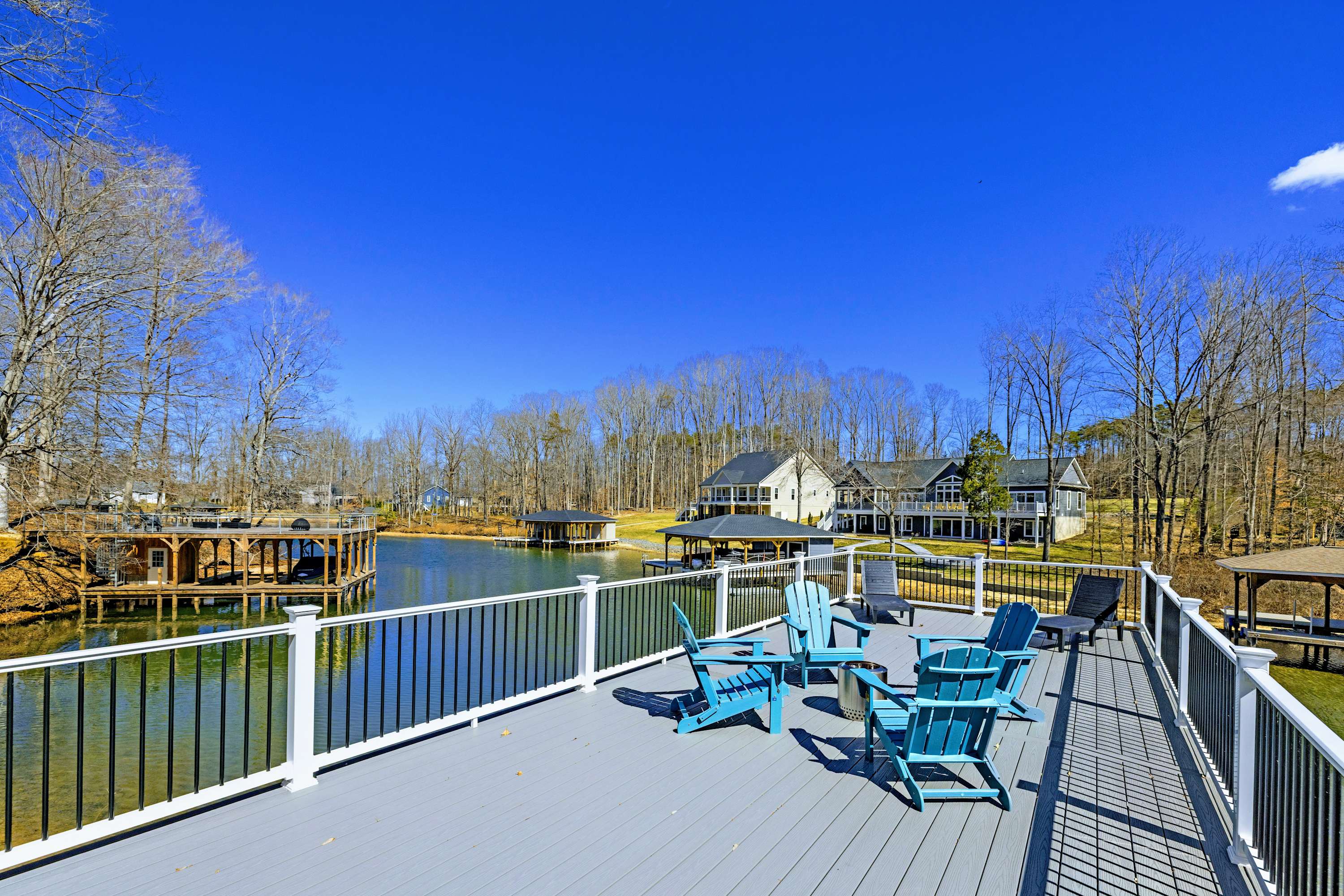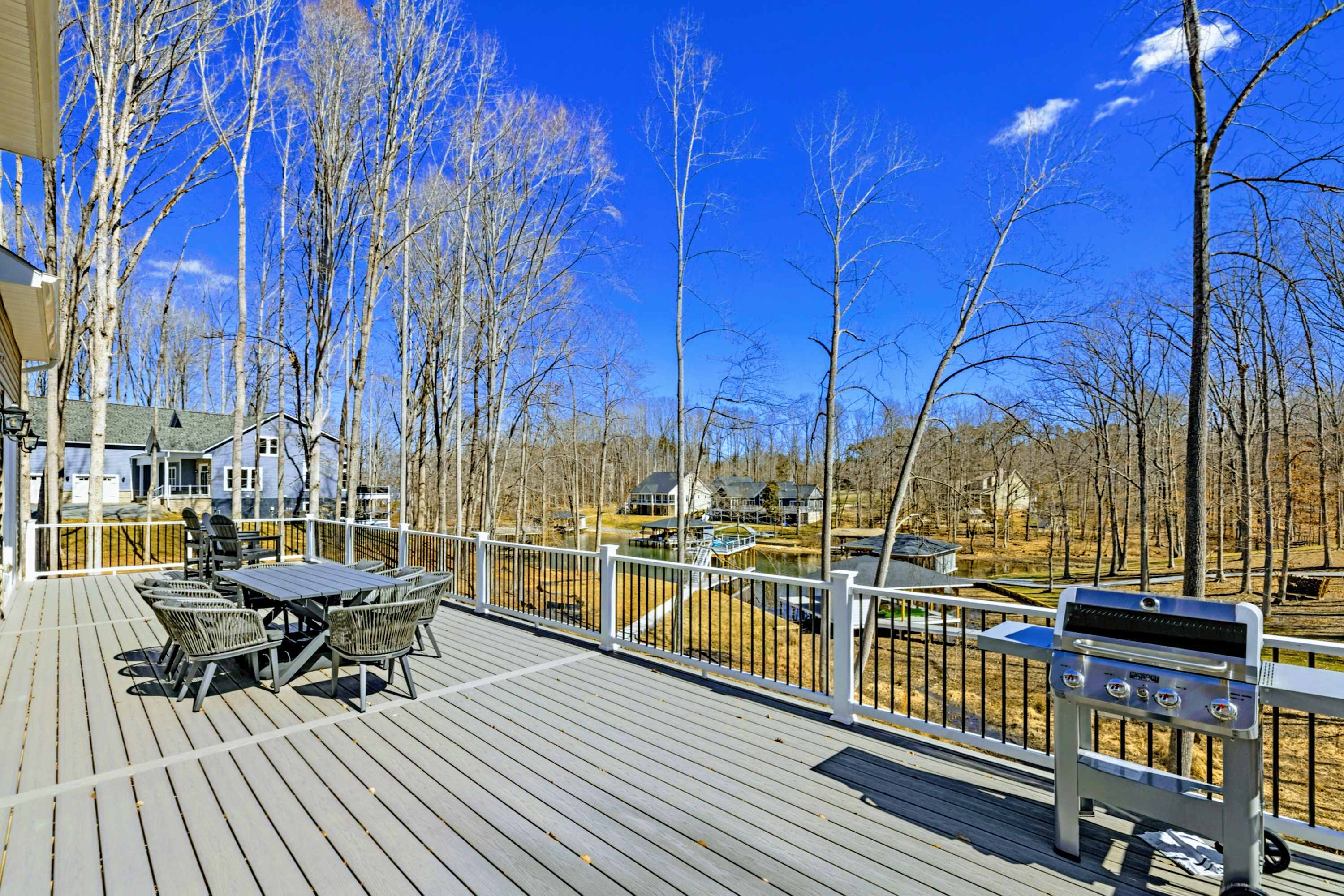 High Watermark is a 4,846-square-foot lakefront estate on the private, warm side of Lake Anna — set on a quiet cove with a covered boat slip and boathouse, hot tub overlooking the water, and a west-facing deck built for sunsets. The home sleeps 17 across five bedrooms with room for everyone to spread out and still end up together.