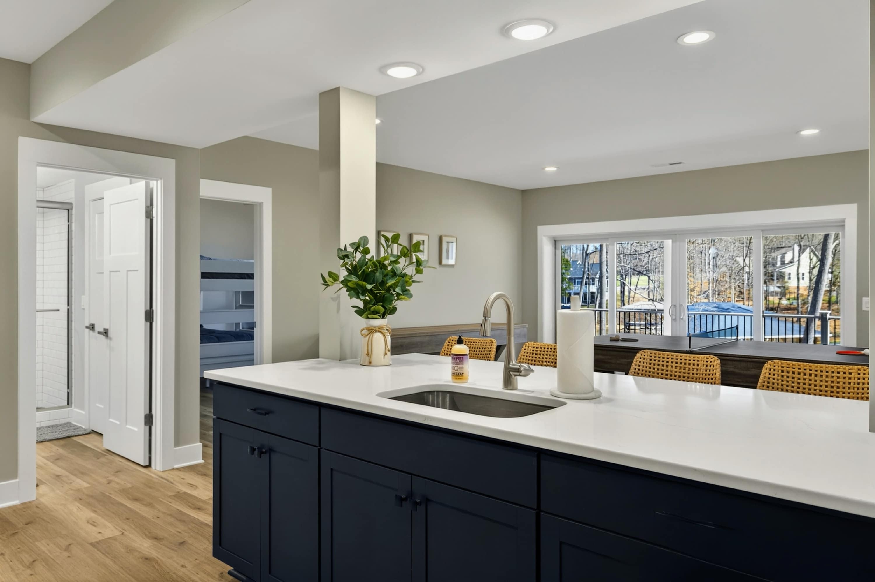 The main level lives wide open: a chef's kitchen, long dining table, and great room with floor-to-ceiling lake views that spill onto the deck. When the sun drops, the entertainment floor takes over — a game room with pool table, ping pong, and more, anchored by a wet bar and a private theater with reclining seats.