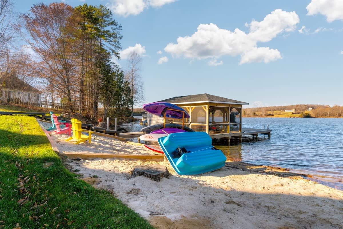 Welcome to License to Chill, a stunning lakefront retreat on Virginia’s Lake Anna, perfect for family reunions or group getaways. This brand new spacious home features a game room, fully equipped modern kitchen, and a massive great room with vaulted ceilings and floor-to-ceiling windows with blue water views. Outdoors you will find an expansive deck overlooking Lake Anna, a firepit for s’mores and stargazing, and a private dock, beach and kayaks for endless water fun!