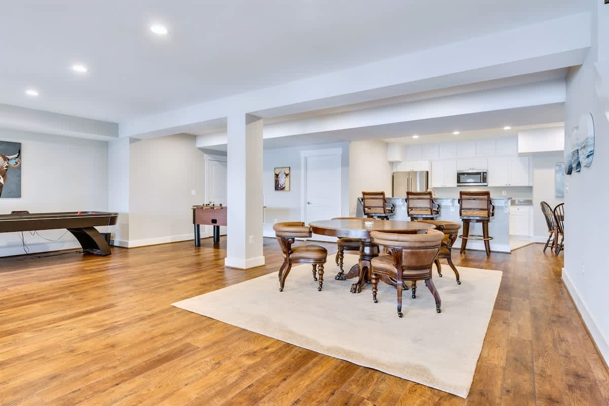 Inside, entertainment options abound. The game room comes complete with a kitchen, wet bar, shuffle board table, air hockey, and foosball table. The main living area exudes a sophisticated clubhouse vibe with its vaulted ceilings, floor-to-ceiling windows, and a massive TV above the fireplace. The open floor plan encourages a sense of togetherness, allowing conversations to flow seamlessly throughout the space.