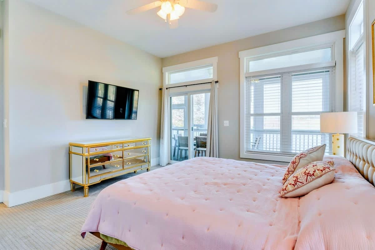 The gourmet kitchen is equipped with state-of-the-art stainless steel appliances and a floating island breakfast bar, perfect for cooking up delicious meals. Enjoy these meals at the large formal dining table, where you can create cherished memories over home-cooked dinners or family game nights. The luxurious primary bedroom offers a private sanctuary with balcony access, a TV, and a lavish en suite bathroom featuring a double-sink vanity, a soaking tub, and a spacious walk-in shower. With plenty of additional bedrooms and bathrooms, every guest will feel comfortable and well-accommodated.
