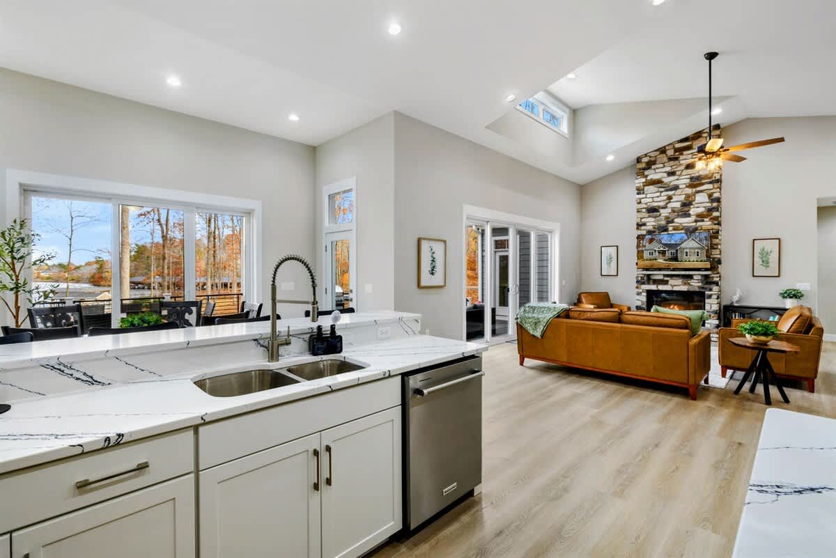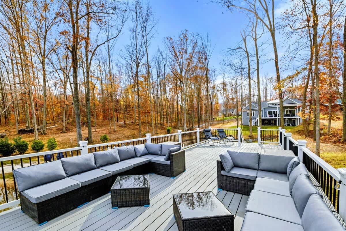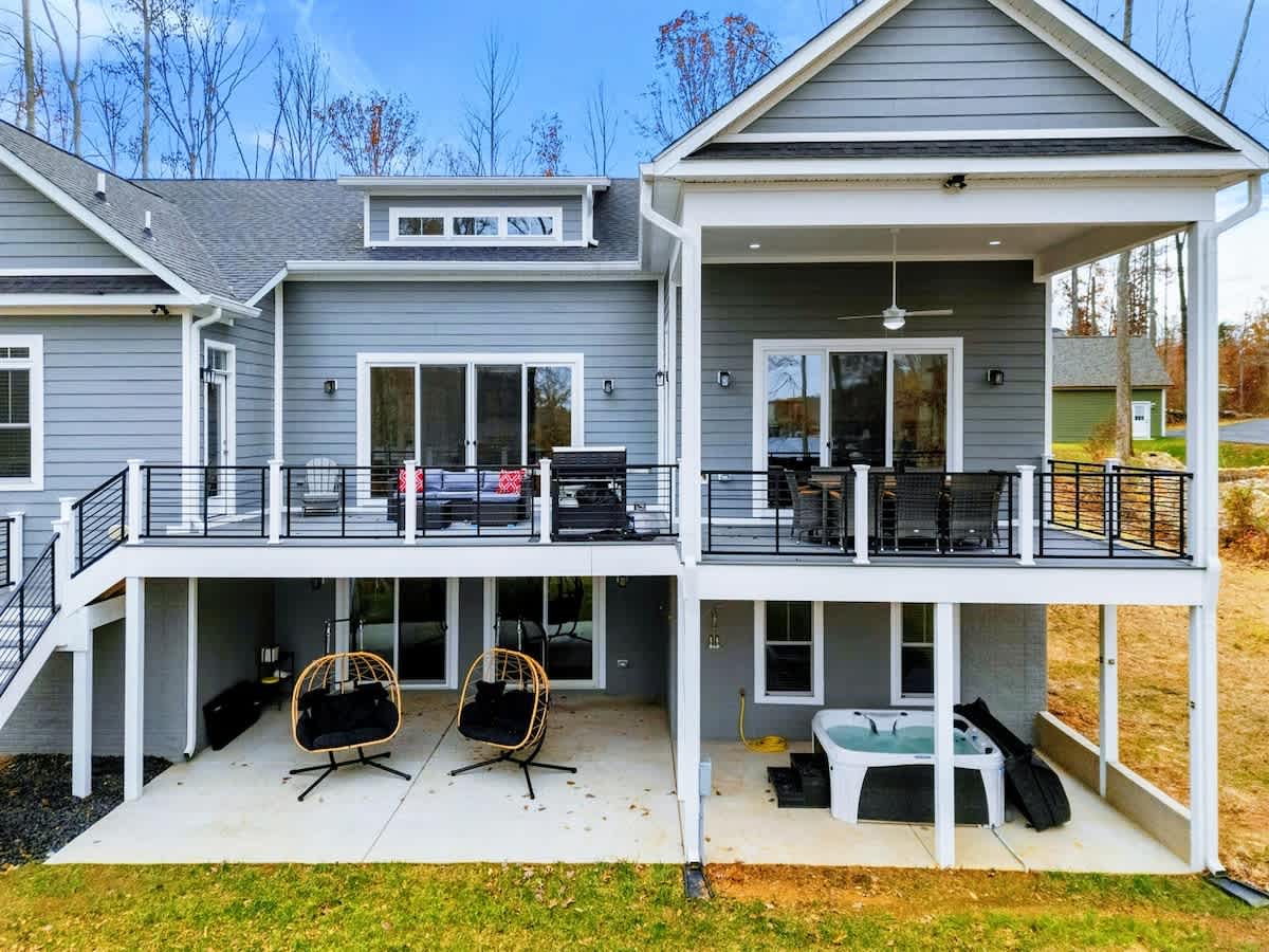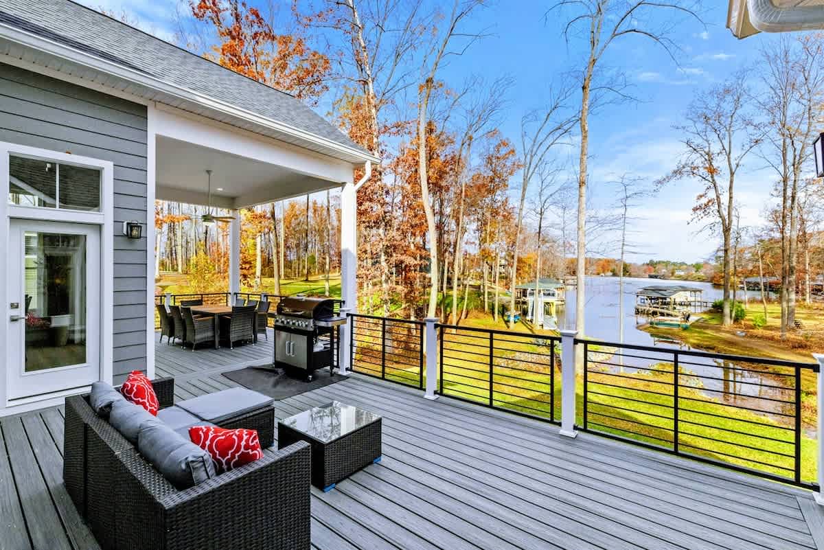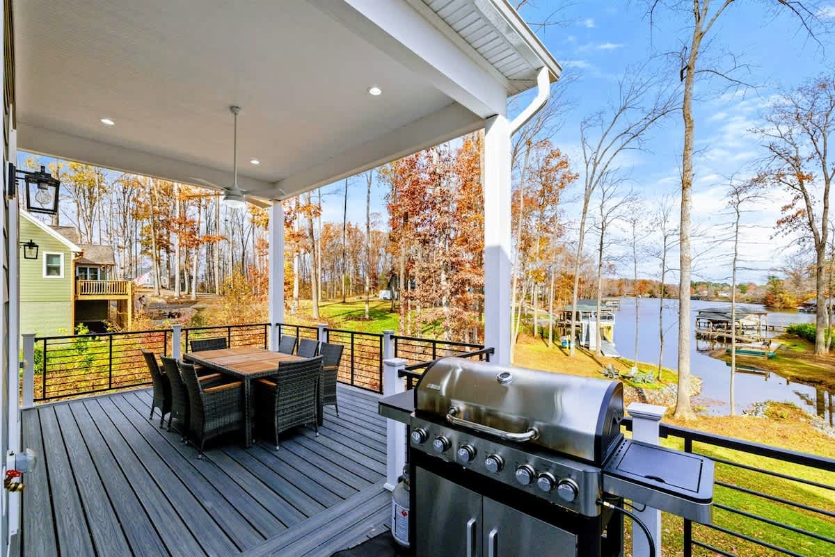 Experience comfort and luxury at our brand new and spacious lakefront home on the Private Side of Lake Anna. This beautiful home is located on a large lot in a quiet cove. You can swim, explore with kayaks, lay out on the dock's open deck area, or simply relax on the covered lounge area, enjoying the serene view of the beautiful lake! Roast some delicious s'mores outside using our outdoor fire pit, or have a BBQ using our grill on the deck. Enjoy the blue water views from atop of our massive deck. We have an open floor plan and offer 2 living areas including the main great room with a gas fireplace, and a lower level game room with pool table, ping pong table, shuffleboard, arcade game, xbox, and other games. Relax in the spacious main great room with water views through the huge bright windows, a gas fireplace, and 4K Smart TV. Use the High Speed Internet and free Wi-Fi network to stream your favorite shows while you FaceTime everyone! The home can sleep 16 with 4 bedroom suites including 2 King Suites, 1 Queen Suite, and a Bunk Bedroom Suite. The main floor has an open floor plan with a great room and adjacent large kitchen, dining area, primary suite (King bed), second bedroom suite (King bed), third bedroom suite (Queen bed), and laundry room. The lower level has the massive game room, and Bunk Bedroom Suite (4 Twin over Double Bunk beds).