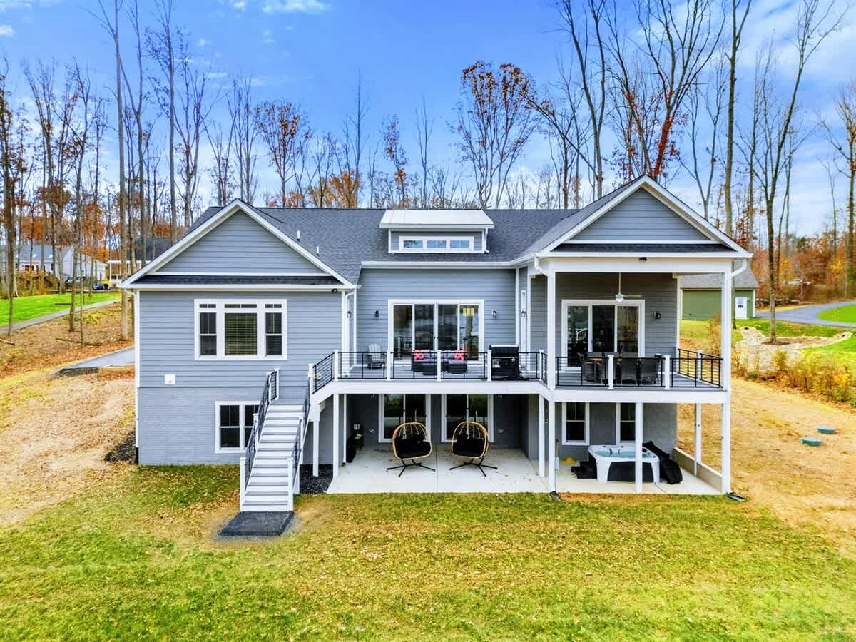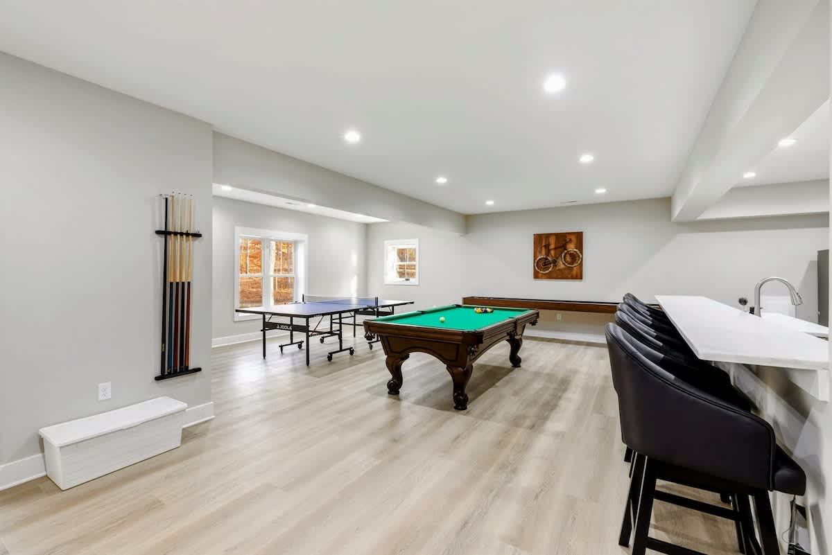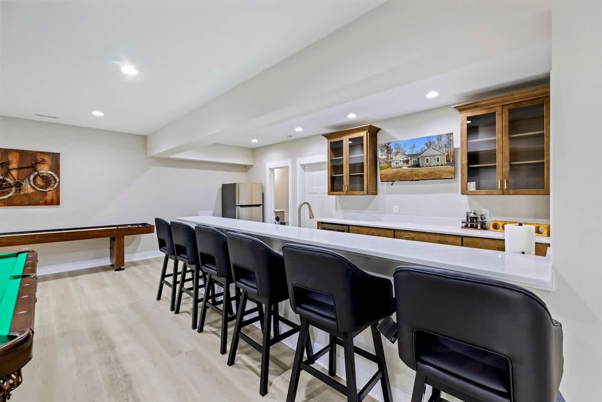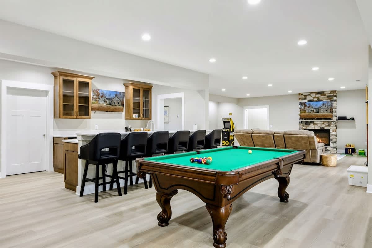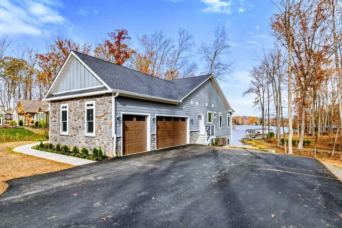 Experience comfort and luxury at our brand new and spacious lakefront home on the Private Side of Lake Anna. This beautiful home is located on a large lot in a quiet cove. You can swim, explore with kayaks, lay out on the dock's open deck area, or simply relax on the covered lounge area, enjoying the serene view of the beautiful lake! Roast some delicious s'mores outside using our outdoor fire pit, or have a BBQ using our grill on the deck. Enjoy the blue water views from atop of our massive deck. We have an open floor plan and offer 2 living areas including the main great room with a gas fireplace, and a lower level game room with pool table, ping pong table, shuffleboard, arcade game, xbox, and other games. Relax in the spacious main great room with water views through the huge bright windows, a gas fireplace, and 4K Smart TV. Use the High Speed Internet and free Wi-Fi network to stream your favorite shows while you FaceTime everyone! The home can sleep 16 with 4 bedroom suites including 2 King Suites, 1 Queen Suite, and a Bunk Bedroom Suite. The main floor has an open floor plan with a great room and adjacent large kitchen, dining area, primary suite (King bed), second bedroom suite (King bed), third bedroom suite (Queen bed), and laundry room. The lower level has the massive game room, and Bunk Bedroom Suite (4 Twin over Double Bunk beds).