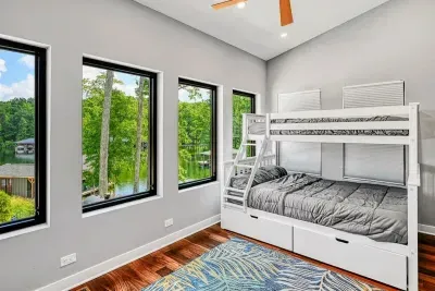 – Bedroom 4: Bunk bed with a Queen below and a Twin above; with sweeping lake views; connects to Bedroom 2 via interior hallway