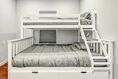 – Bedroom 3: Bunk bed with a Queen below and a Twin above; shares a Jack-and-Jill bathroom with Bedroom 2.